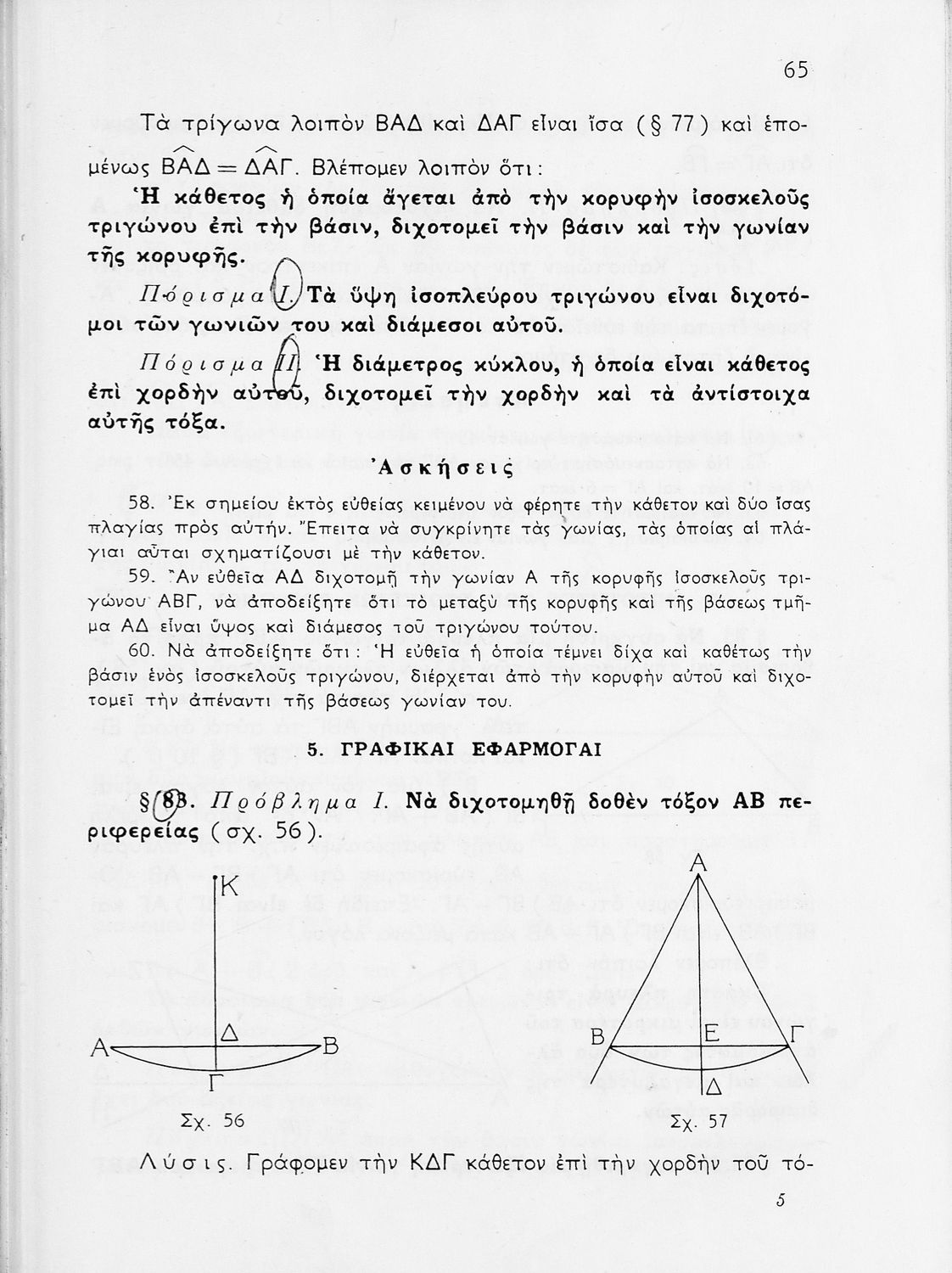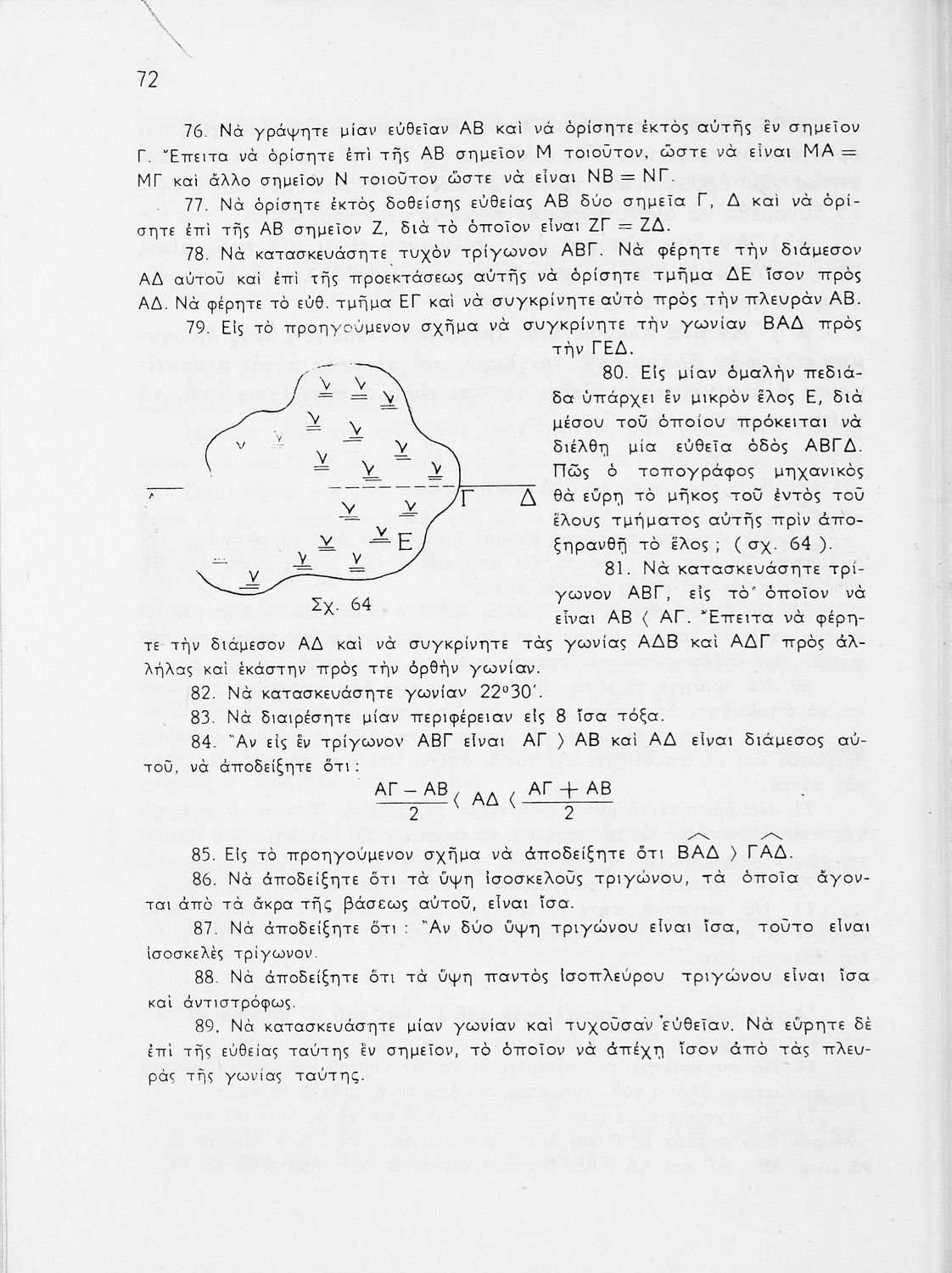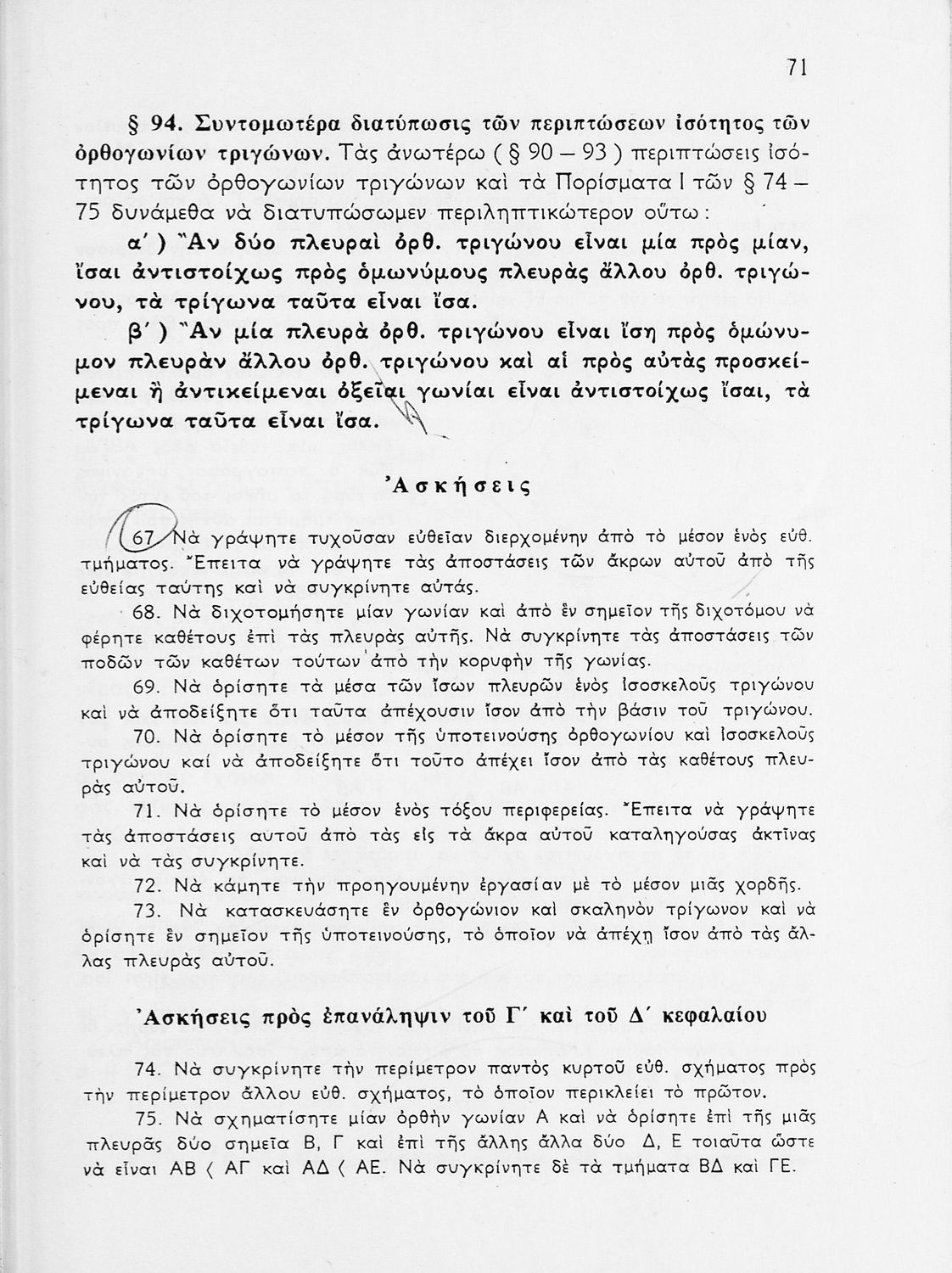 Σχολικό εγχειρίδιο Γεωμετρίας για τις Γ΄, Δ΄, Ε΄, ΣΤ΄ Γυμνασίου που περιλαμβάνει θεωρία και ασκήσεις και είναι χωρισμένο σε Επιπεδομετρία και Στερεομετρία. Φέρει το σύμβολο της δικτατορίας.