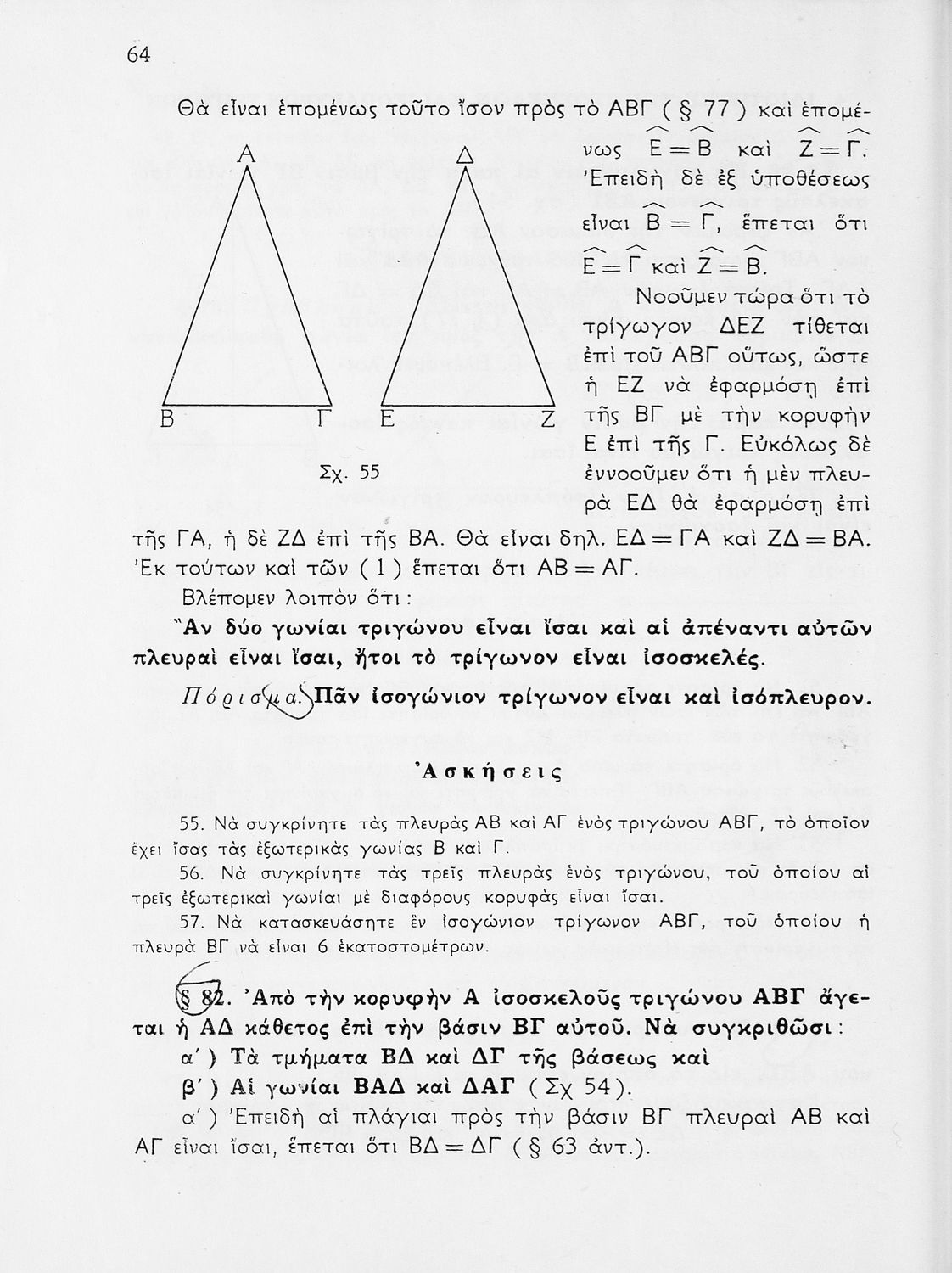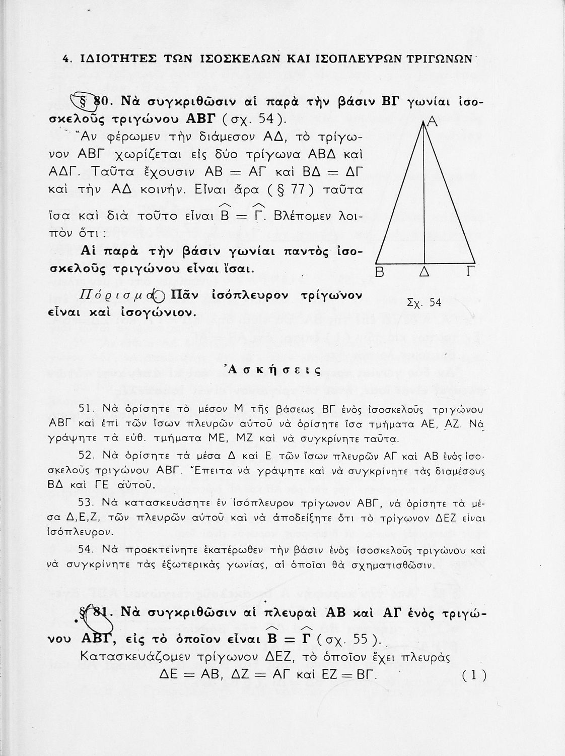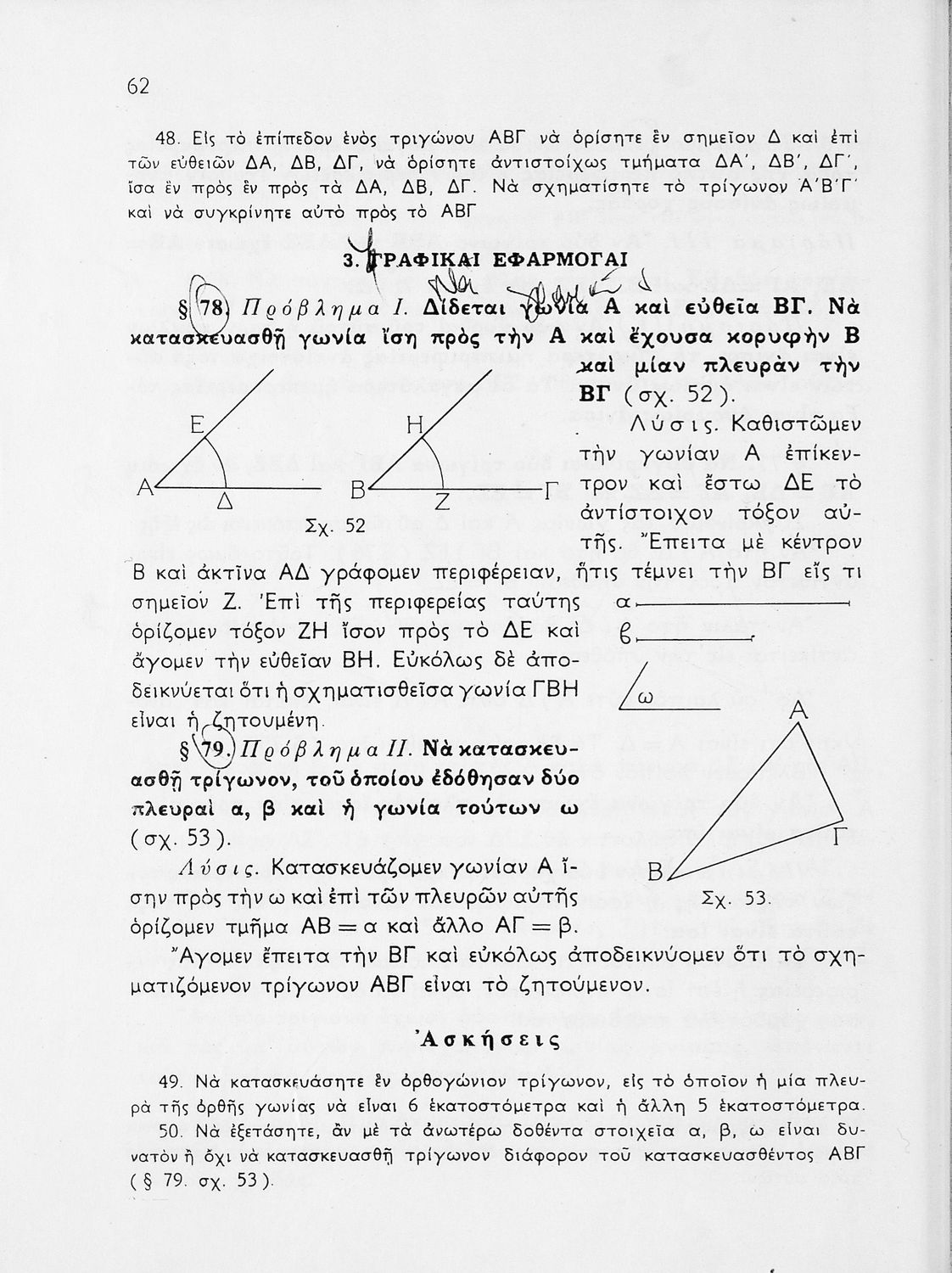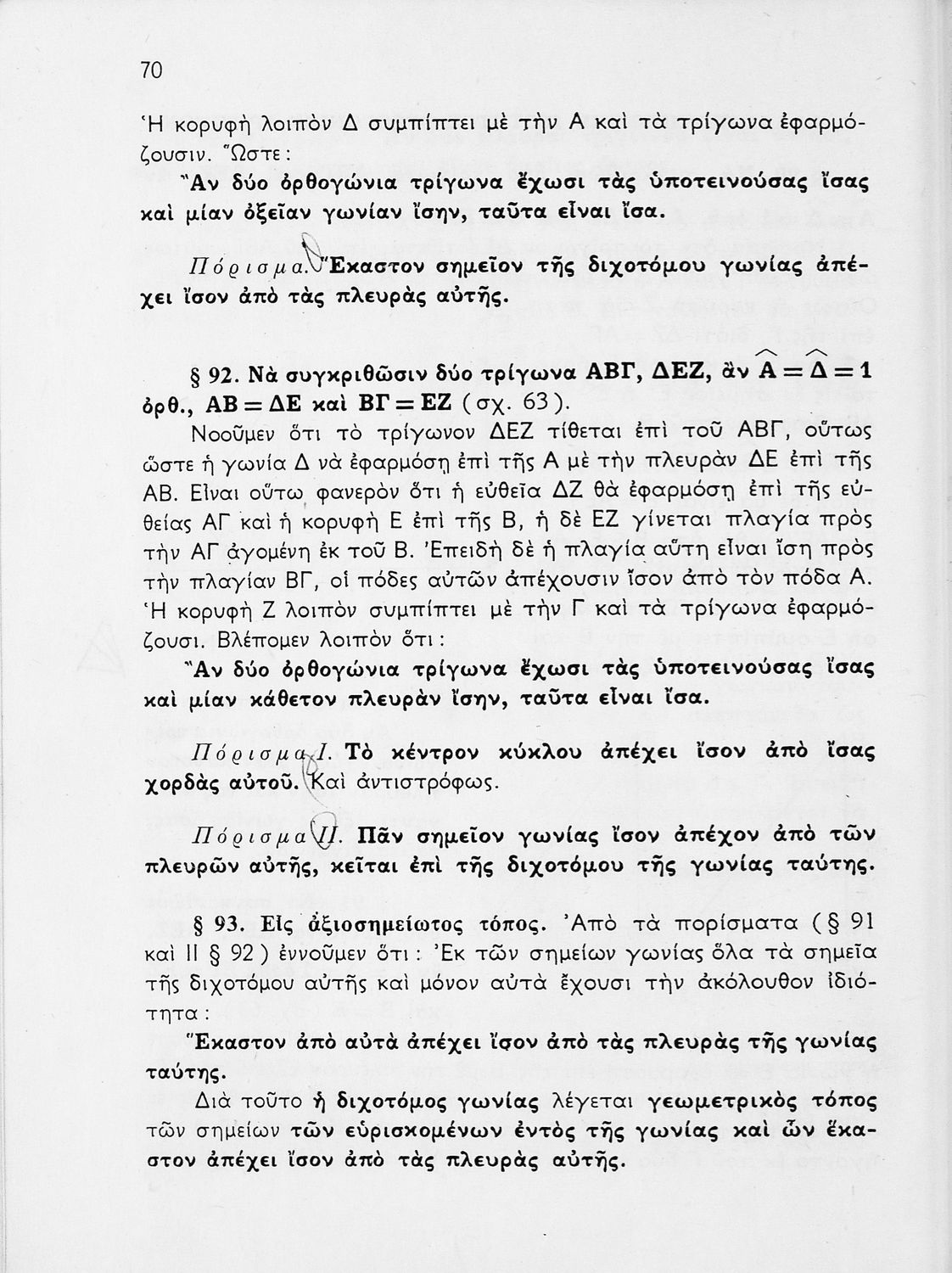 Σχολικό εγχειρίδιο Γεωμετρίας για τις Γ΄, Δ΄, Ε΄, ΣΤ΄ Γυμνασίου που περιλαμβάνει θεωρία και ασκήσεις και είναι χωρισμένο σε Επιπεδομετρία και Στερεομετρία. Φέρει το σύμβολο της δικτατορίας.