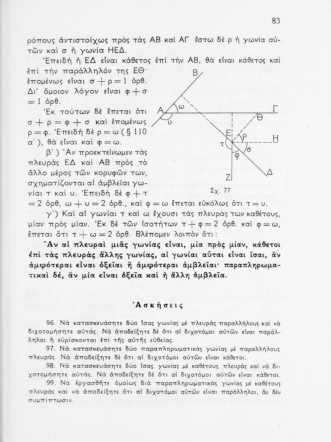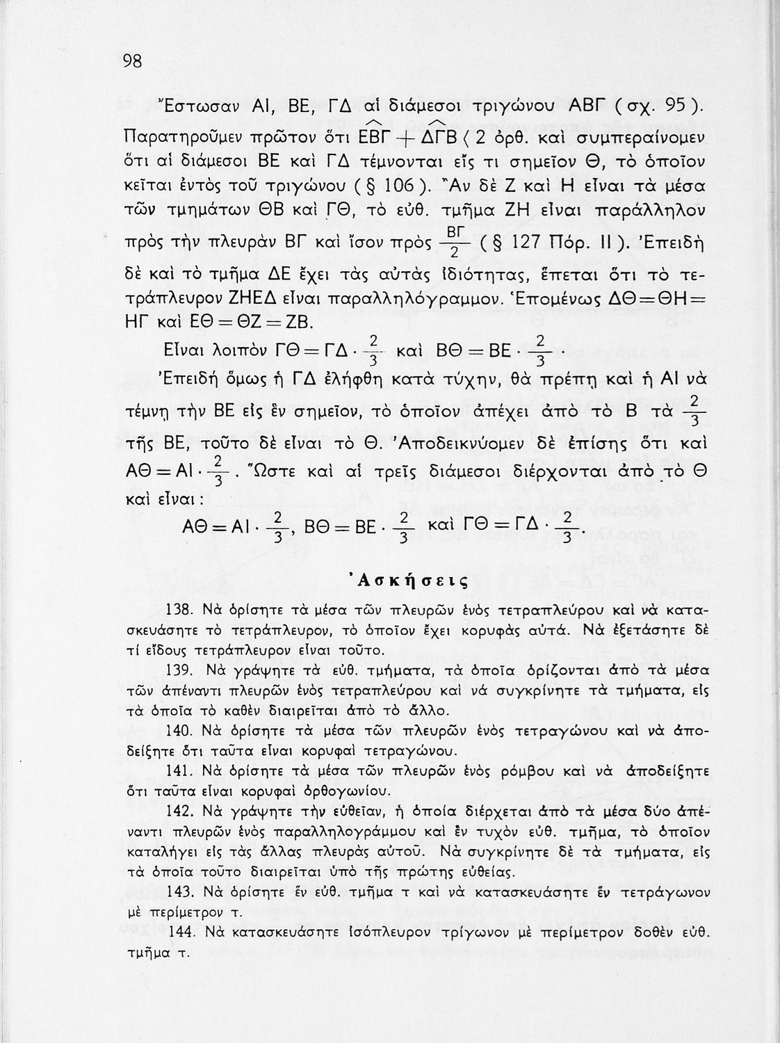 Σχολικό εγχειρίδιο Γεωμετρίας για τις Γ΄, Δ΄, Ε΄, ΣΤ΄ Γυμνασίου που περιλαμβάνει θεωρία και ασκήσεις και είναι χωρισμένο σε Επιπεδομετρία και Στερεομετρία.