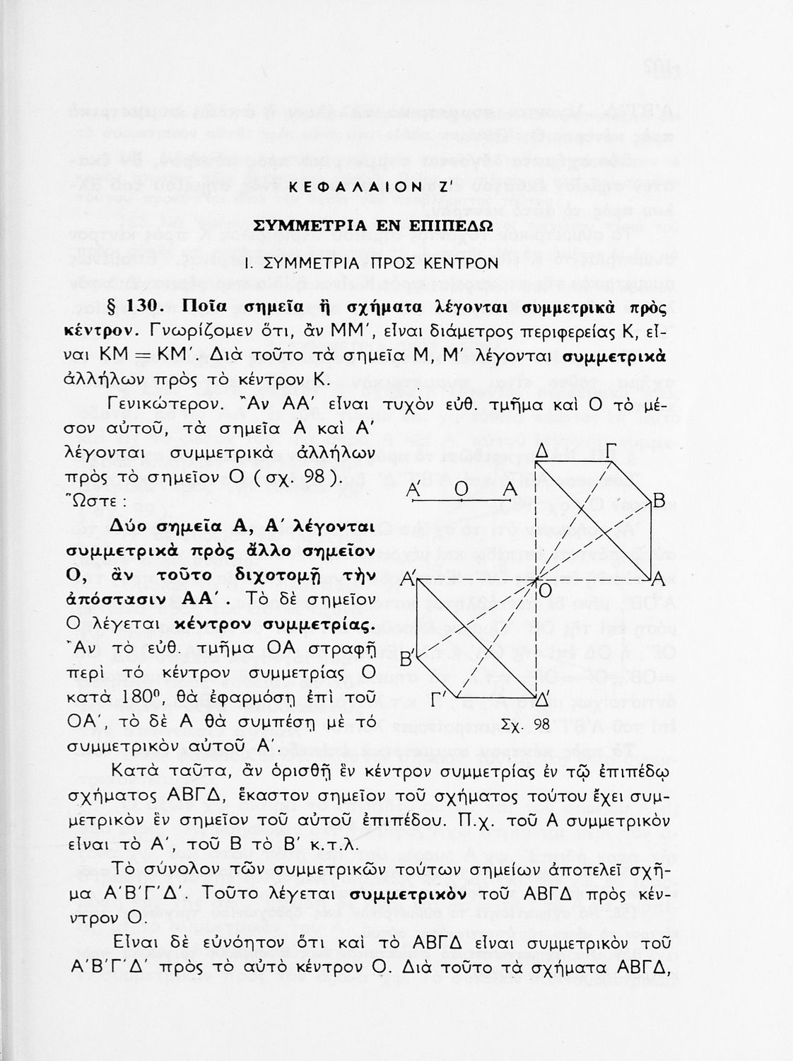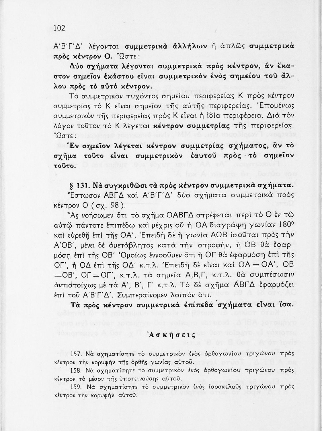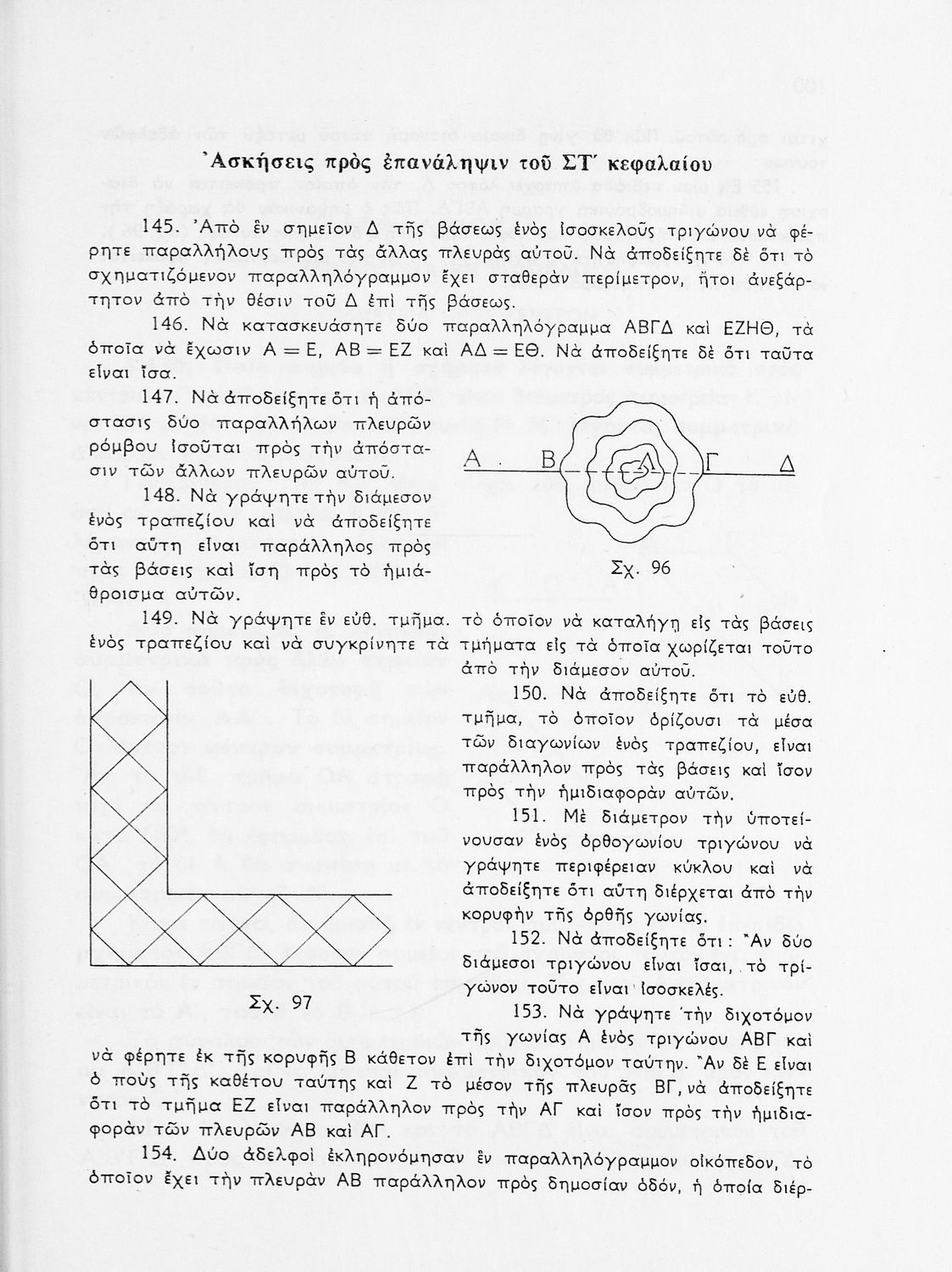 Σχολικό εγχειρίδιο Γεωμετρίας για τις Γ΄, Δ΄, Ε΄, ΣΤ΄ Γυμνασίου που περιλαμβάνει θεωρία και ασκήσεις και είναι χωρισμένο σε Επιπεδομετρία και Στερεομετρία. Φέρει το σύμβολο της δικτατορίας.