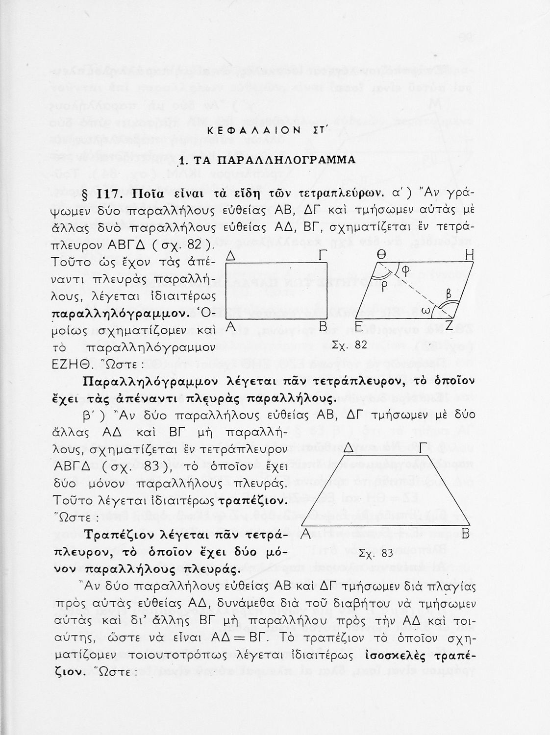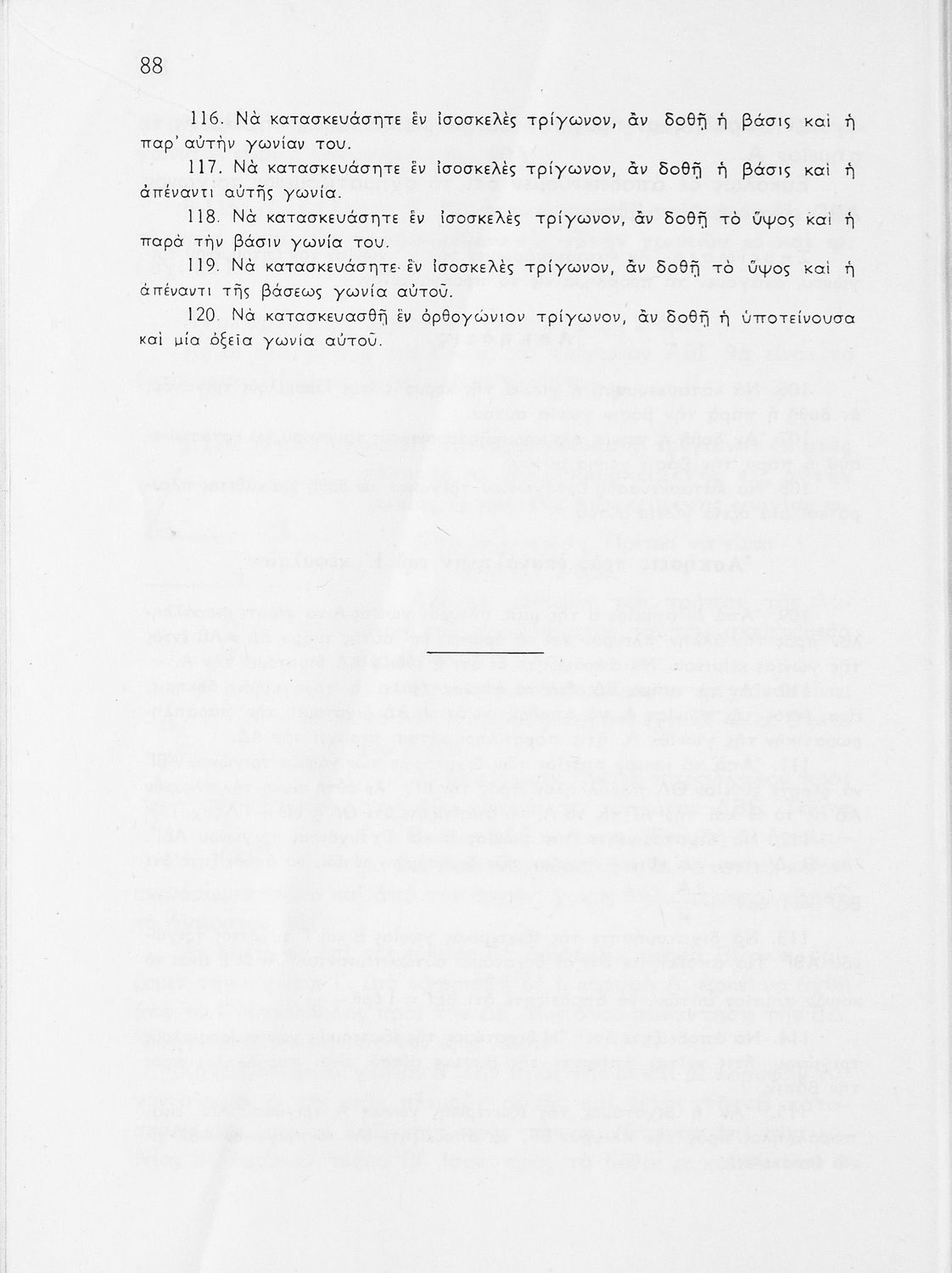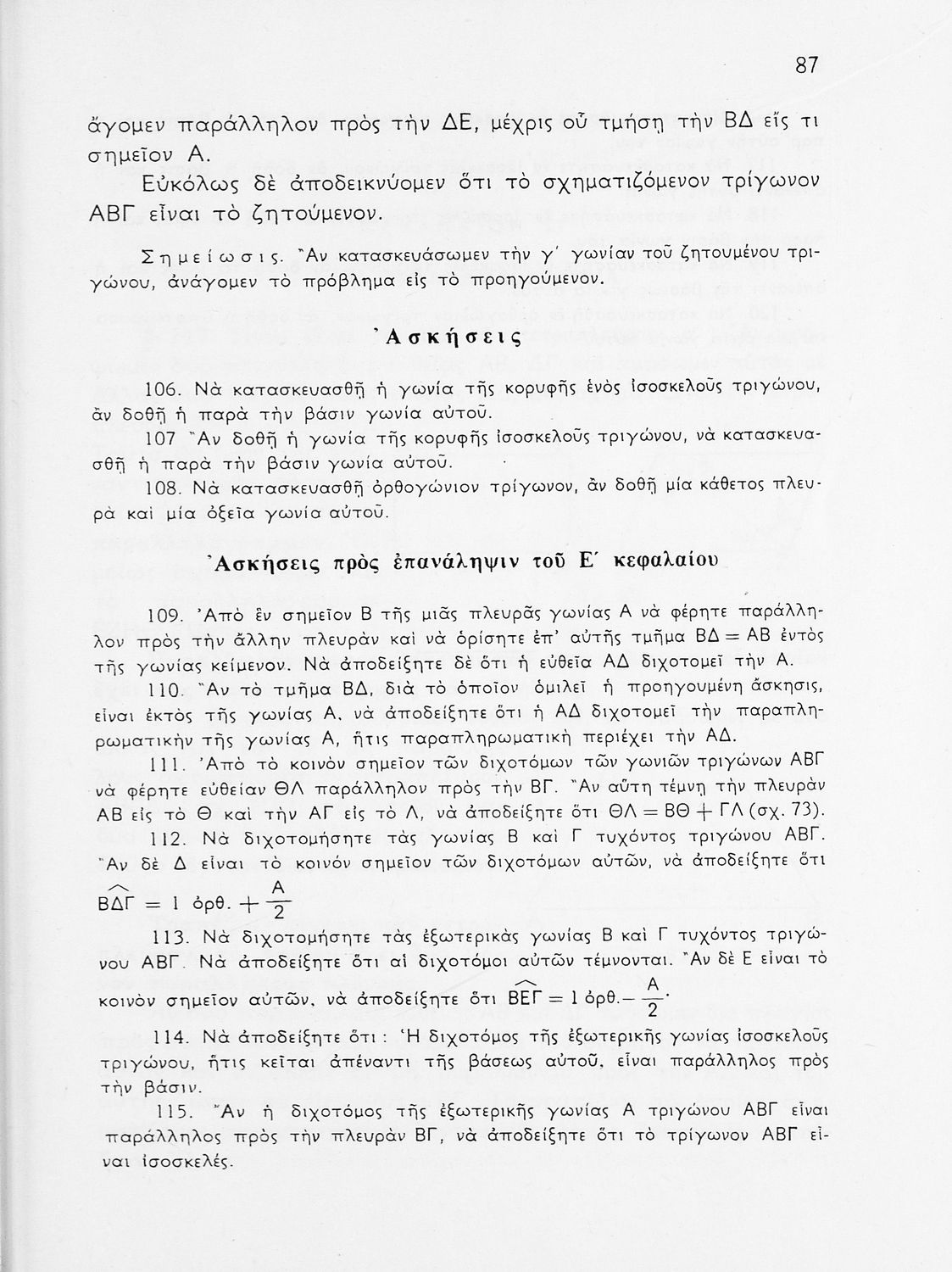 Σχολικό εγχειρίδιο Γεωμετρίας για τις Γ΄, Δ΄, Ε΄, ΣΤ΄ Γυμνασίου που περιλαμβάνει θεωρία και ασκήσεις και είναι χωρισμένο σε Επιπεδομετρία και Στερεομετρία. Φέρει το σύμβολο της δικτατορίας.