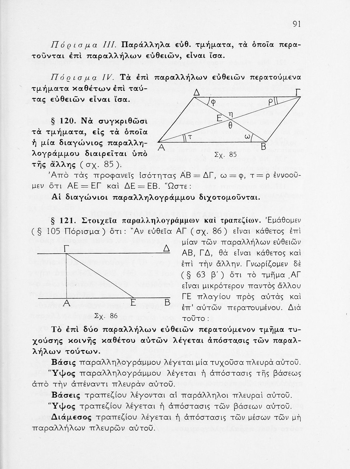 Σχολικό εγχειρίδιο Γεωμετρίας Α΄ Λυκείου χωρισμένο σε θεωρήματα, λυμένες ασκήσεις, ασκήσεις και επαναλήψεις κεφαλαίου. Περιέχει ένα παράρτημα με επαναληπτικά μαθήματα και ένα με ευρετήριο όρων.