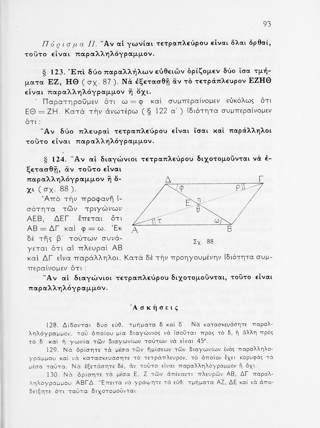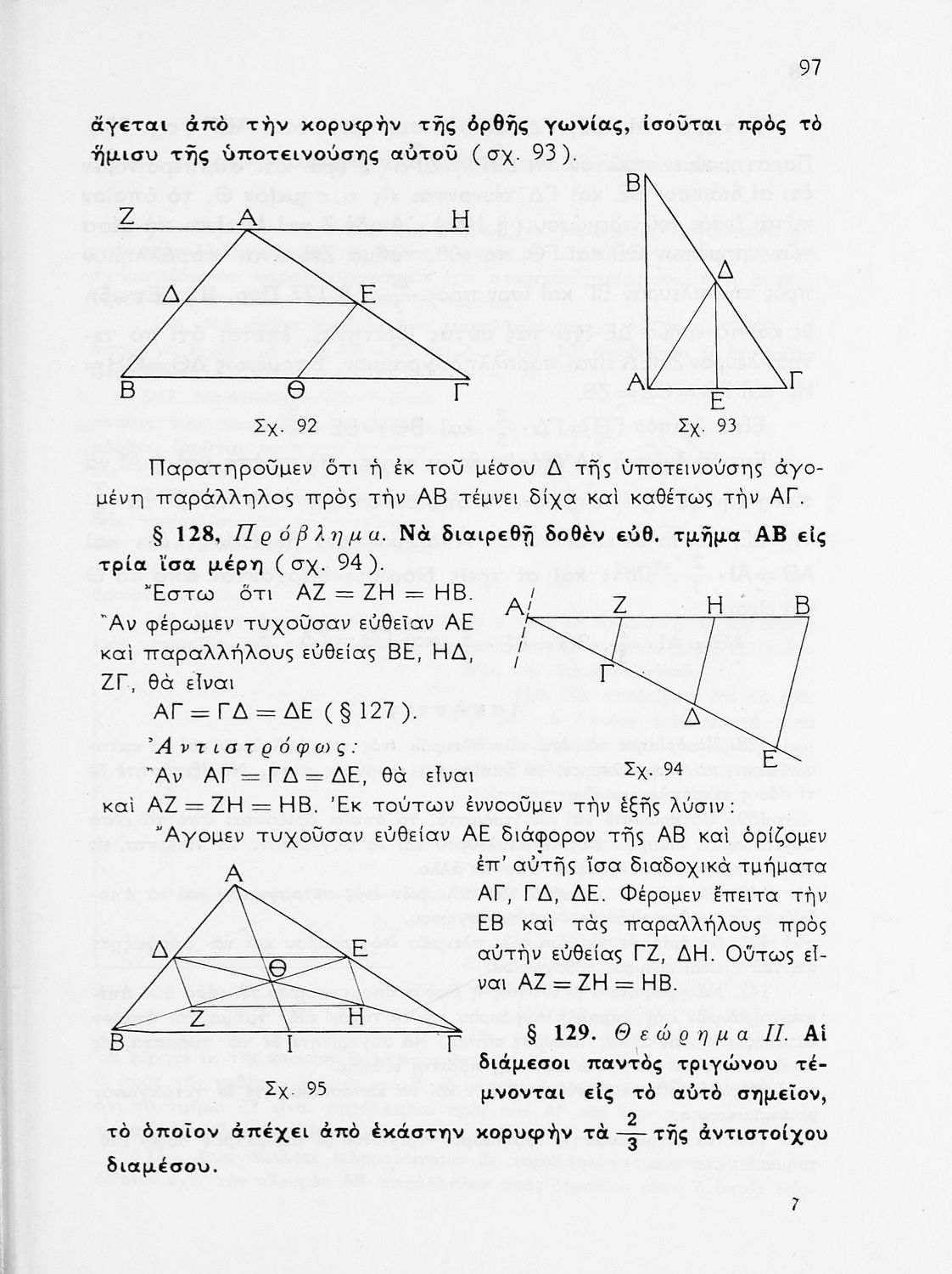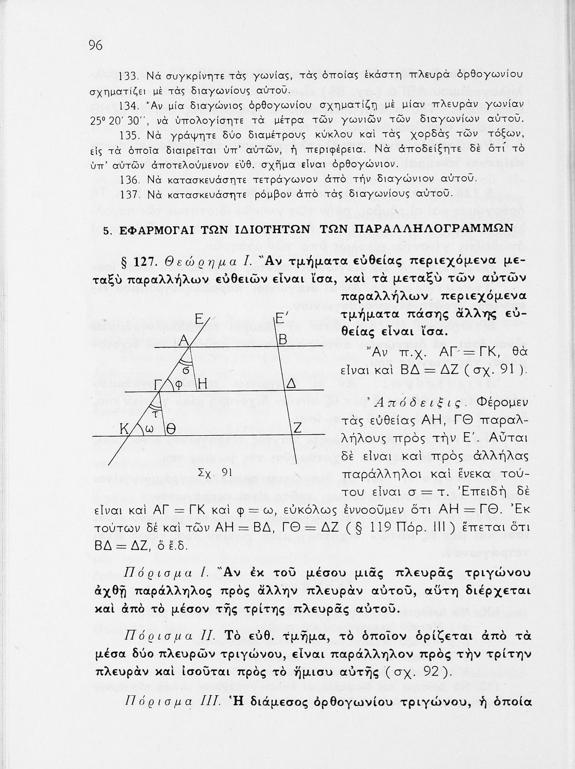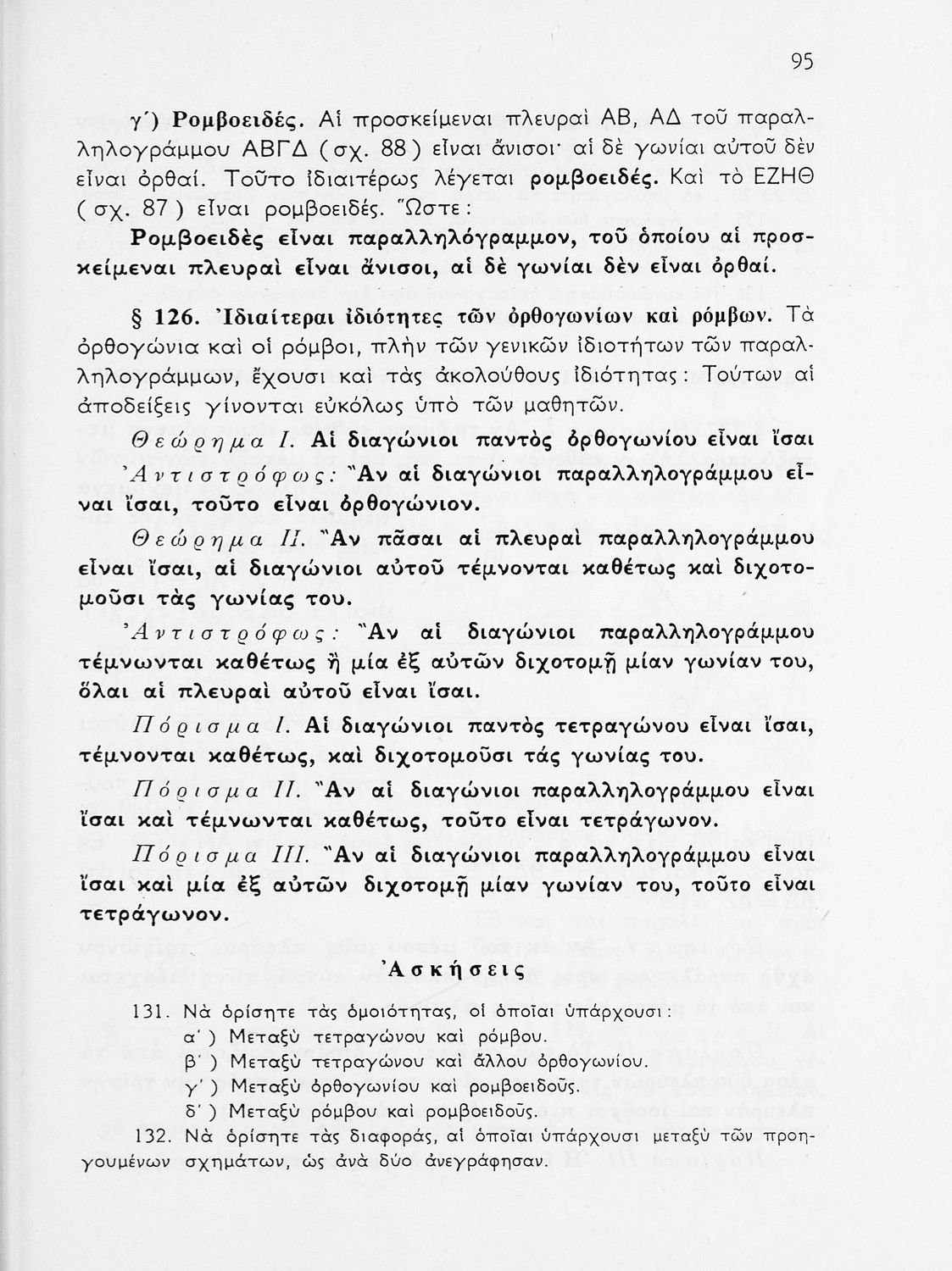 Σχολικό εγχειρίδιο Γεωμετρίας Γυμνασίου που είναι χωρισμένο σε θεωρήματα και ασκήσεις και εστιάζει στα βασικά θεωρήματα και ιδιότητες των γεωμετρικών σχημάτων. .