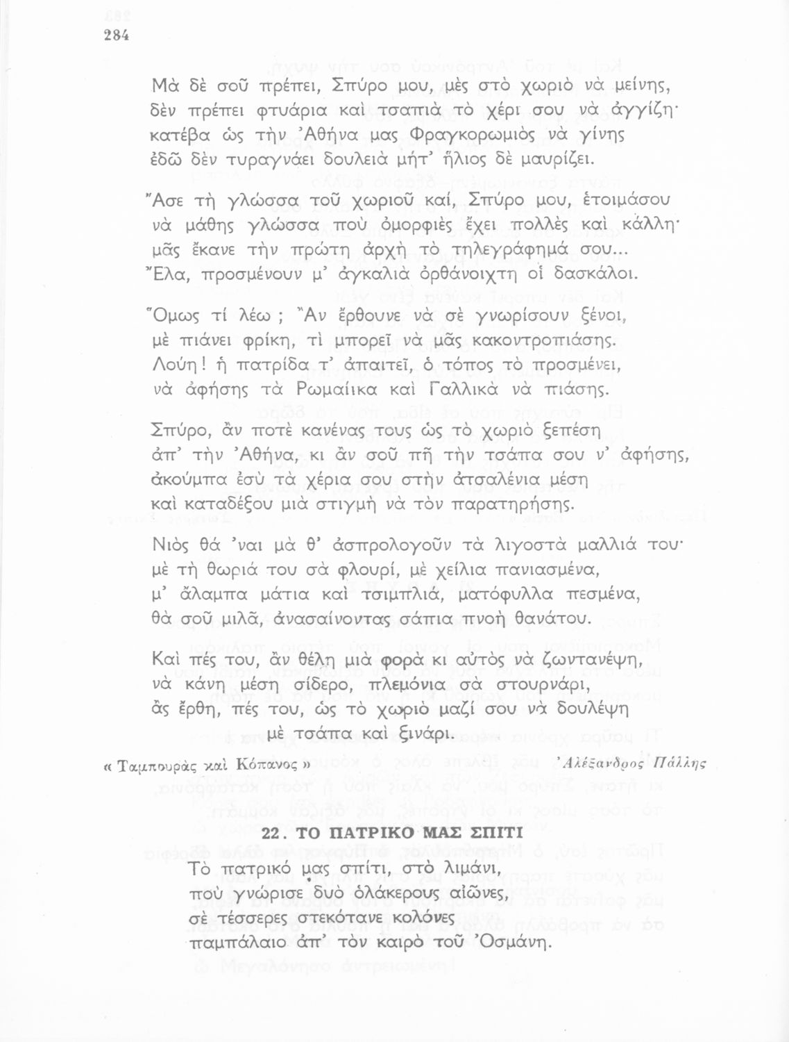 Σχολικό εγχειρίδιο Νέων Ελληνικών Ε΄ Γυμνασίου που περιέχει πεζά και ποιήματα συγγραφέων της βυζαντινής και μεταβυζαντινής περιόδου πατριωτικού και θρησκευτικού περιεχομένου. Περιλαμβάνει και κείμενα Ελλήνων συγγραφέων και δημοτικά τραγούδια πατριωτικού περιεχομένου και παράρτημα με βιογραφίες των συγγραφέων και λεξιλόγιο.
