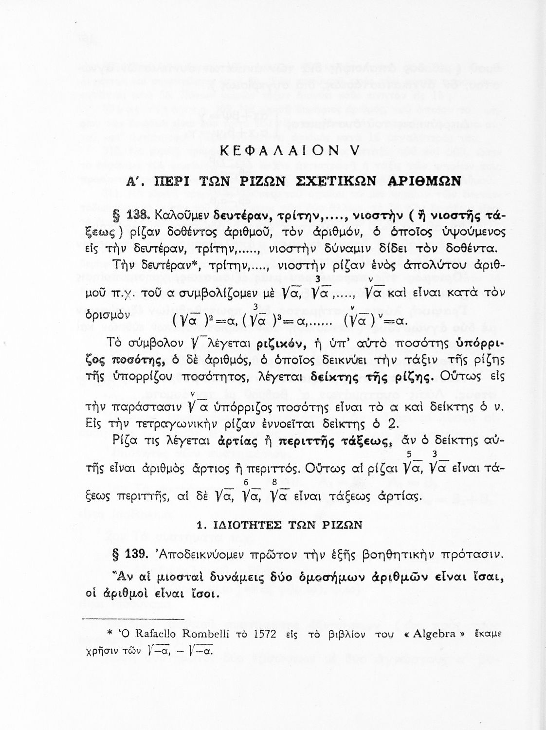 Σχολικό εγχειρίδιο Άλγεβρας Δ΄ Γυμνασίου που εστιάζει στις ιδιότητες των αριθμών, στις εξισώσεις, στους λογάριθμους και στις παραγώγους. Ο συγγραφέας ήταν καθηγητής στο Πανεπιστήμιο. Φέρει το σύμβολο της ...