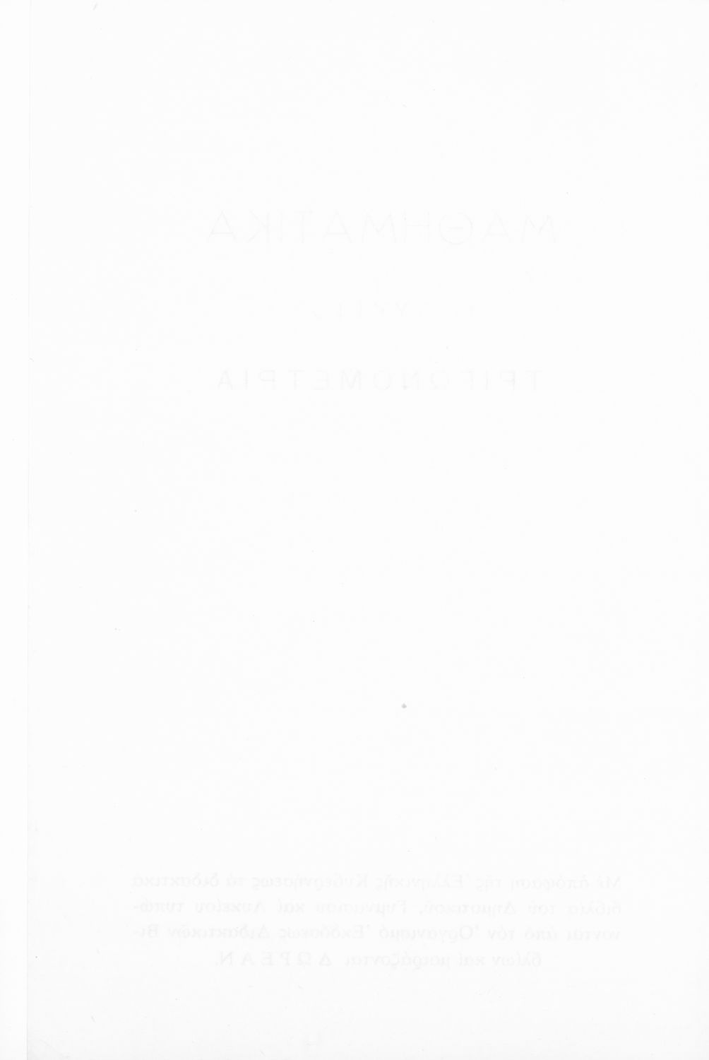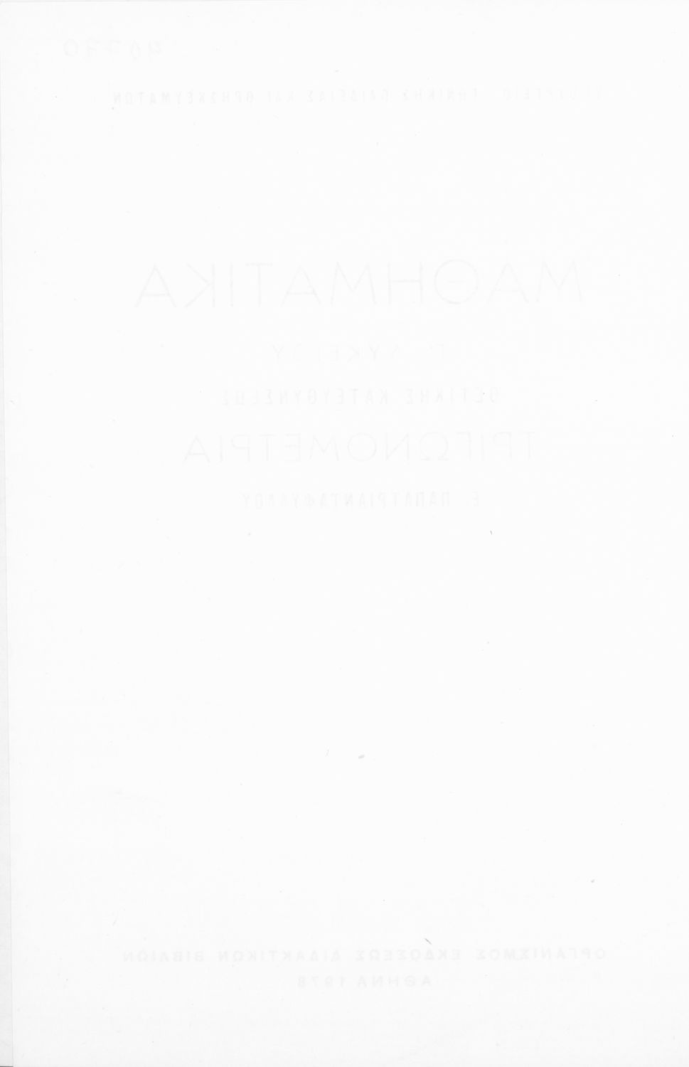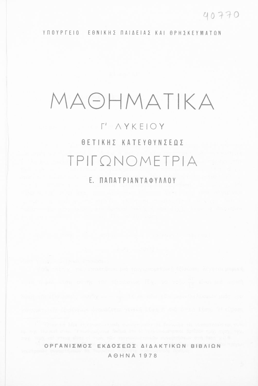 Κωδικός αναγνώρισης: 01-40770 Τίτλος: Μαθηματικά Γ΄ Λυκείου θετικής κατευθύνσεως τριγωνομετρία Συγγραφέας: Ε. Παπατριανταφύλλου Μέγεθος και υπόστρωμα: Σχολικό εγχειρίδιο, 23εκ., μαλακό εξώφυλλο, 123 σελίδες. Σκίτσα (ασπρόμαυρα). |