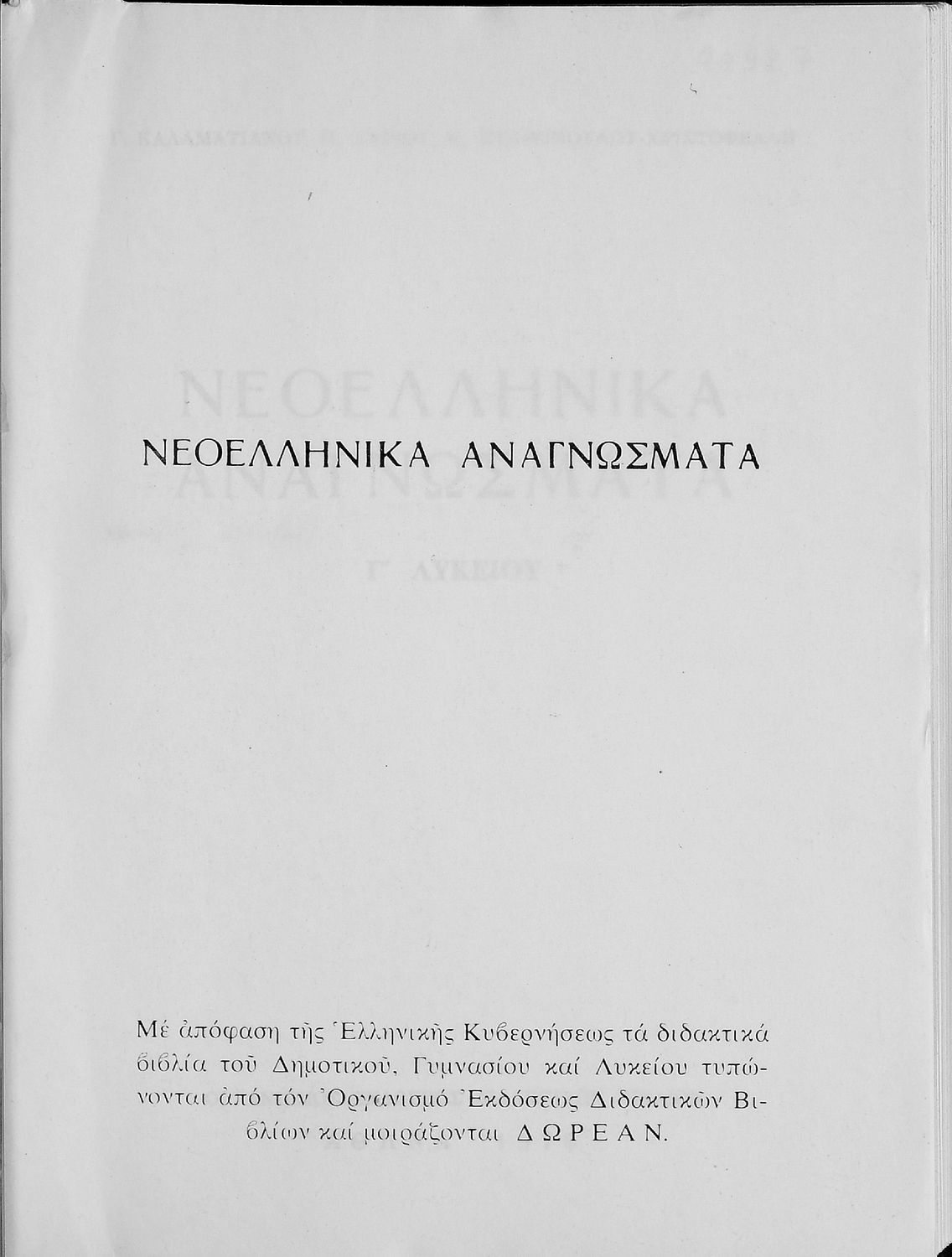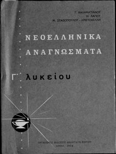 Βαθμίδα εκπαίδευσης: Δευτεροβάθμια Τάξη: Γ' Λυκείου Μάθημα: Νέα Ελληνικά Γλώσσα: Δημοτική, Καθαρεύουσα Παρουσίαση περιεχομένου: Σχολικό εγχειρίδιο Νέων Ελληνικών για τη Γ' Λυκείου με κείμενα και ποιήματα Ελλήνων και ξένων λογοτεχνών και ποιητών. Στο πρώτο μέρος έχει κείμενα από την εθνική ζωή του τόπου, την επιστήμη και τη φιλοσοφία. Το δεύτερο μέρος αποτελείται από ποιήματα επικά και επικολυρικά ενώ στο επίμετρο του συγγράμματος υπάρχουν κείμενα της αττικίζουσας βυζαντινής λογοτεχνίας και της ξένης λογοτεχνίας. |