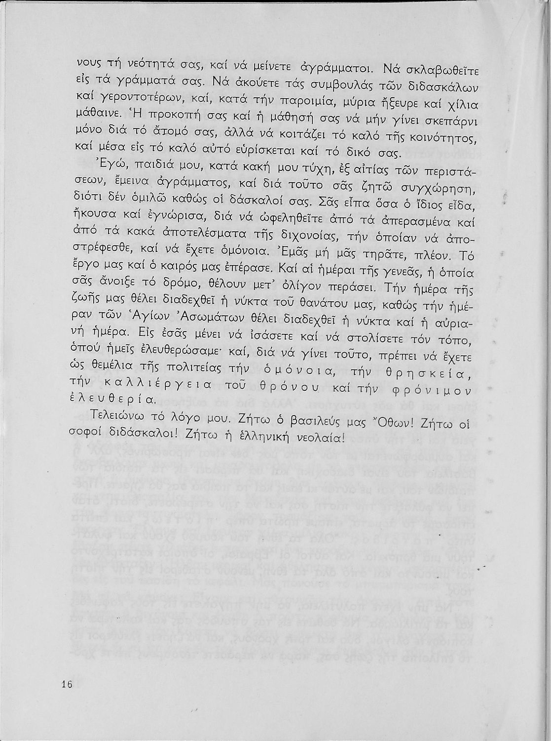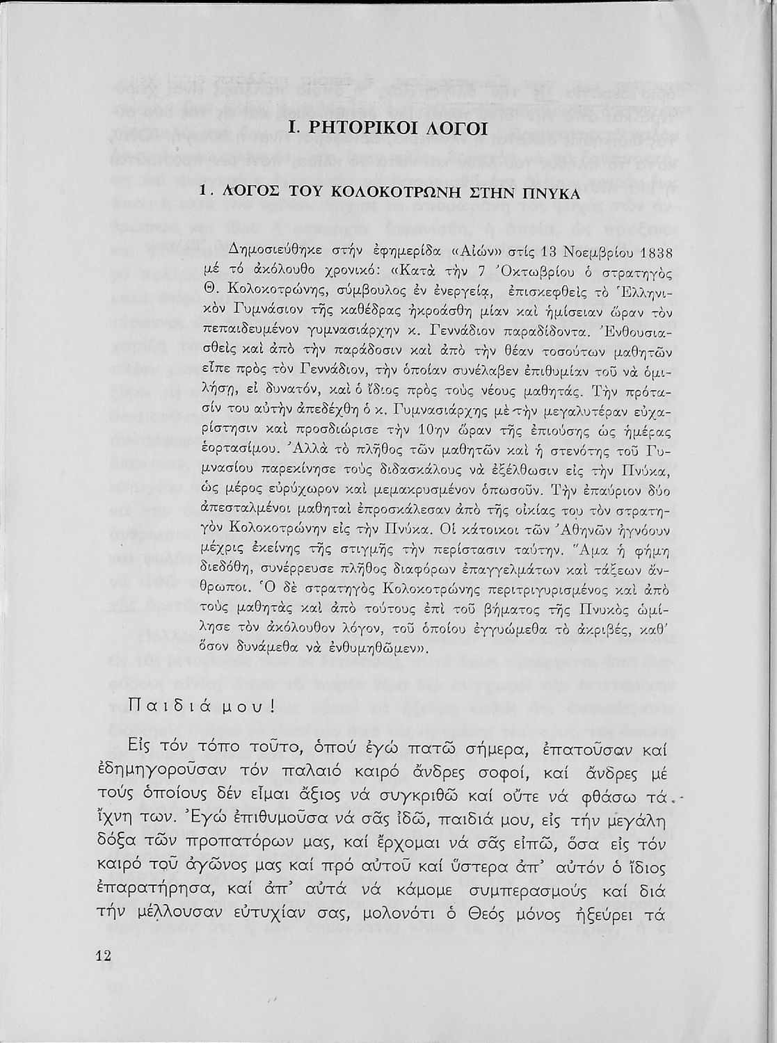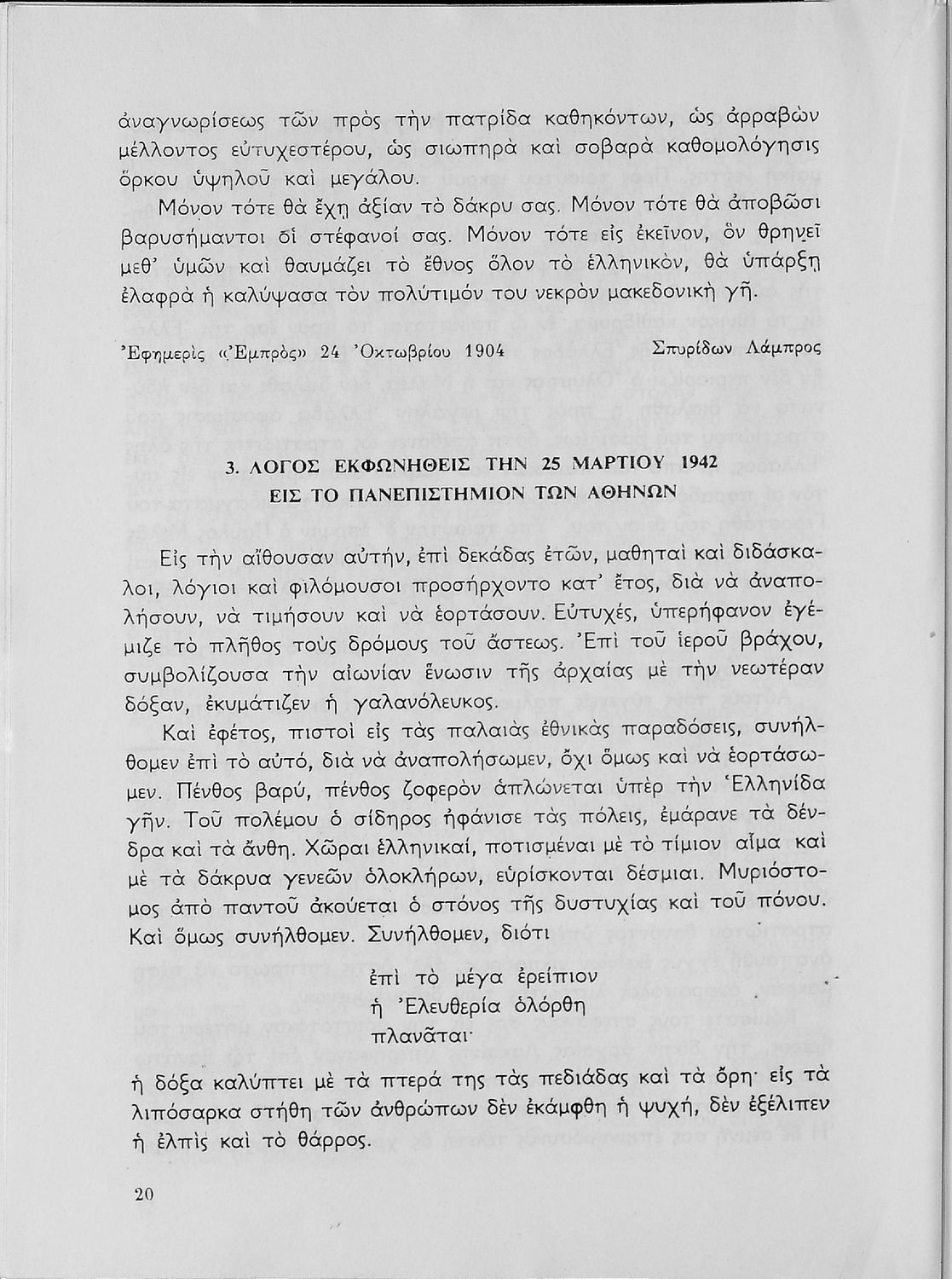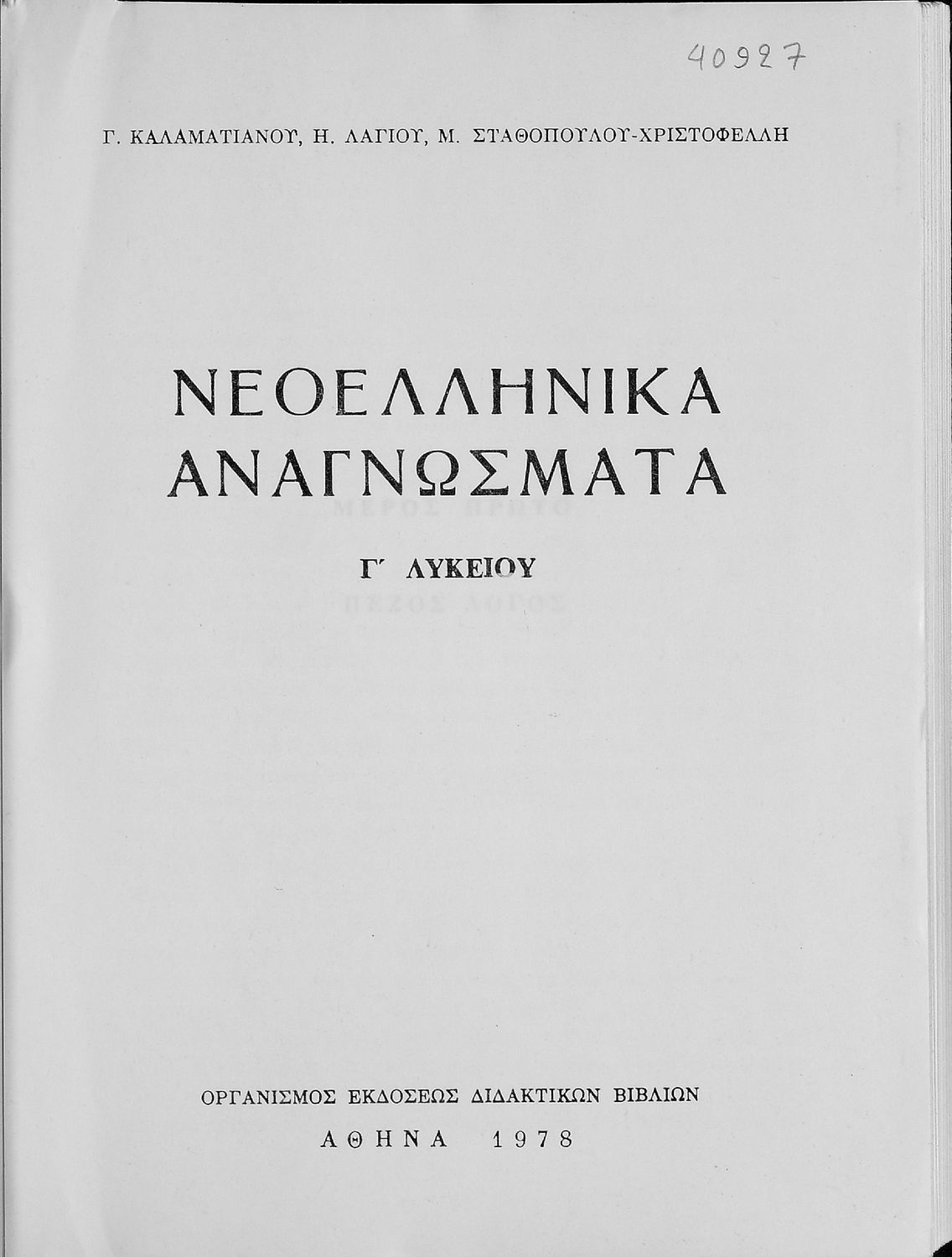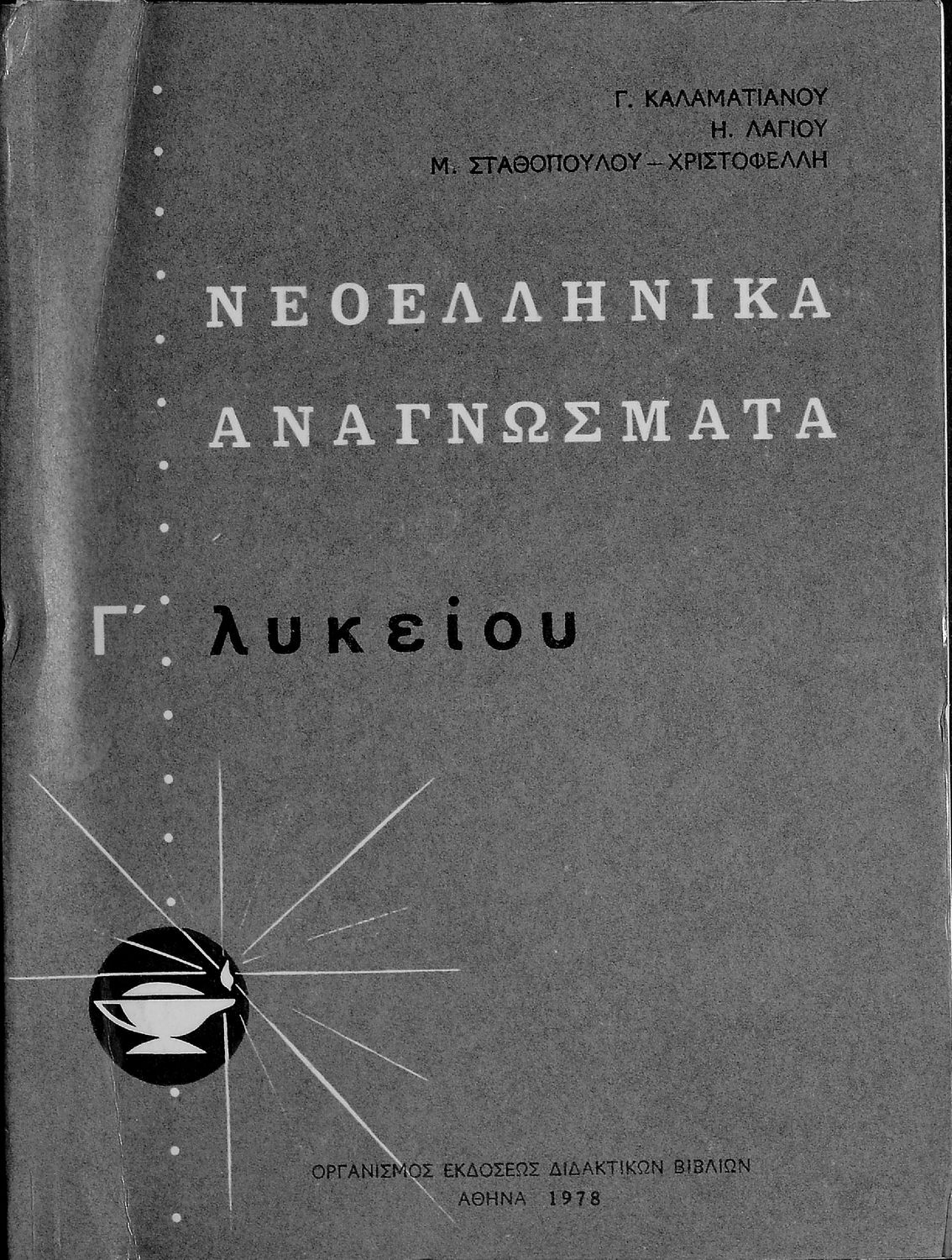 Σχολικό εγχειρίδιο Νέων Ελληνικών για τη Γ' Λυκείου με κείμενα και ποιήματα Ελλήνων και ξένων λογοτεχνών και ποιητών. Στο πρώτο μέρος έχει κείμενα από την εθνική ζωή του τόπου, την επιστήμη και τη φιλοσοφία. Το δεύτερο μέρος αποτελείται από ποιήματα επικά και επικολυρικά ενώ στο επίμετρο του συγγράμματος υπάρχουν κείμενα της αττικίζουσας βυζαντινής λογοτεχνίας και της ξένης λογοτεχνίας.