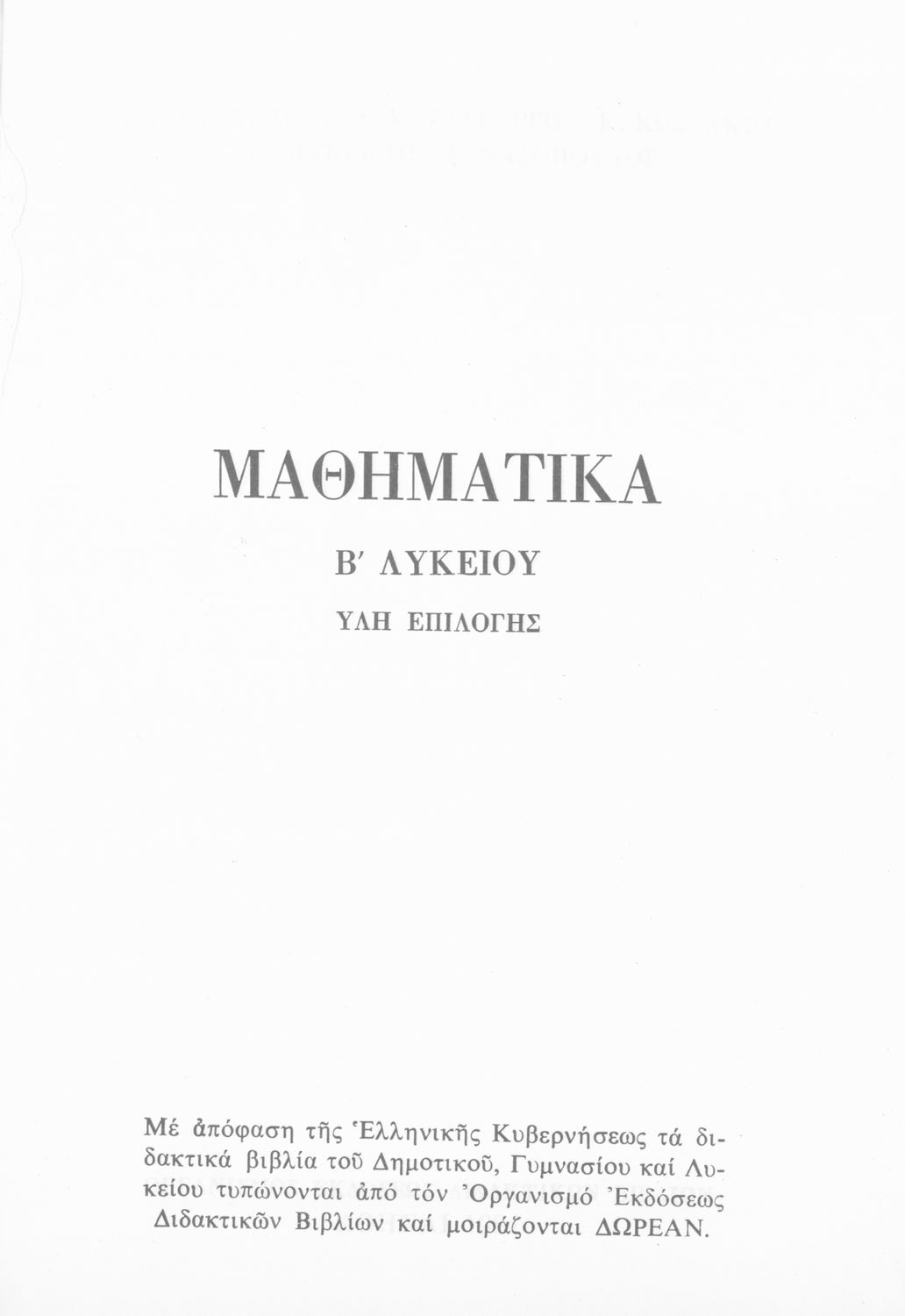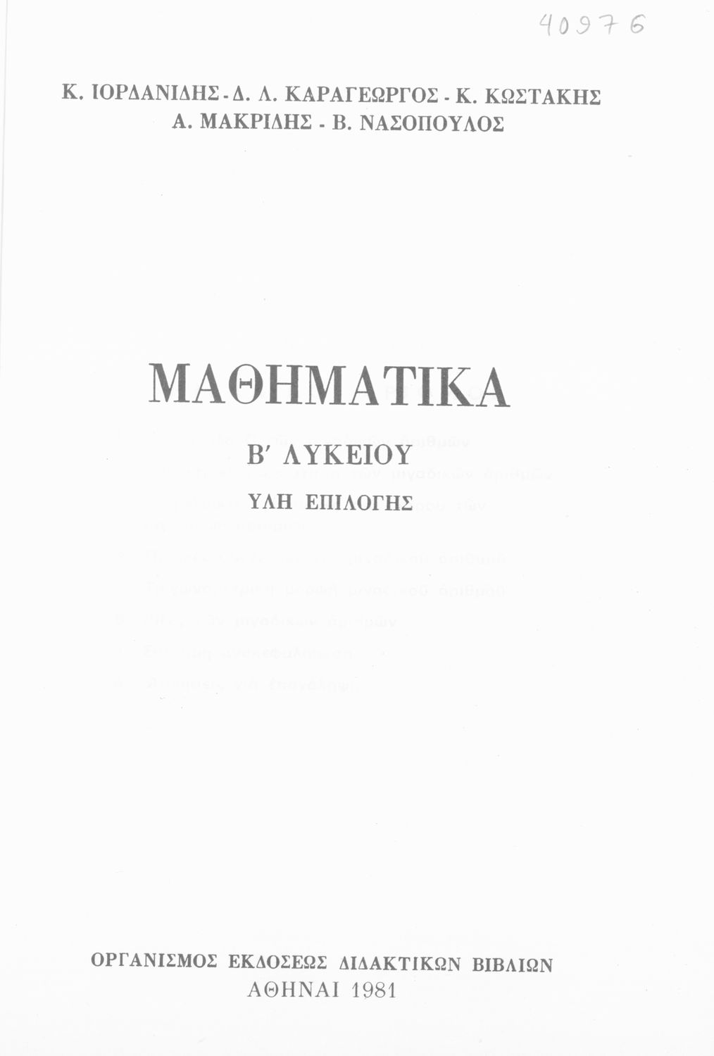 Κωδικός αναγνώρισης: 01-40976 Τίτλος: Μαθηματικά Β΄ Λυκείου ύλη επιλογής Συγγραφέας: Κ. Ιορδανίδης, Δ. Λ. Καραγεώργος, Κ. Κωστάκης, Α. Μακρίδης, Β. Νασόπουλος Μέγεθος και υπόστρωμα: Σχολικό εγχειρίδιο, 23εκ., μαλακό εξώφυλλο, 200 σελίδες. |