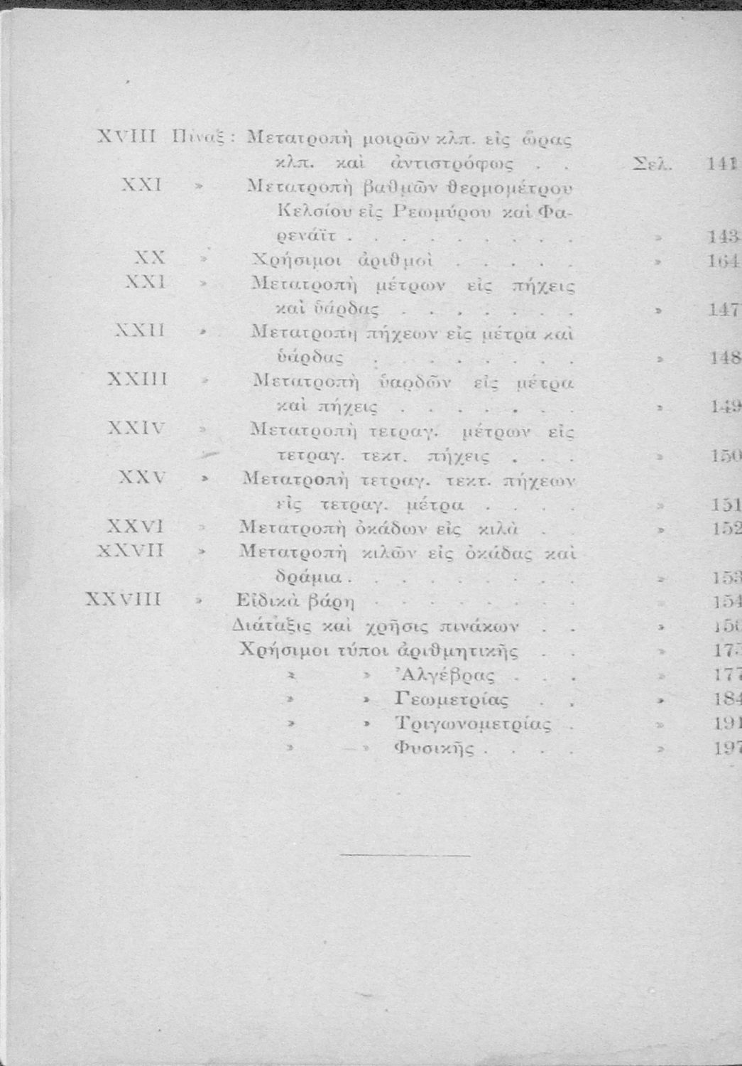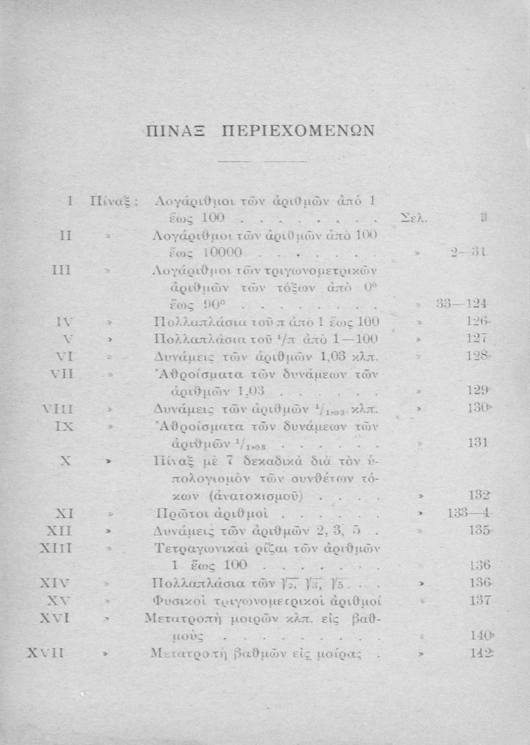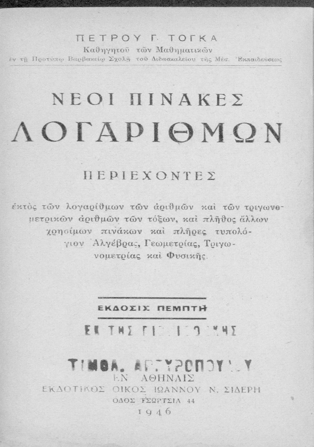 Παρουσίαση περιεχομένου: Μαθητικό βοήθημα που περιέχει πίνακες με λογαριθμικούς και τριγωνομετρικούς αριθμούς των τόξων, πίνακες δυνάμεων και πίνακες μετατροπών.