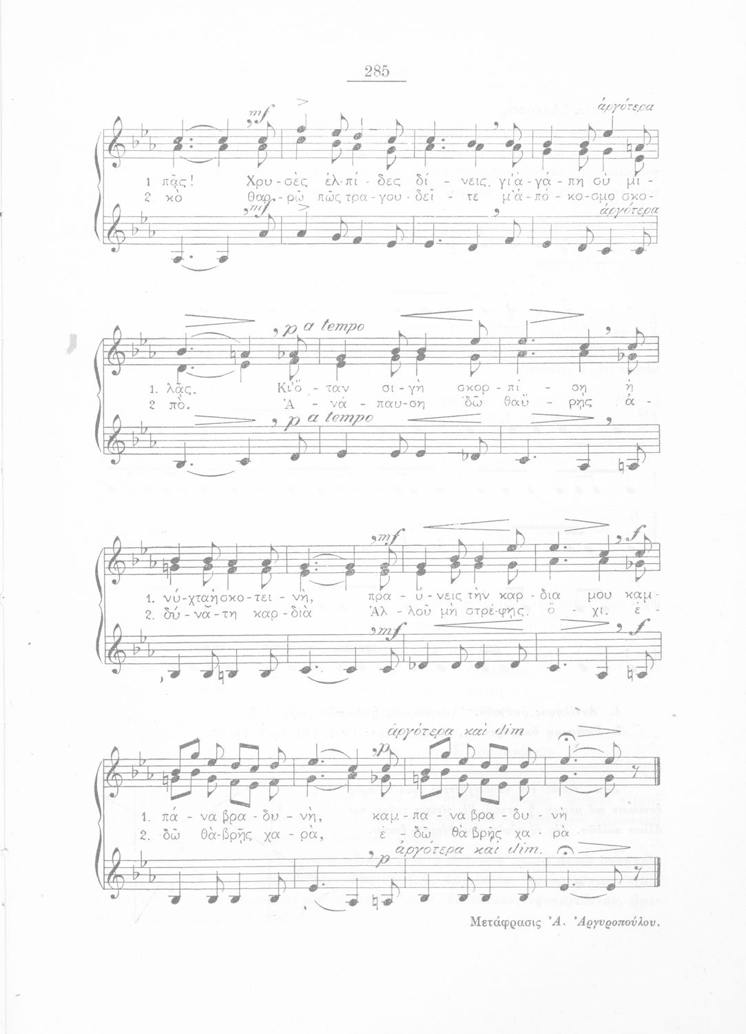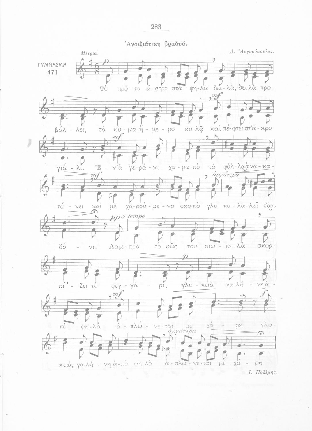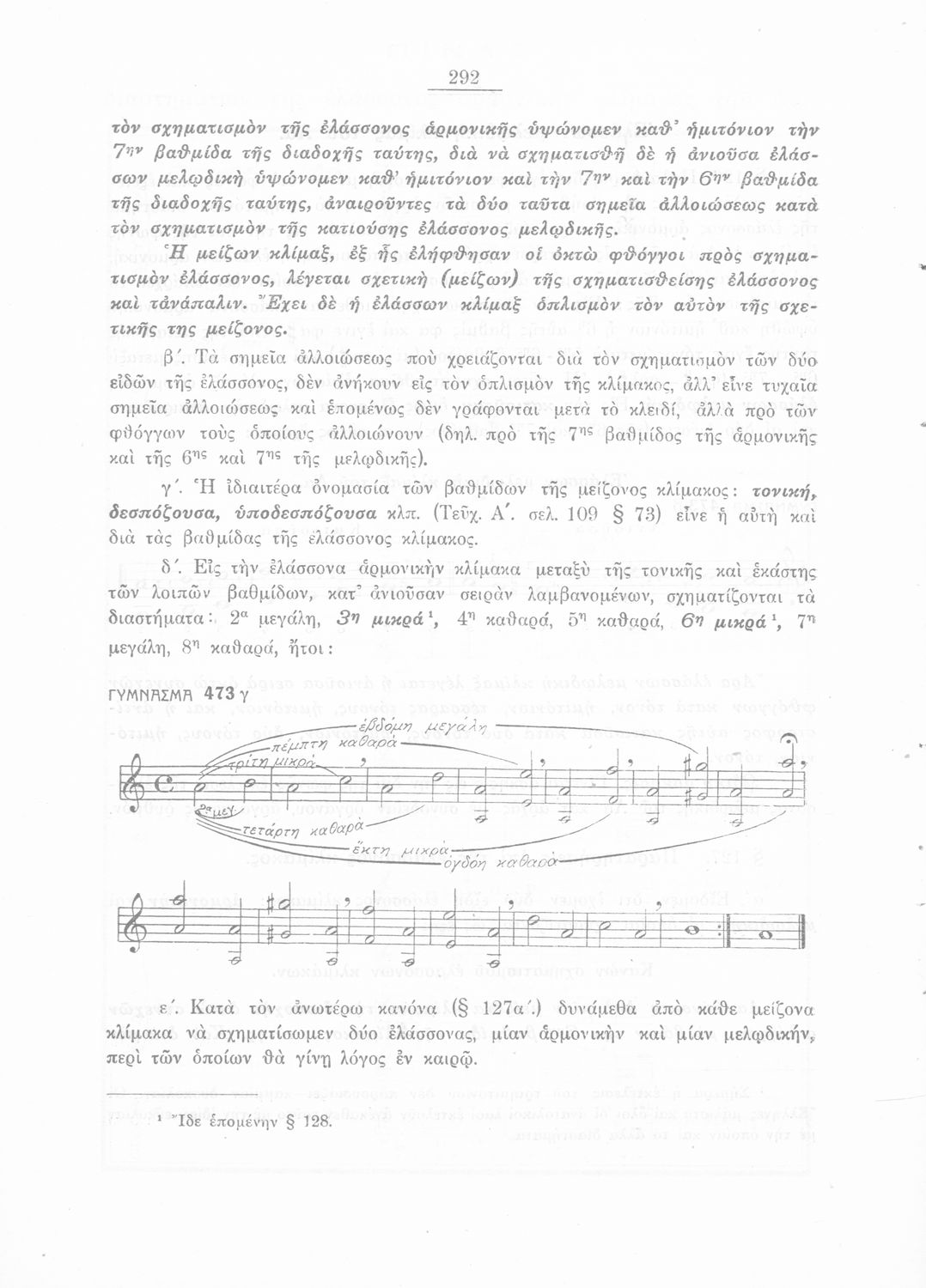 Σχολικό εγχειρίδιο Μουσικής για την Β' τάξη Εξαταξίων και Γ', Δ' τάξη Οκταταξίων σχολείων Μέσης Εκπαιδεύσεως. Περιέχει μείζονες κλίμακες και αλλοιωμένους φθόγγους, μελωδικές ασκήσεις και δίφωνες μελωδικές ...