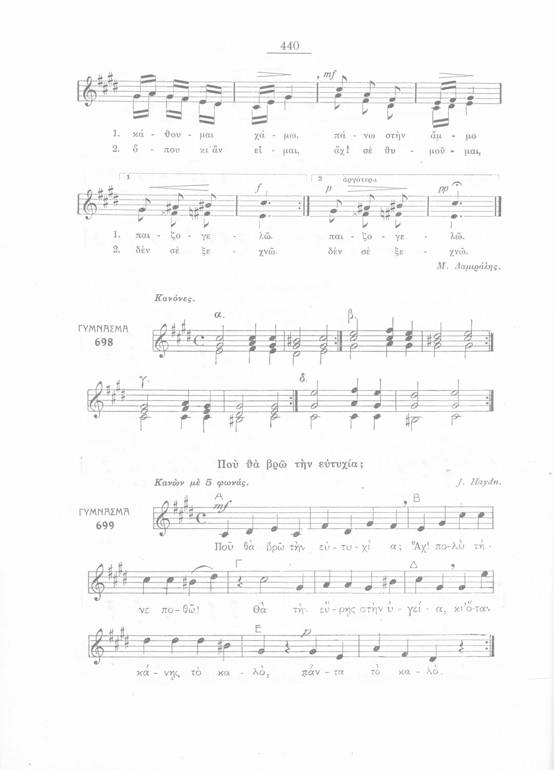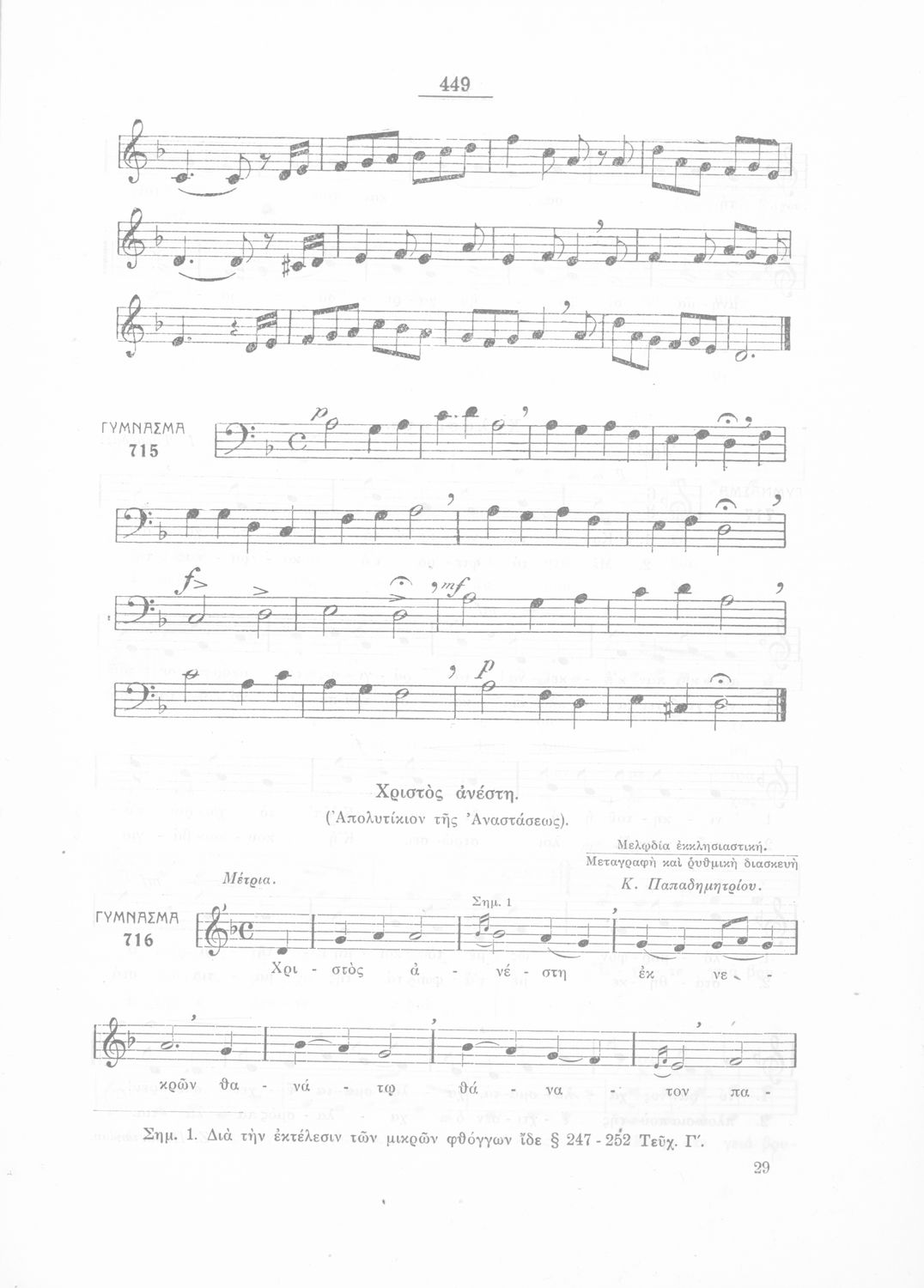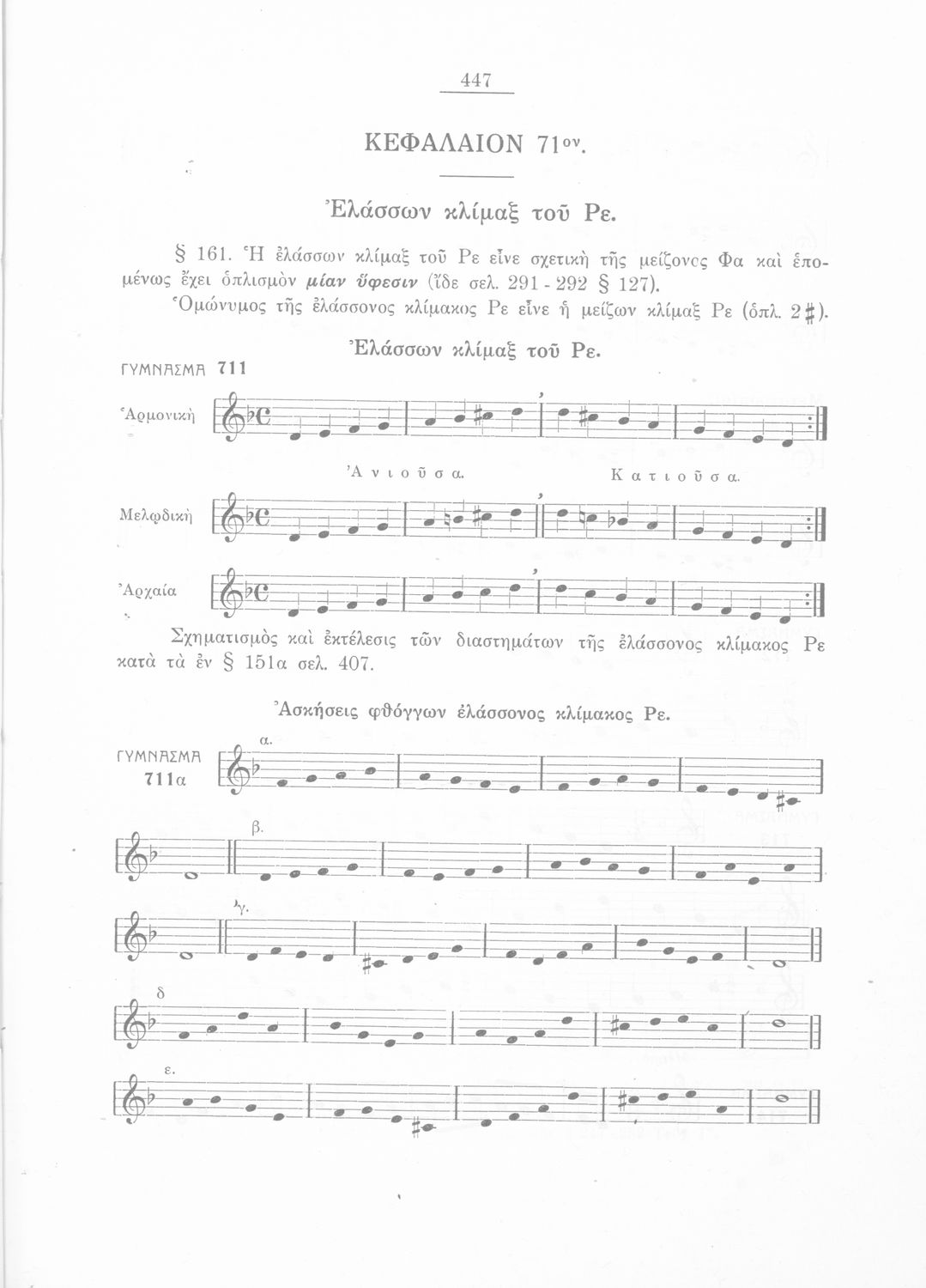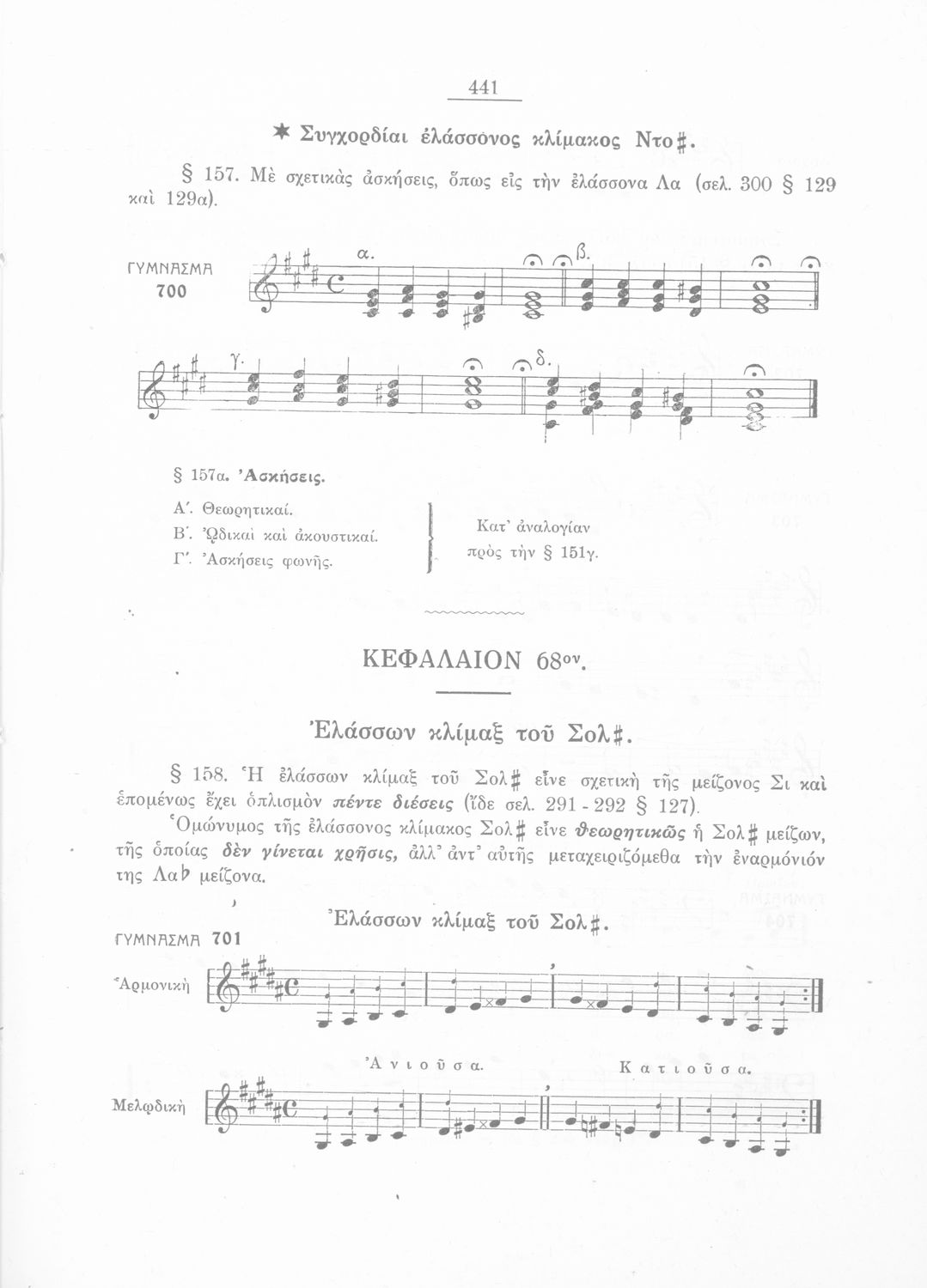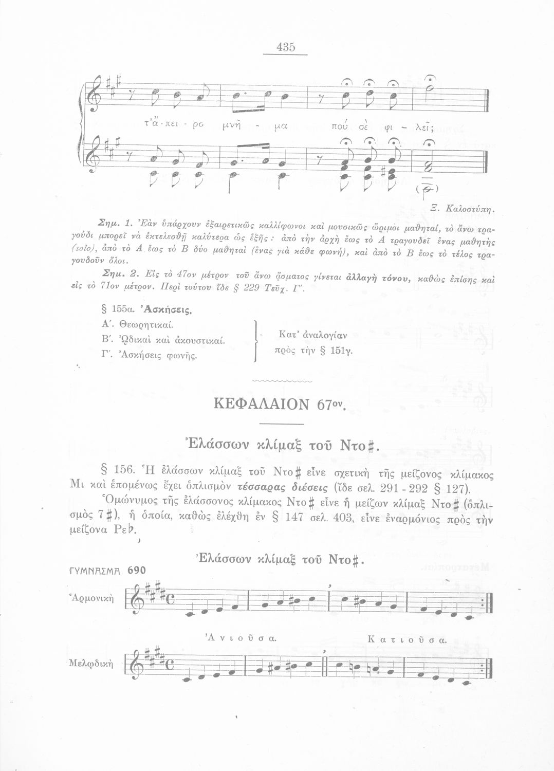 Σχολικό εγχειρίδιο Μουσικής για την Β' τάξη Εξαταξίων και Γ', Δ' τάξη Οκταταξίων σχολείων Μέσης Εκπαιδεύσεως. Περιέχει μείζονες κλίμακες και αλλοιωμένους φθόγγους, μελωδικές ασκήσεις και δίφωνες μελωδικές ...