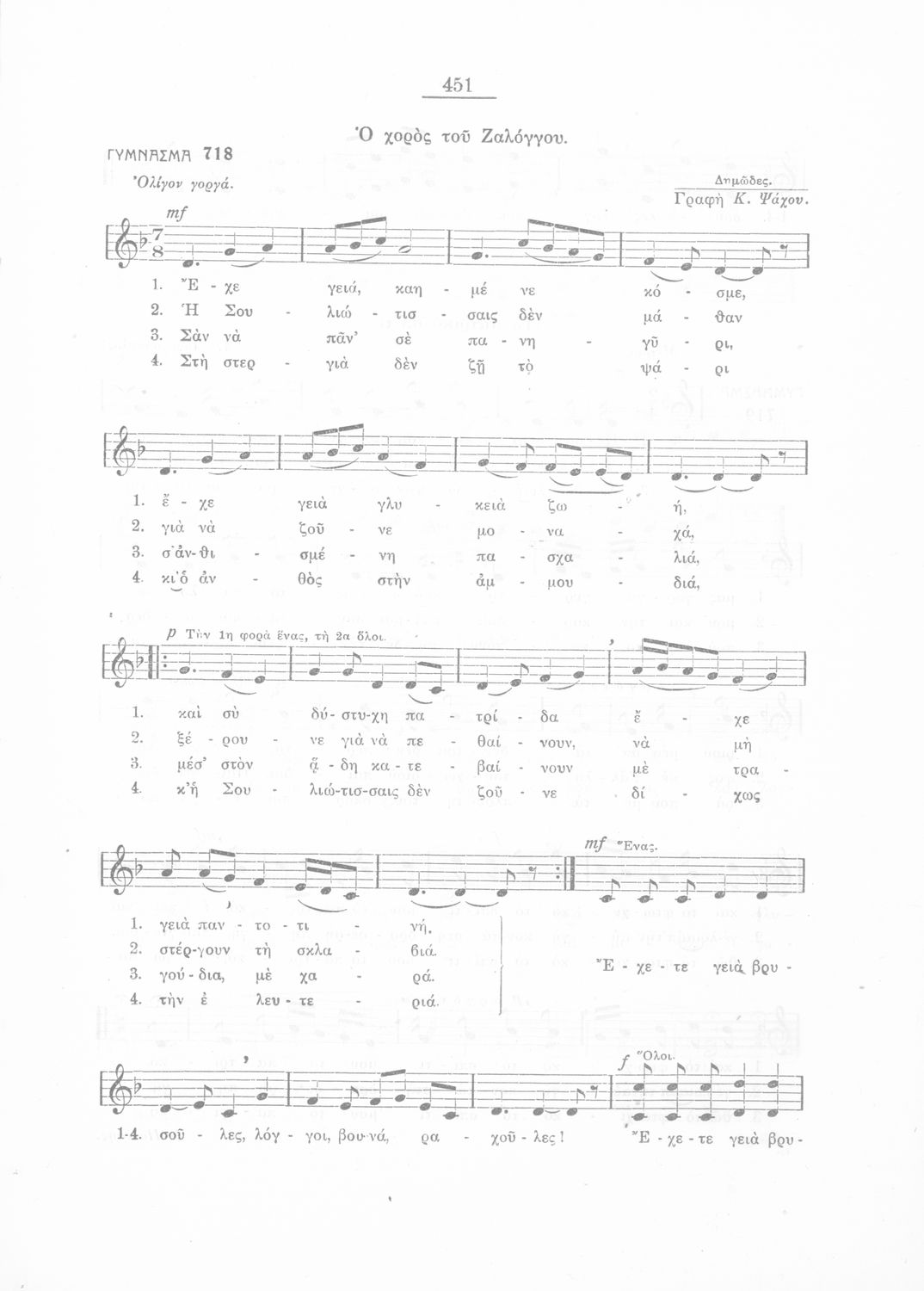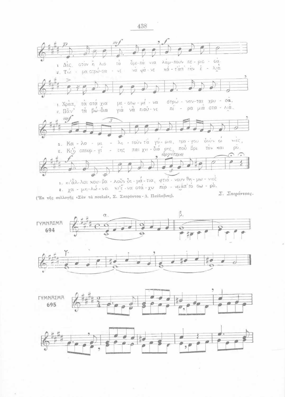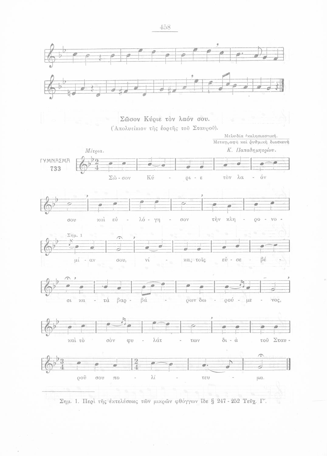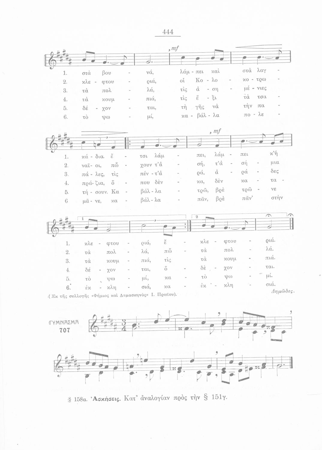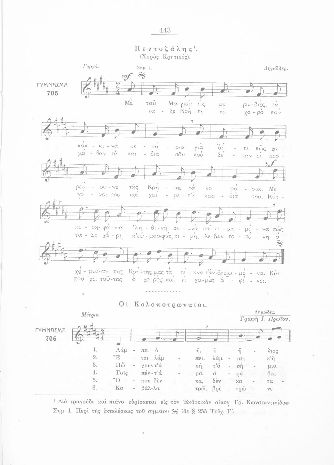 Σχολικό εγχειρίδιο Μουσικής για την Β' τάξη Εξαταξίων και Γ', Δ' τάξη Οκταταξίων σχολείων Μέσης Εκπαιδεύσεως. Περιέχει μείζονες κλίμακες και αλλοιωμένους φθόγγους, μελωδικές ασκήσεις και δίφωνες μελωδικές ...