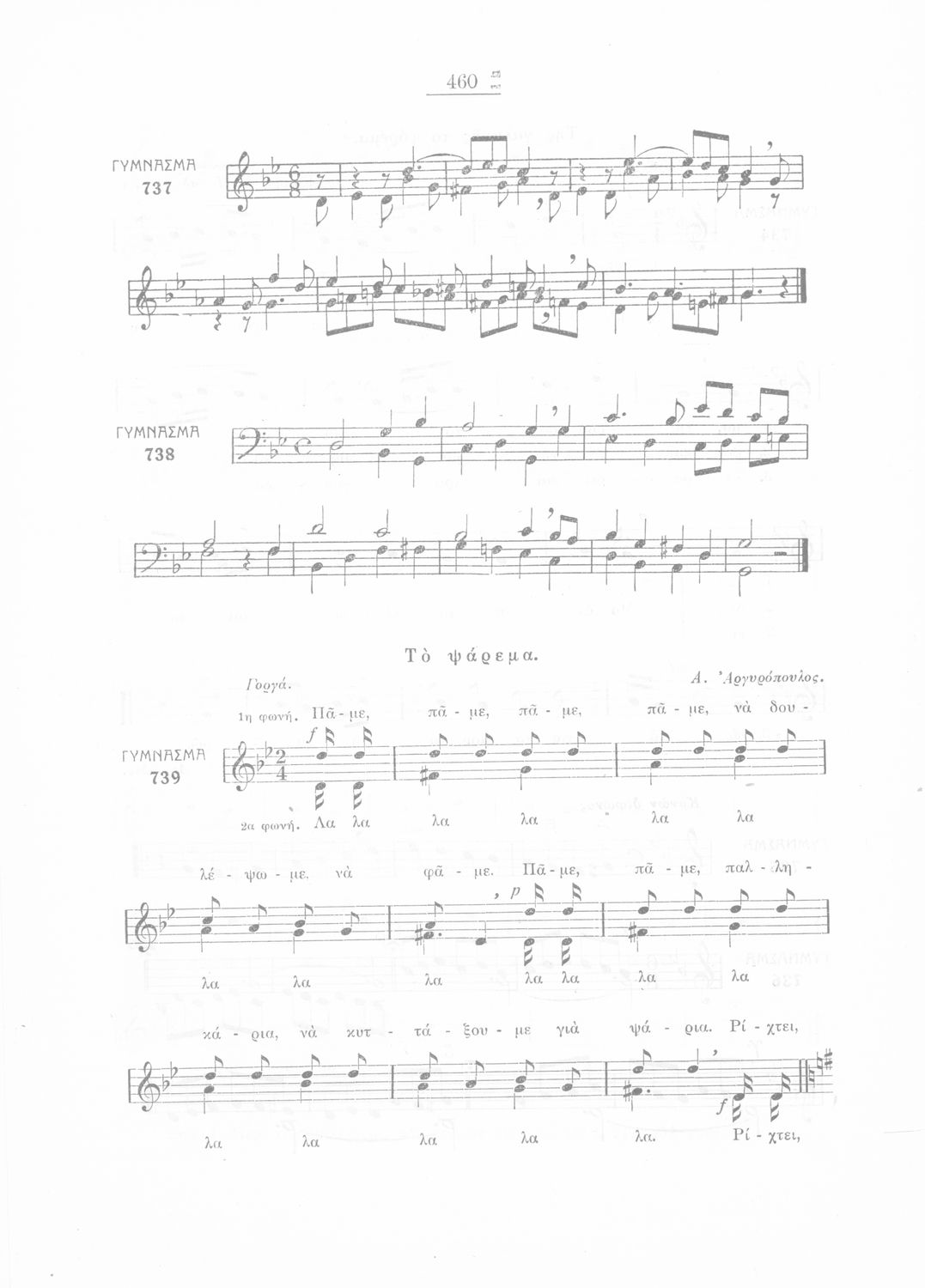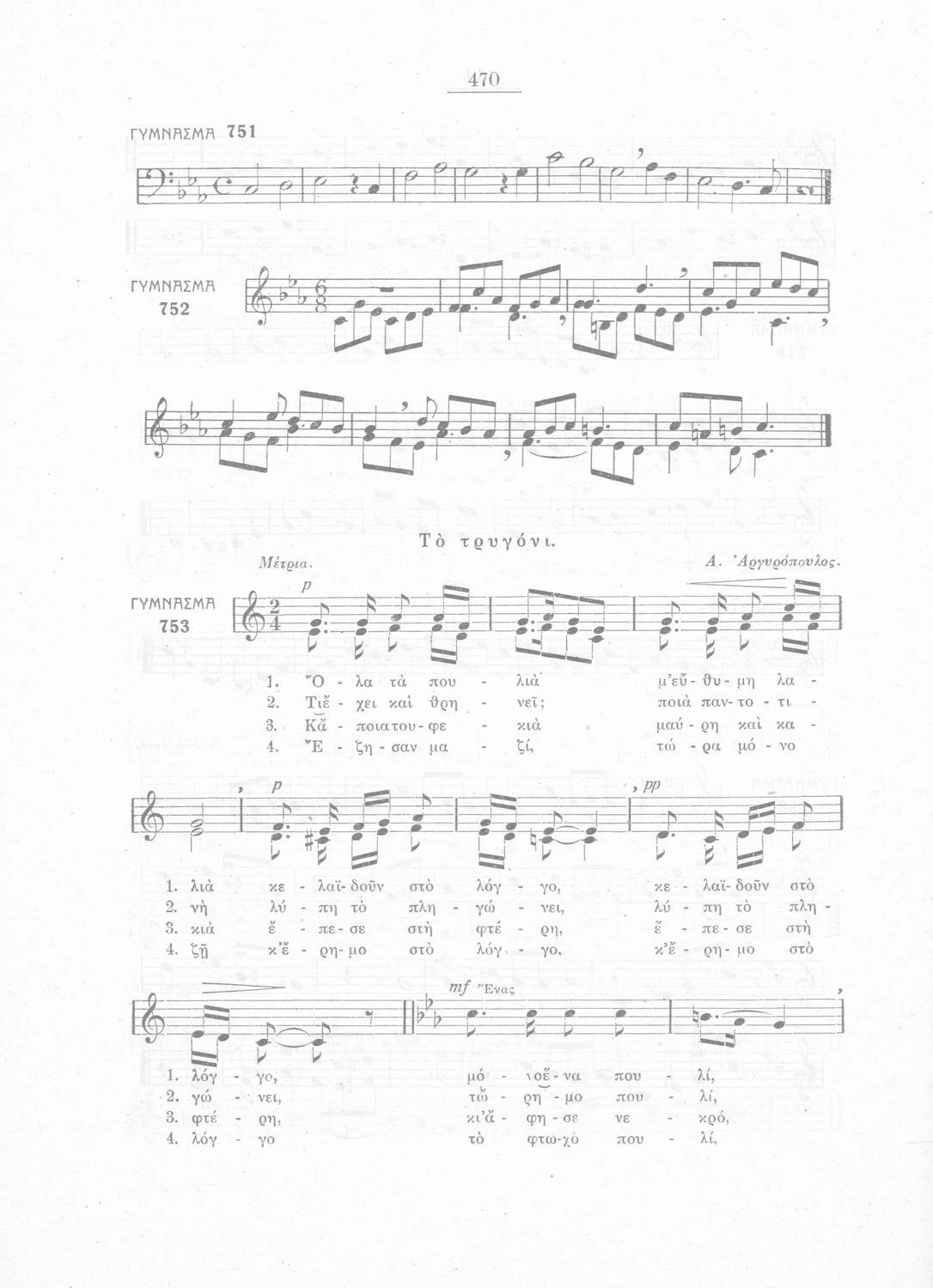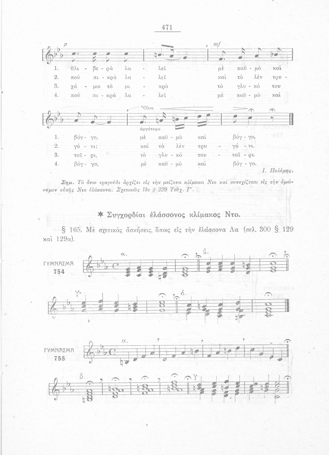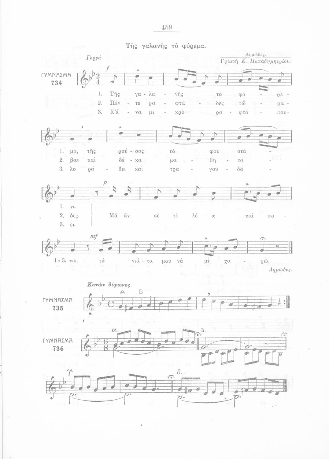 Σχολικό εγχειρίδιο Μουσικής για την Β' τάξη Εξαταξίων και Γ', Δ' τάξη Οκταταξίων σχολείων Μέσης Εκπαιδεύσεως. Περιέχει μείζονες κλίμακες και αλλοιωμένους φθόγγους, μελωδικές ασκήσεις και δίφωνες μελωδικές ...