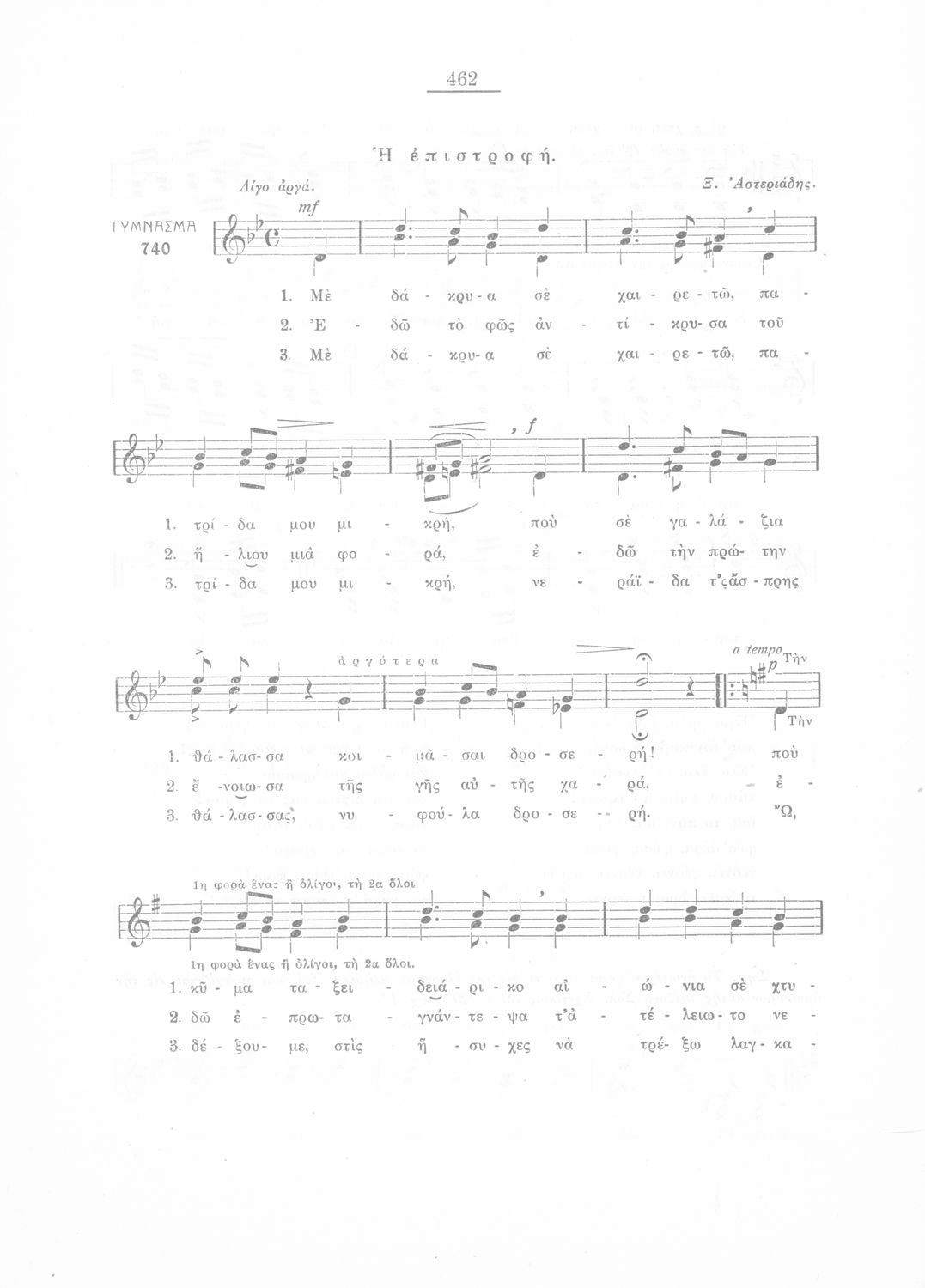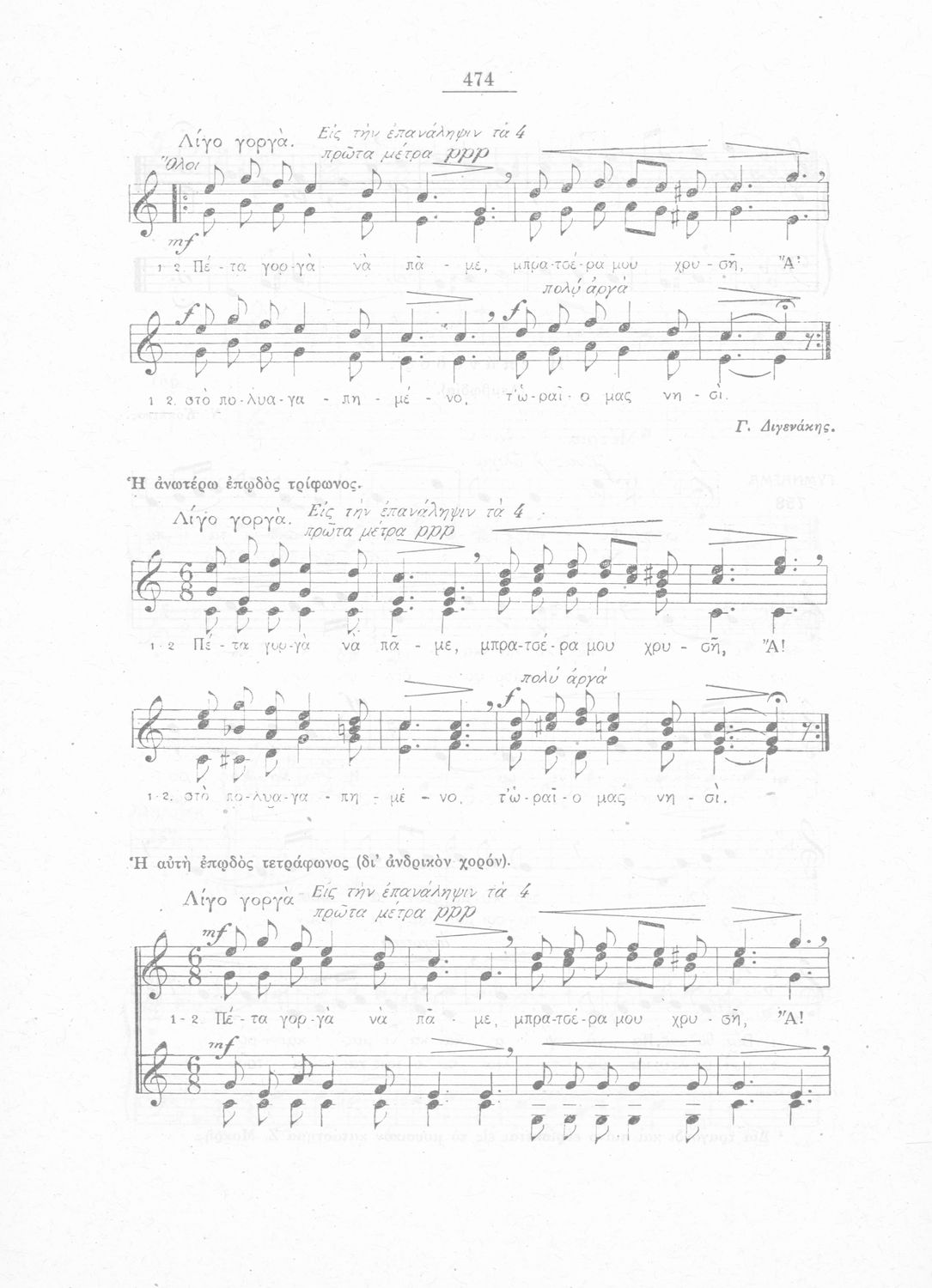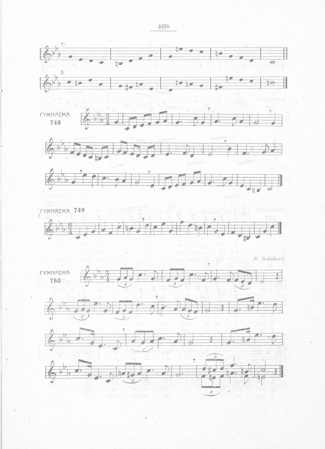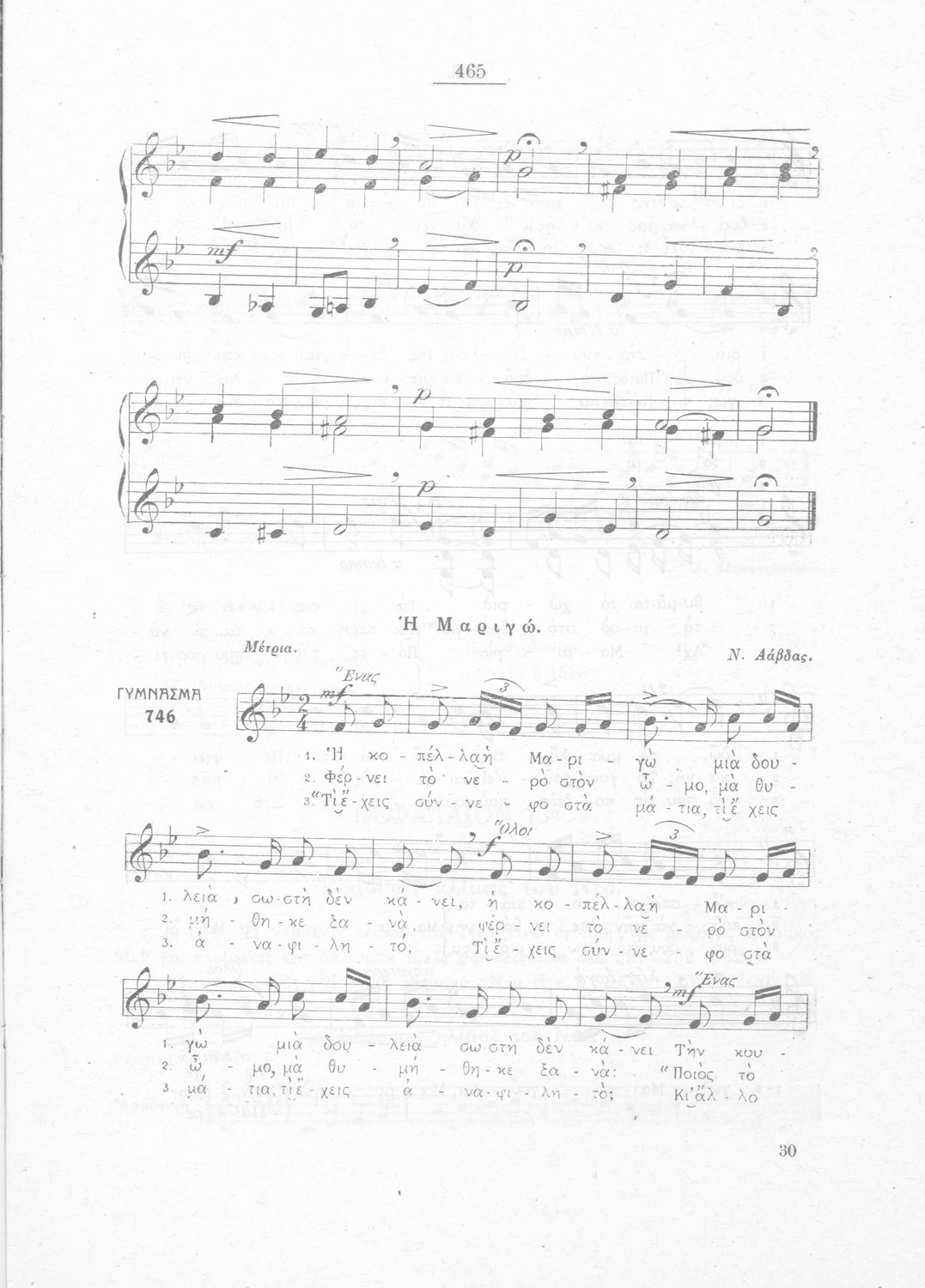 Σχολικό εγχειρίδιο Μουσικής για την Β' τάξη Εξαταξίων και Γ', Δ' τάξη Οκταταξίων σχολείων Μέσης Εκπαιδεύσεως. Περιέχει μείζονες κλίμακες και αλλοιωμένους φθόγγους, μελωδικές ασκήσεις και δίφωνες μελωδικές ...
