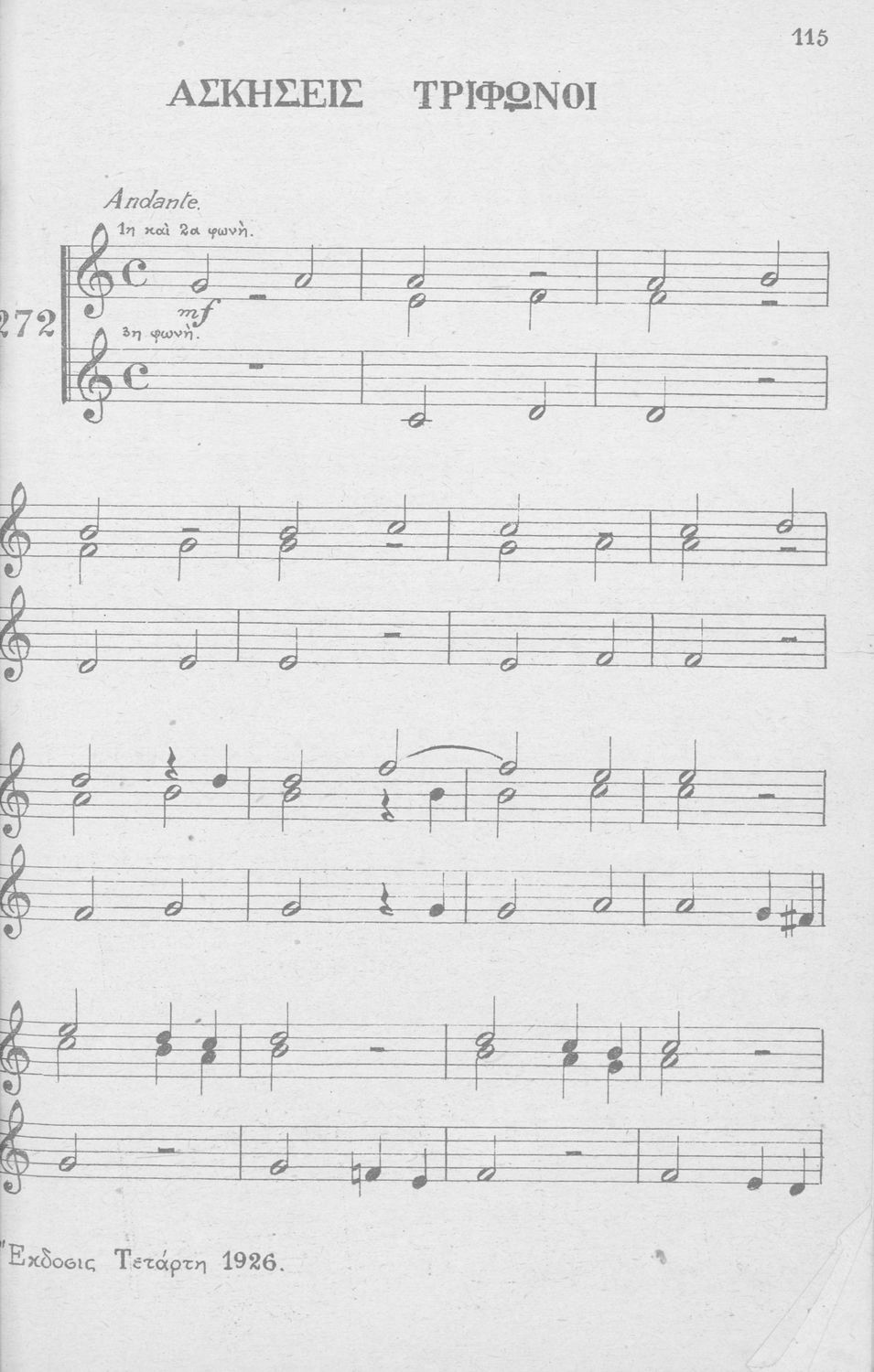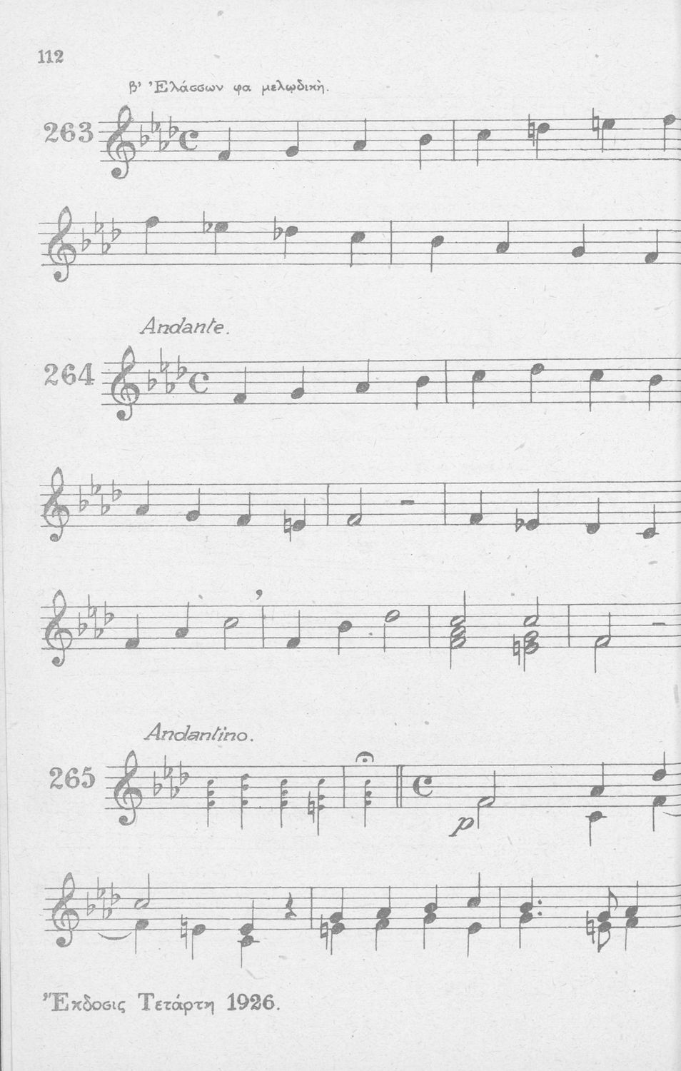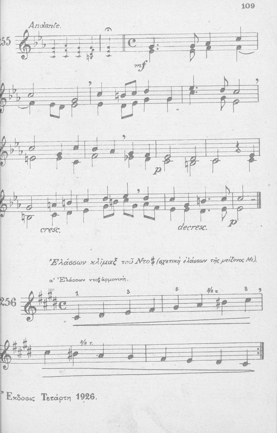 Σχολικό εγχειρίδιο Μουσικής για την Β' τάξη Εξαταξίων και Γ', Δ' τάξη Οκταταξίων σχολείων Μέσης Εκπαιδεύσεως. Περιέχει μείζονες κλίμακες και αλλοιωμένους φθόγγους, μελωδικές ασκήσεις και δίφωνες μελωδικές ...