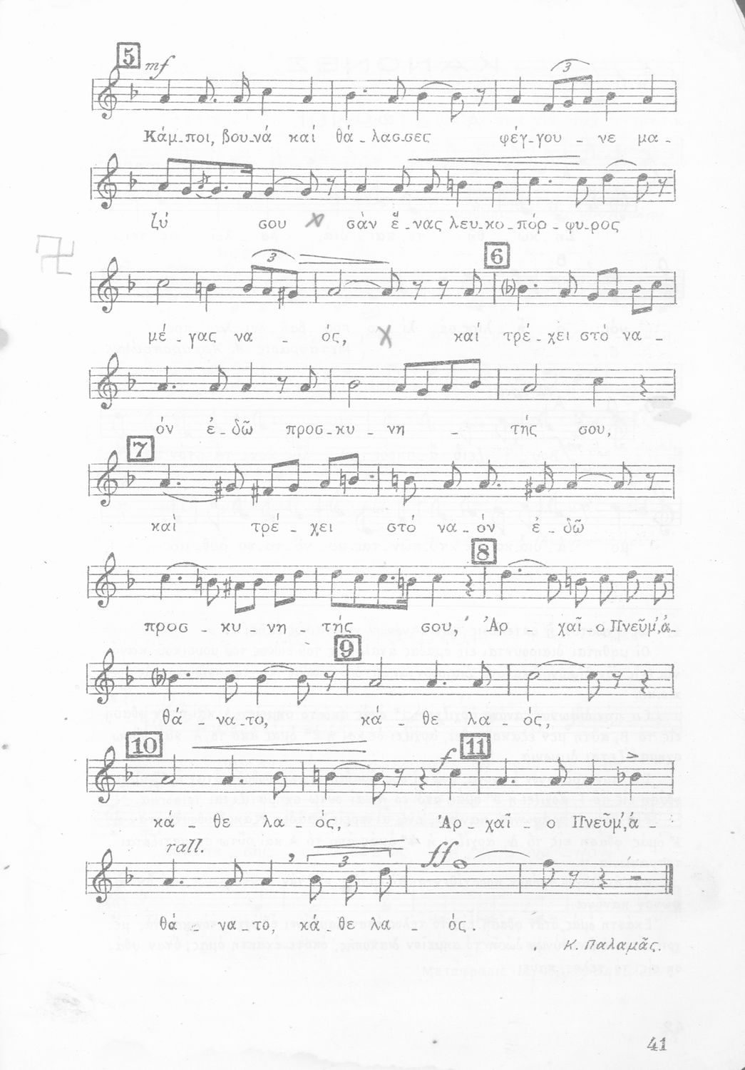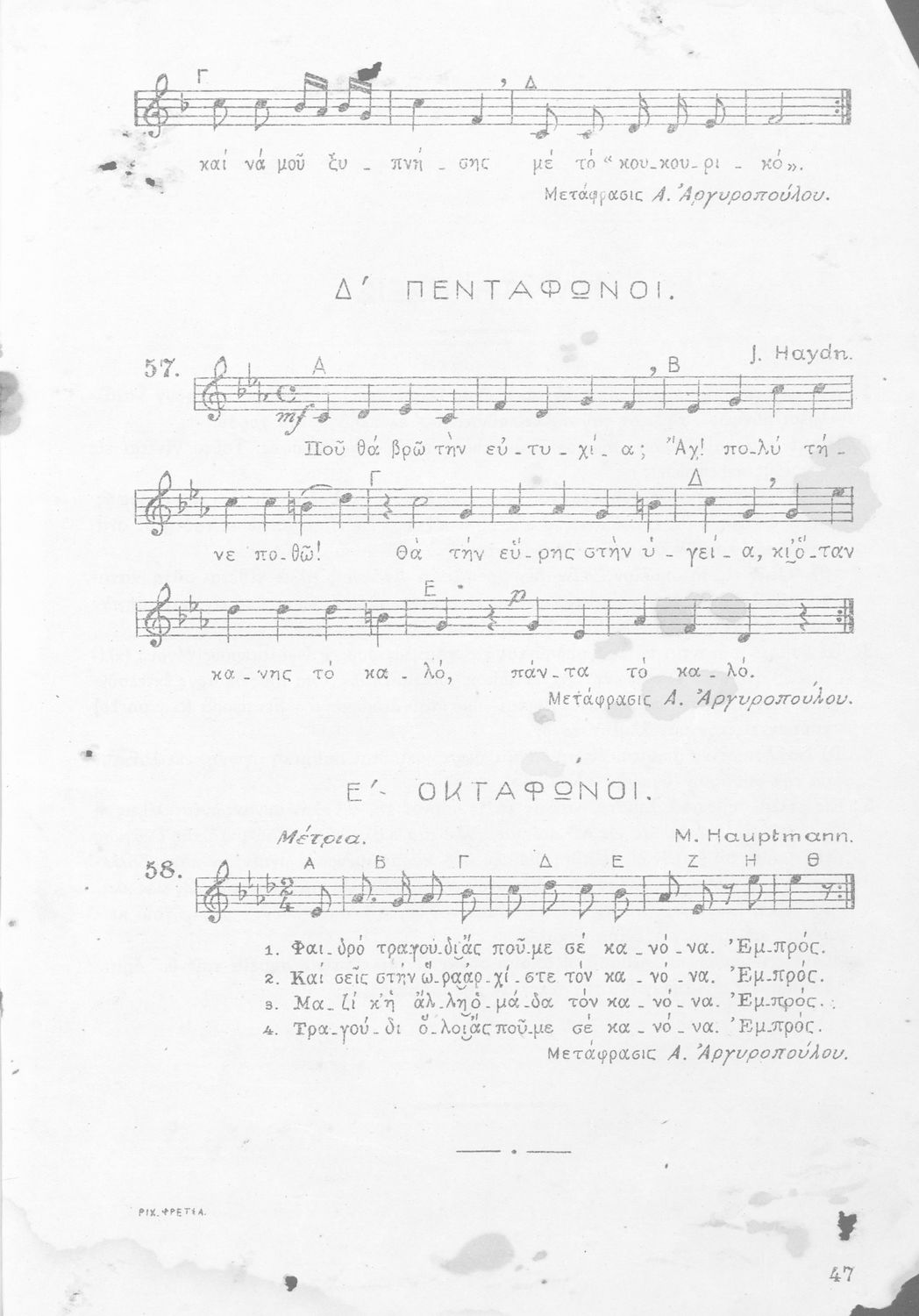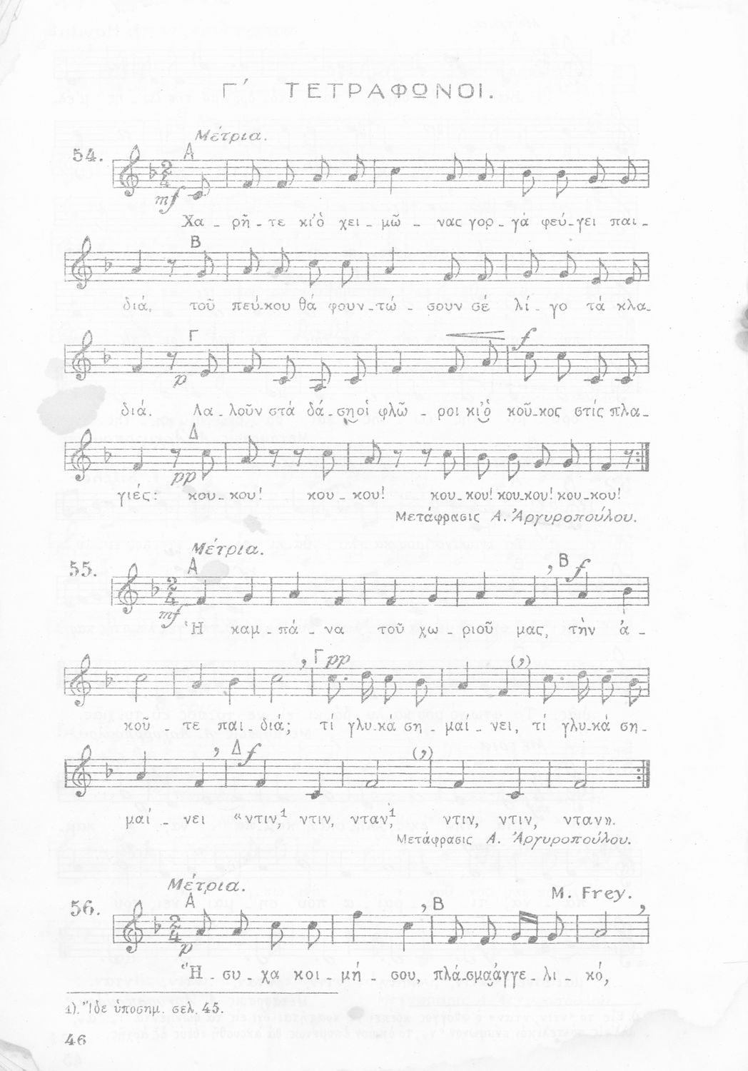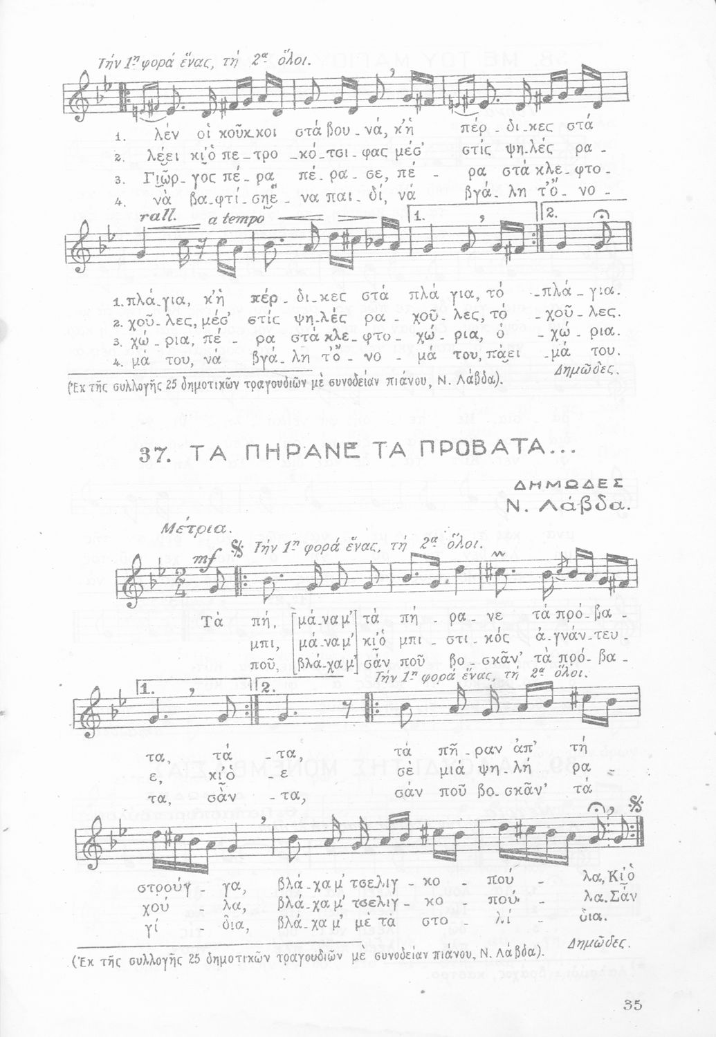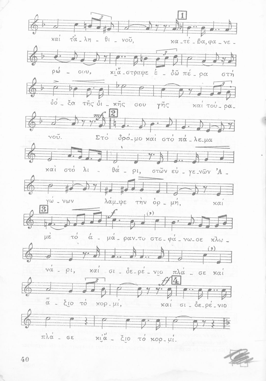 Σχολικό εγχειρίδιο Μουσικής που περιλαμβάνει στίχους τραγουδιών με παρτιτούρες και τραγούδια που έχουν ως αντικείμενο τη φύση και τα ζώα, την πατρίδα και τη θρησκεία.