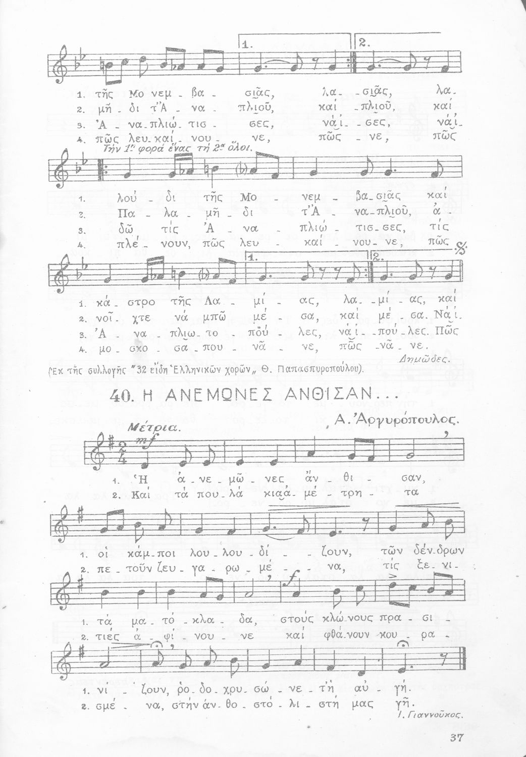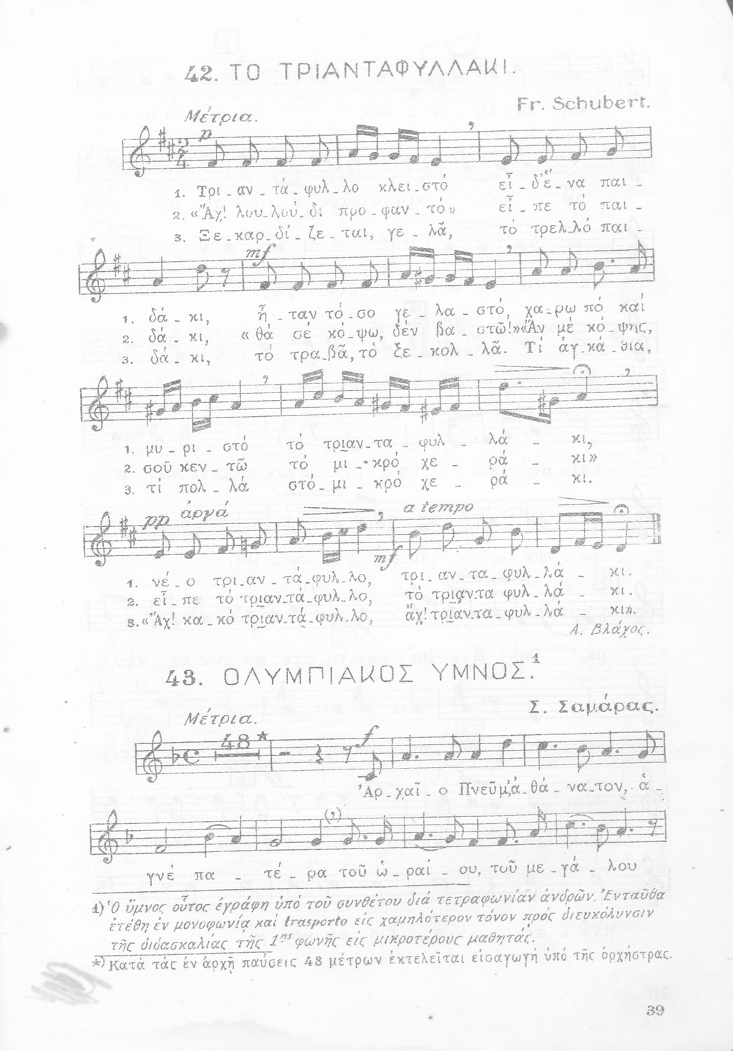 Σχολικό εγχειρίδιο Μουσικής του 1937. Περιέχει σχολικά τραγούδια με θέματα από τη θρησκεία, την πατρίδα και τη ζωή.
