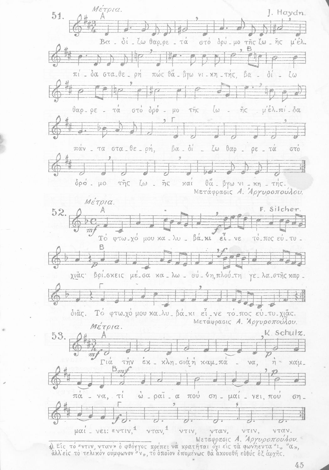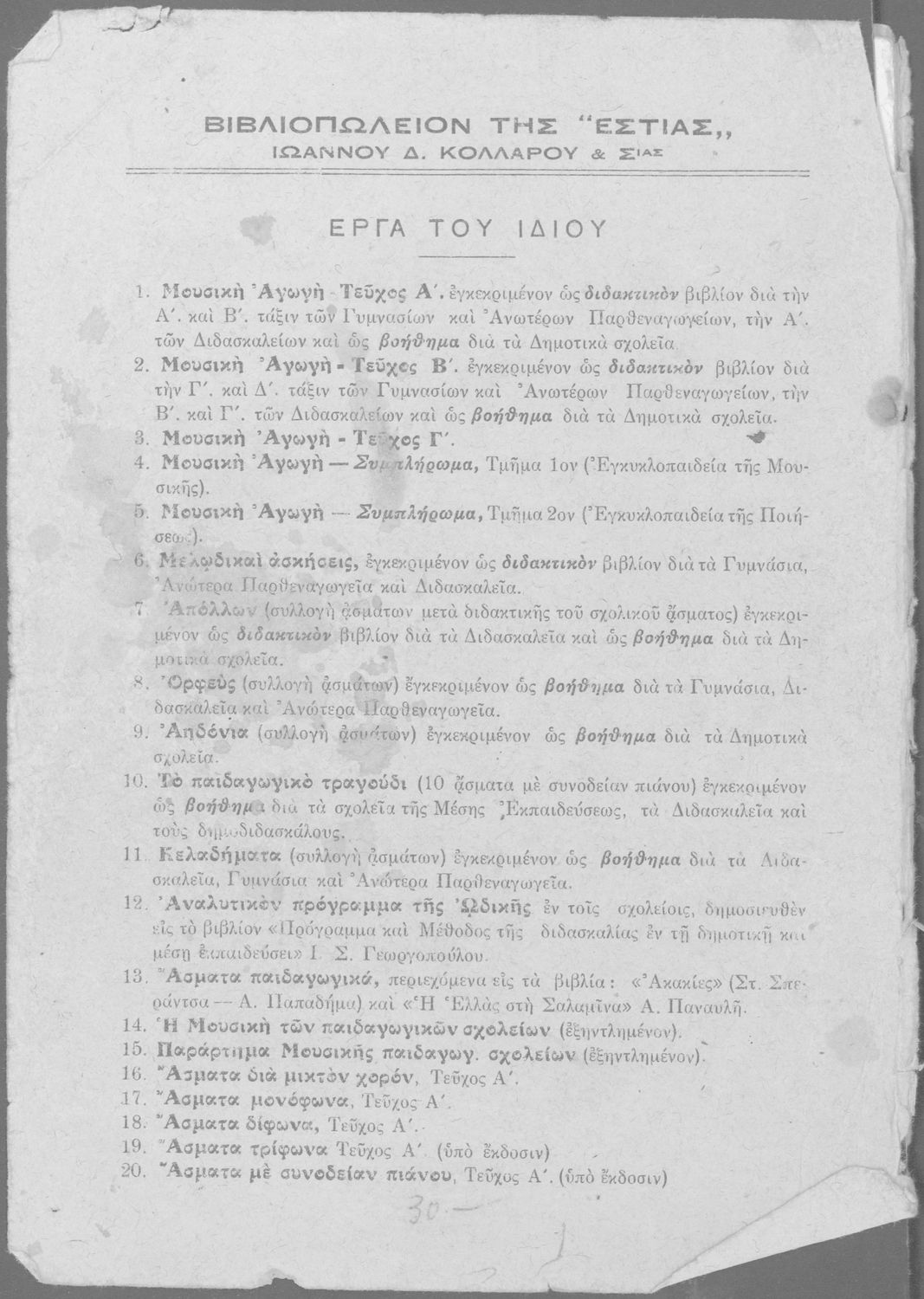 Σχολικό εγχειρίδιο Μουσικής για την Α', Β' Γυμνασίου, Ανώτερων Παρθεναγωγείων και Α΄ τάξη Διδασκαλείων. Σύστημα διδασκαλίας της Μουσικής με σχετική εγκυκλοπαίδεια σε τρία τεύχη. Ο συγγραφέας υπήρξε καθηγητής ...