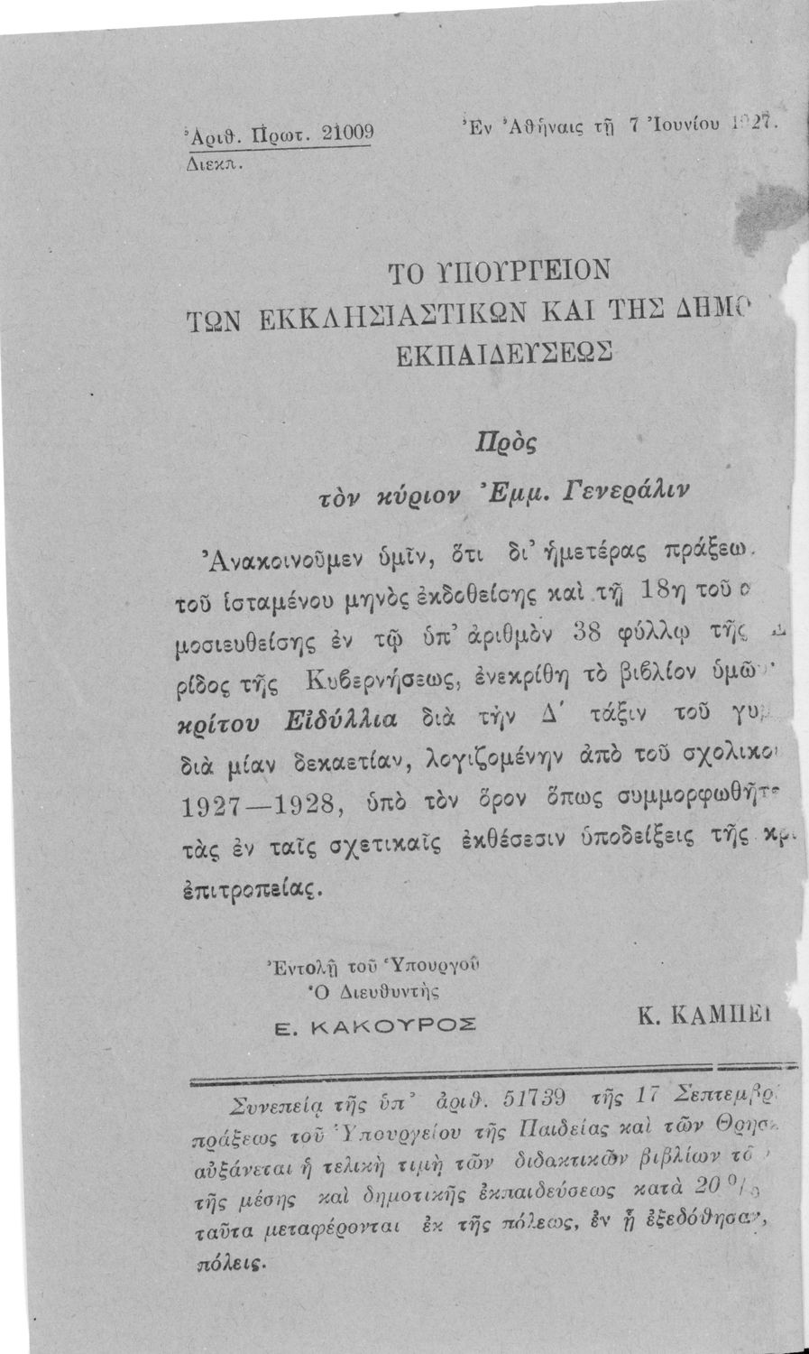 Υπουργική απόφαση / Σύμβαση: 21009/7-6-1927