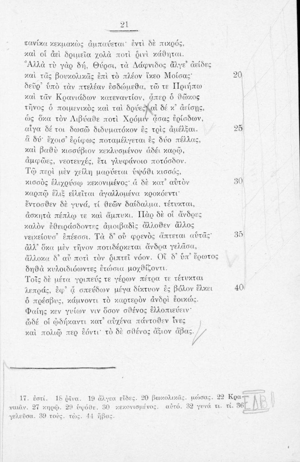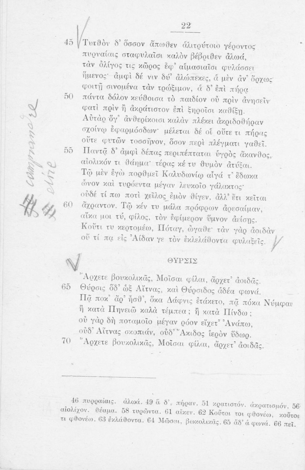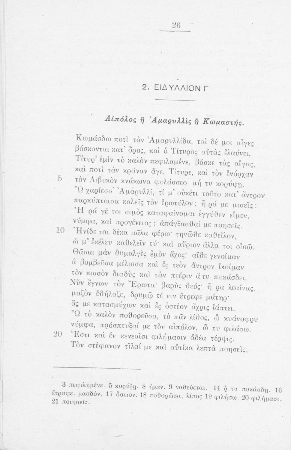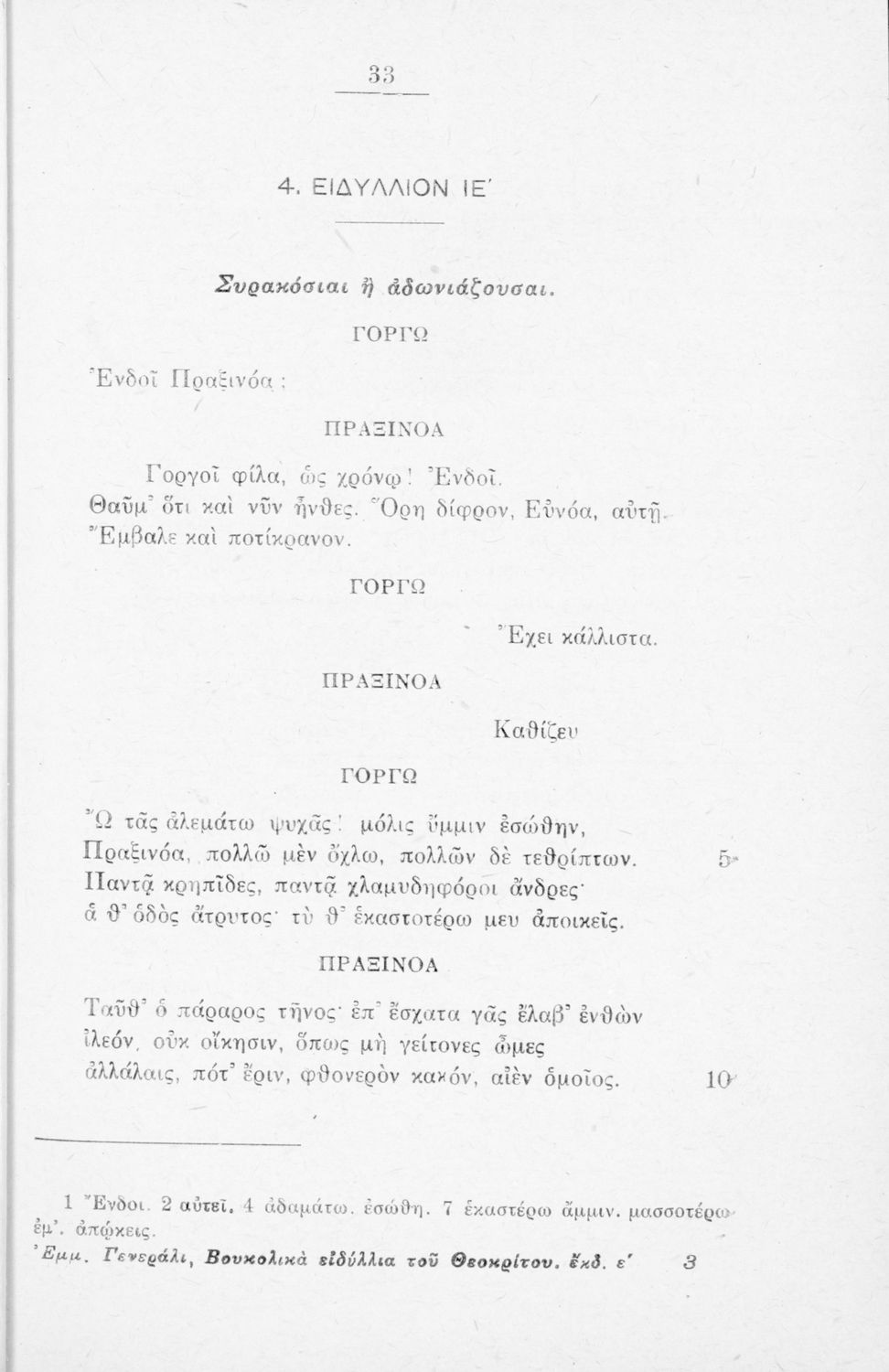 Σχολικό εγχειρίδιο Αρχαίων Ελληνικών Δ΄ Γυμνασίου που περιλαμβάνει τα Ειδύλλλια του Θεοκρίτου, και πραγματολογικές και λεξιλογικές παρατηρήσεις. Ο συγγραφέας ήταν διδάκτωρ Φιλολογίας.