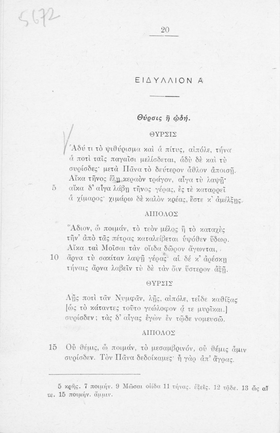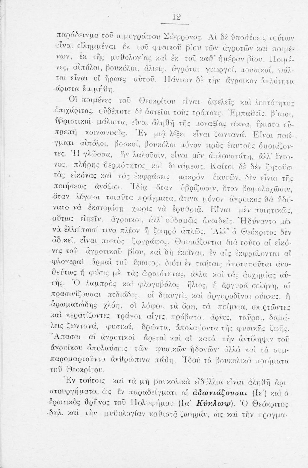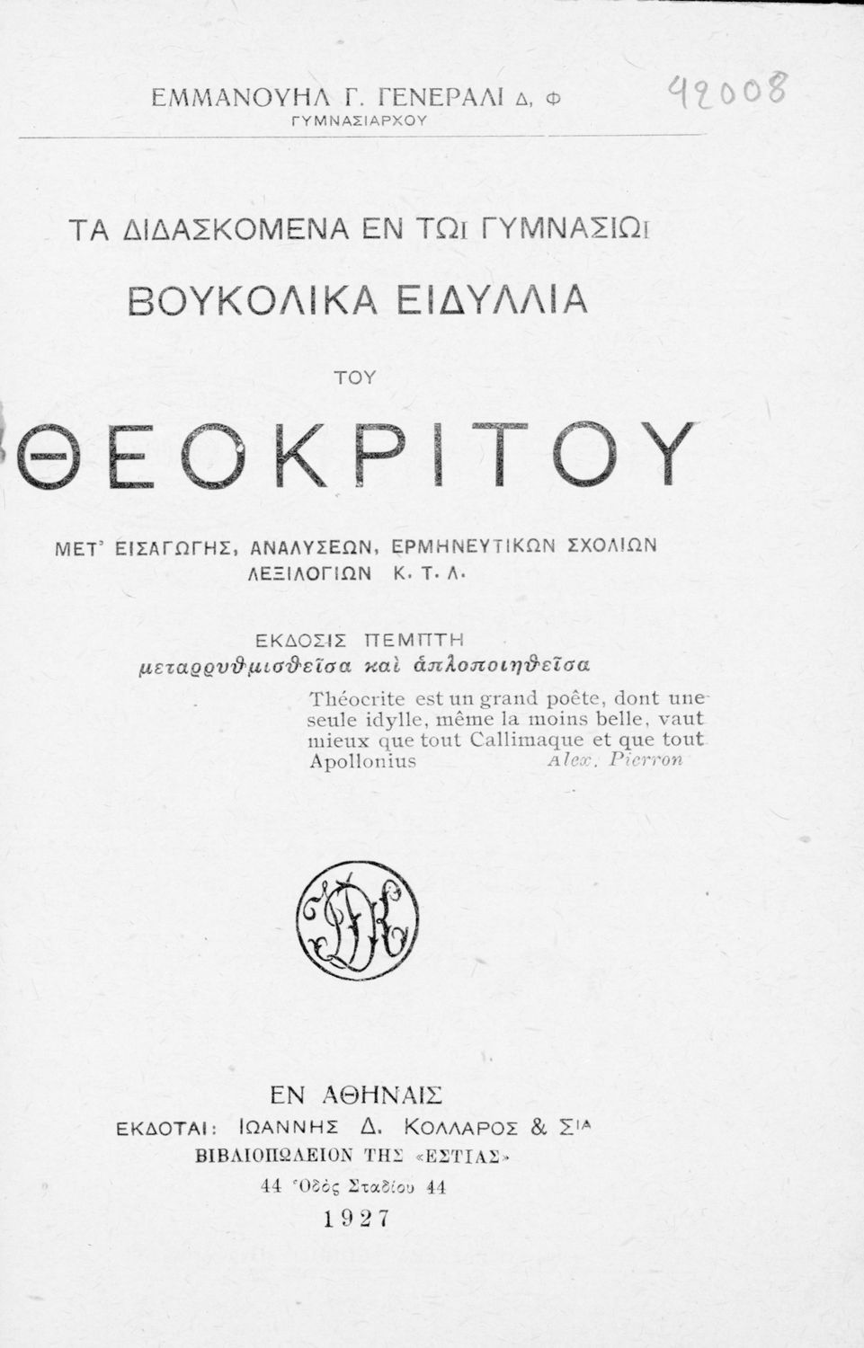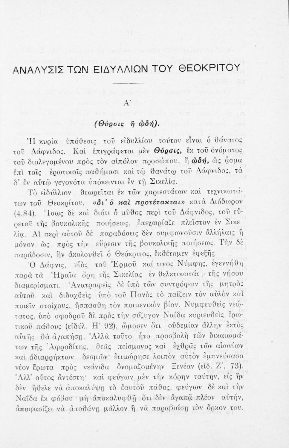 Σχολικό εγχειρίδιο Αρχαίων Ελληνικών Δ΄ Γυμνασίου που περιλαμβάνει τα Ειδύλλλια του Θεοκρίτου, και πραγματολογικές και λεξιλογικές παρατηρήσεις. Ο συγγραφέας ήταν διδάκτωρ Φιλολογίας.
