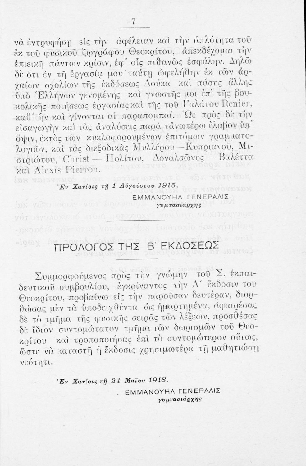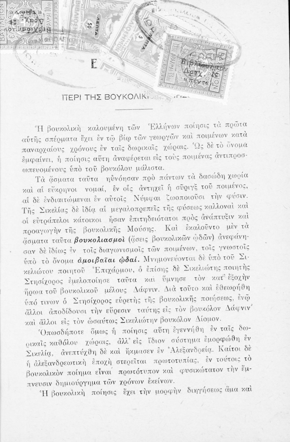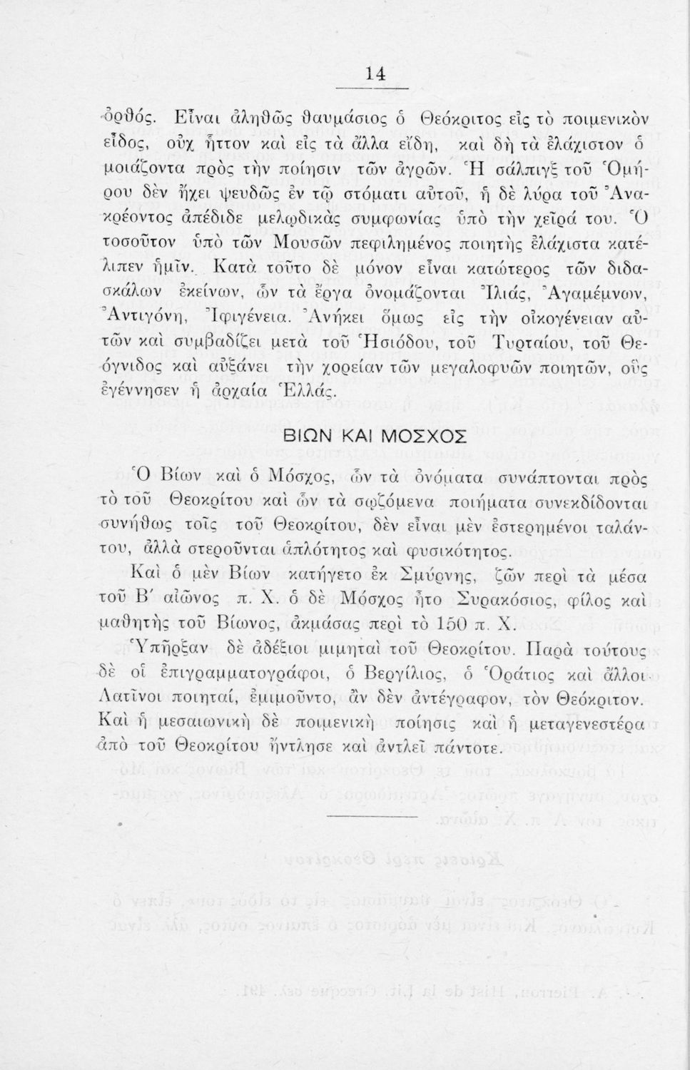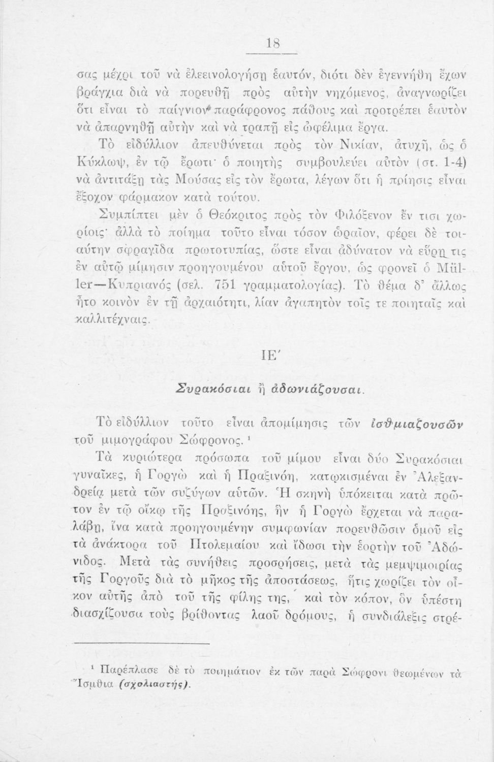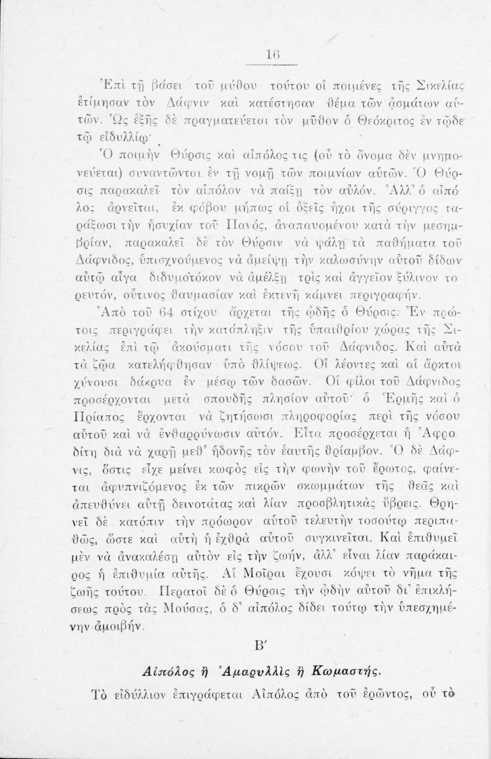 Σχολικό εγχειρίδιο Αρχαίων Ελληνικών Δ΄ Γυμνασίου που περιλαμβάνει τα Ειδύλλλια του Θεοκρίτου, και πραγματολογικές και λεξιλογικές παρατηρήσεις. Ο συγγραφέας ήταν διδάκτωρ Φιλολογίας.