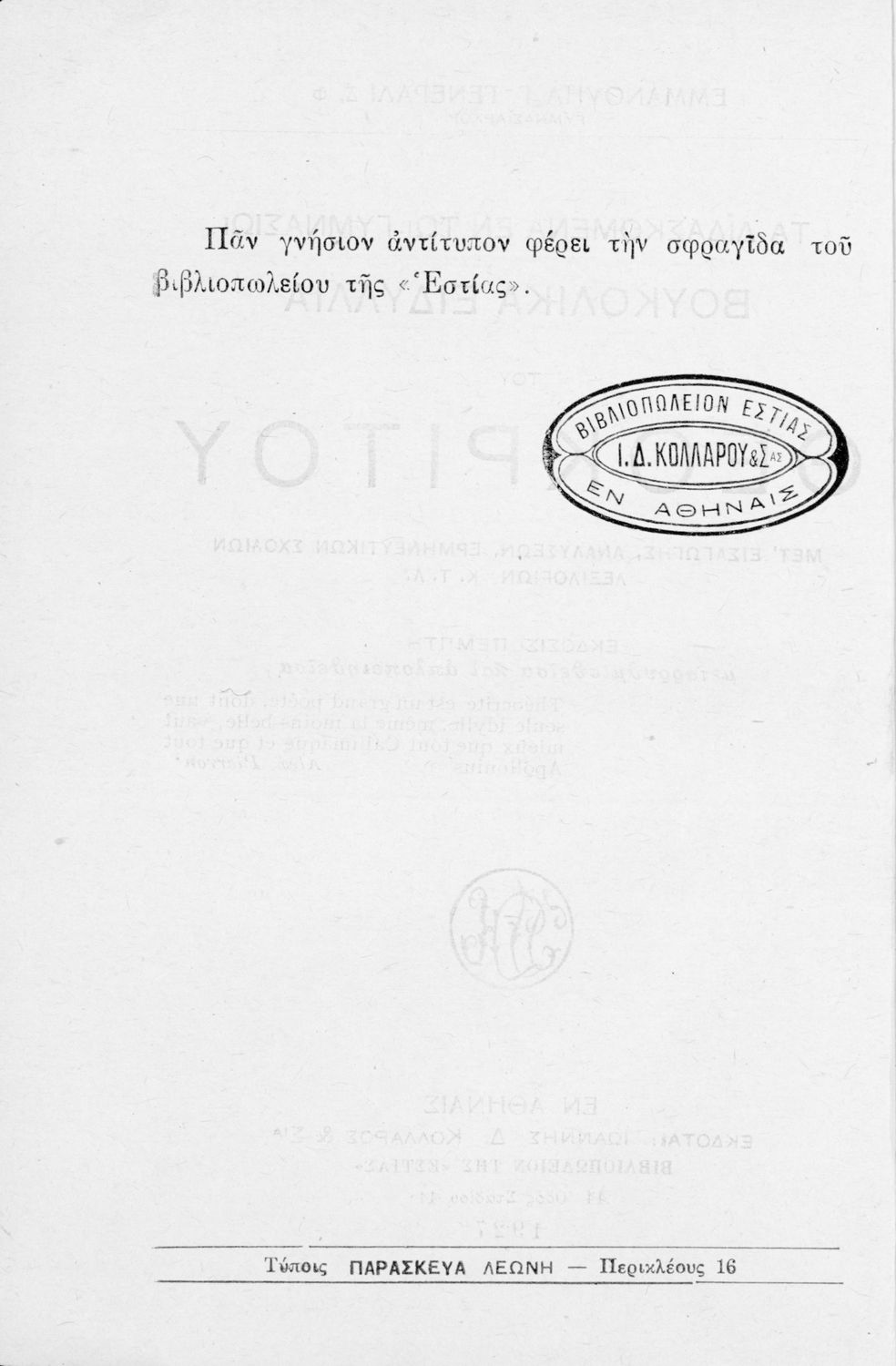 Εκδότης: Ιωάννης Δ. Κολλάρος και ΣΙΑ, Βιβλιοπωλείο της "Εστίας" Έτος έκδοσης: 1927 Τόπος έκδοσης: Αθήνα Έκδοση: 5η Υπουργική απόφαση / Σύμβαση: 21009/7-6-1927 Έτος έγκρισης: 1927 |