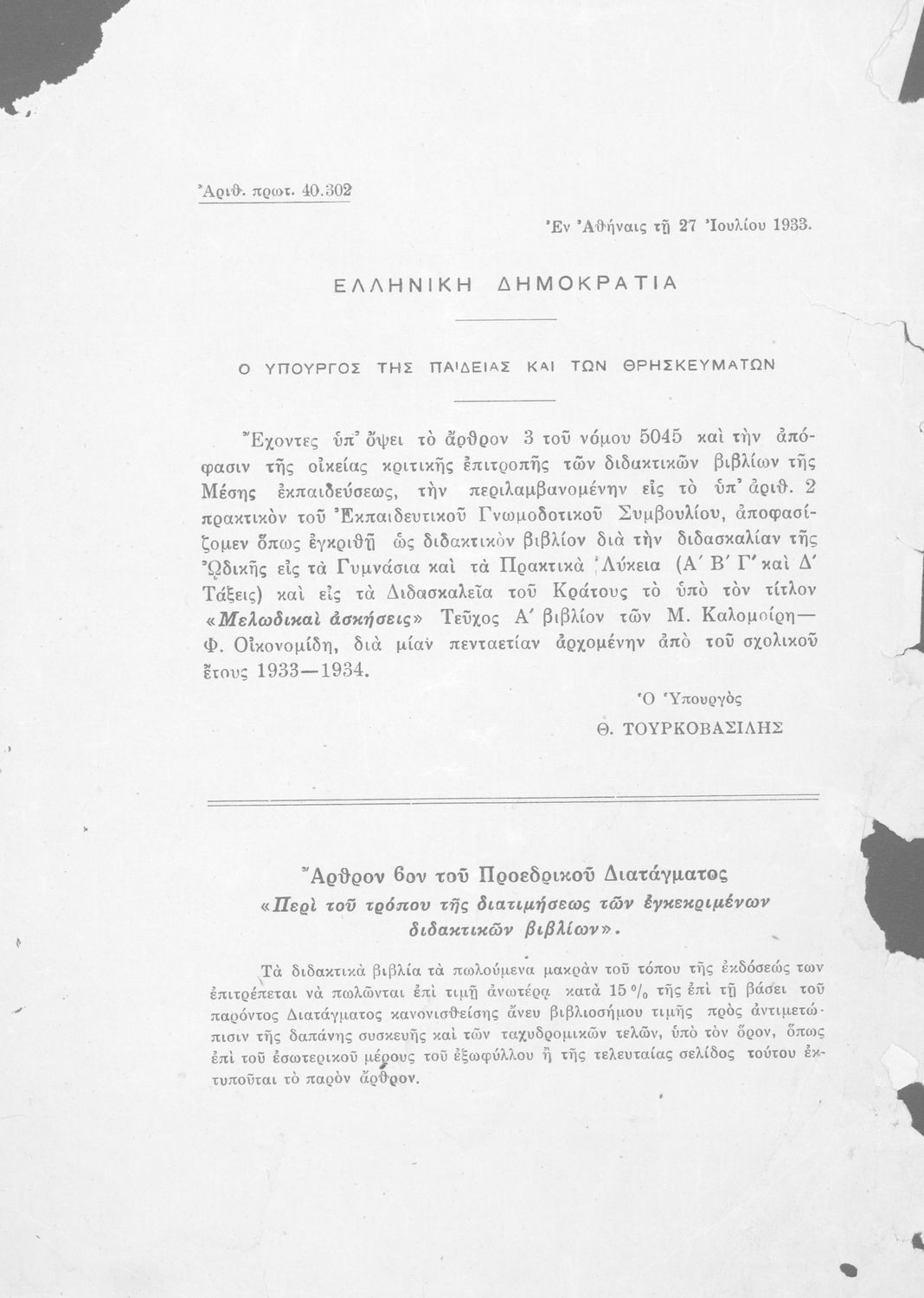 Υπουργική απόφαση / Σύμβαση: 40302/27-7-1933