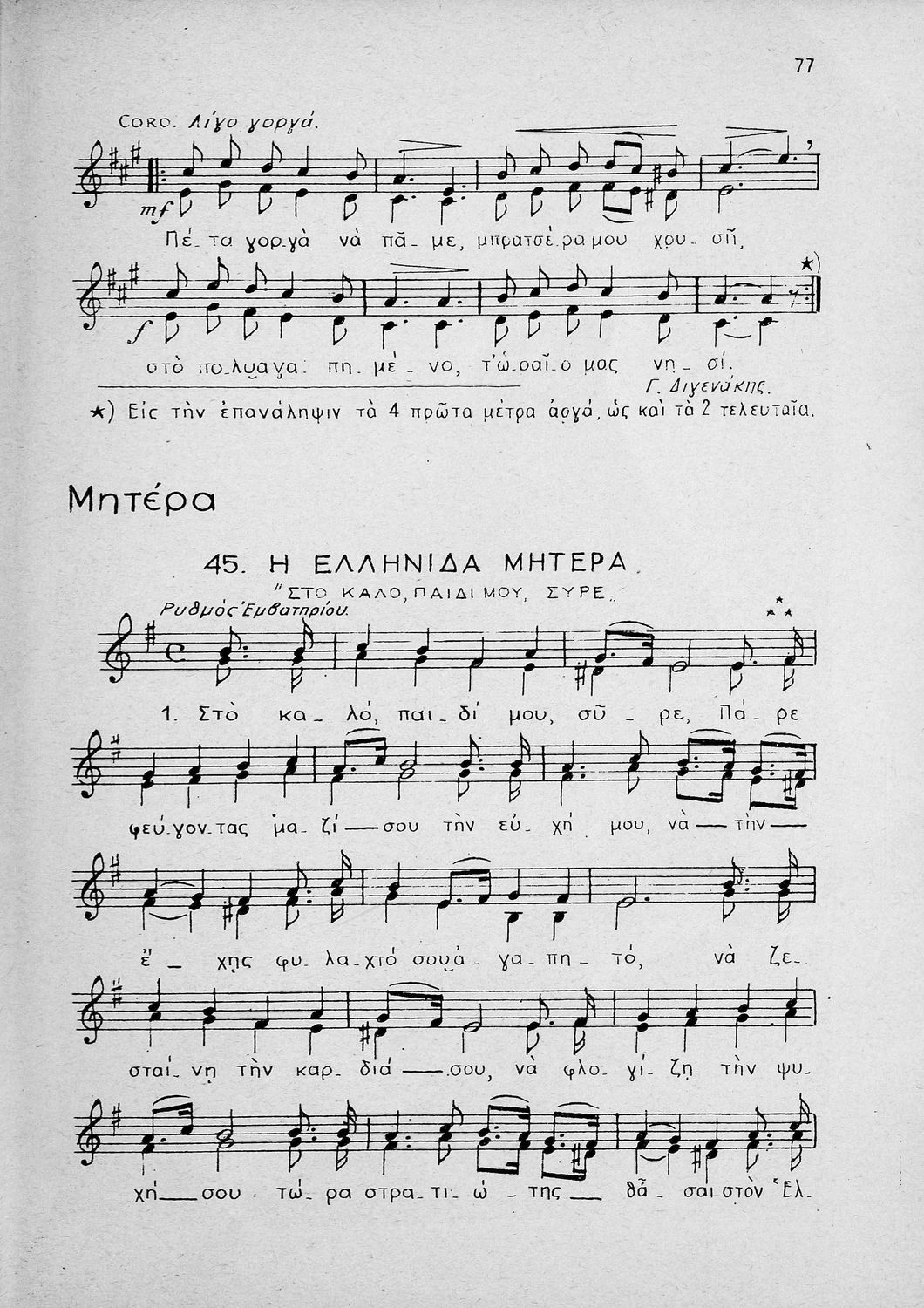Σχολικό εγχειρίδιο Μουσικής για την Α', Β', Γ΄, Δ' τάξη Γυμνασίου, Πρακτικών Λυκείων και Διδασκαλείων. Περιέχει ασκήσεις μελωδικές, χωρίς θεωρία.