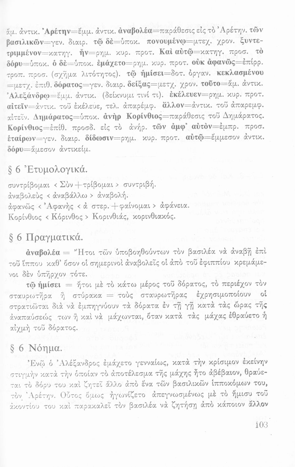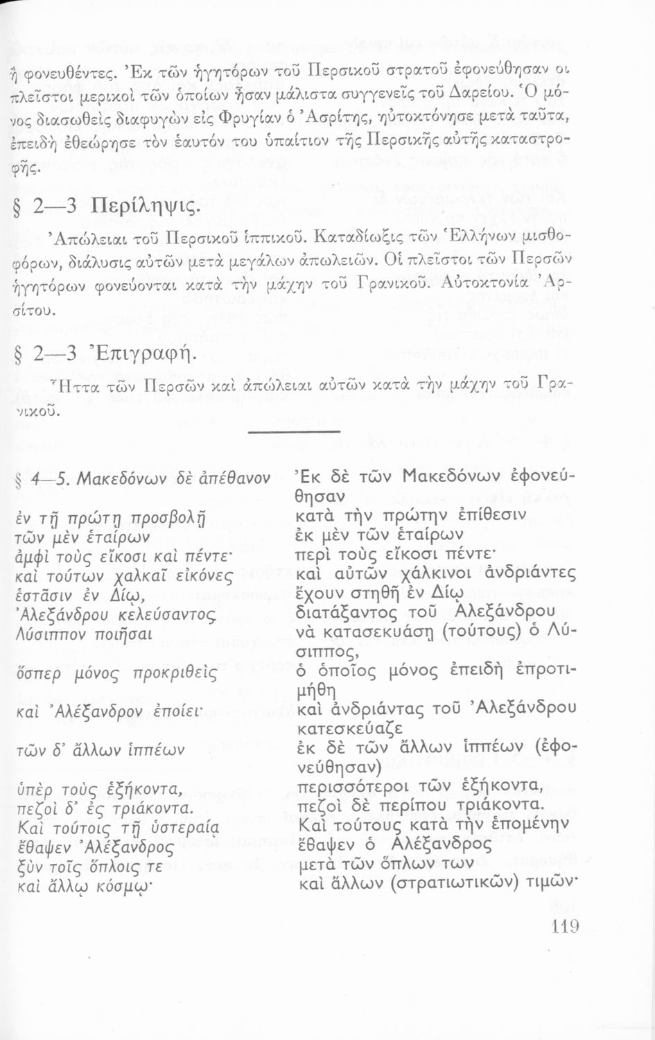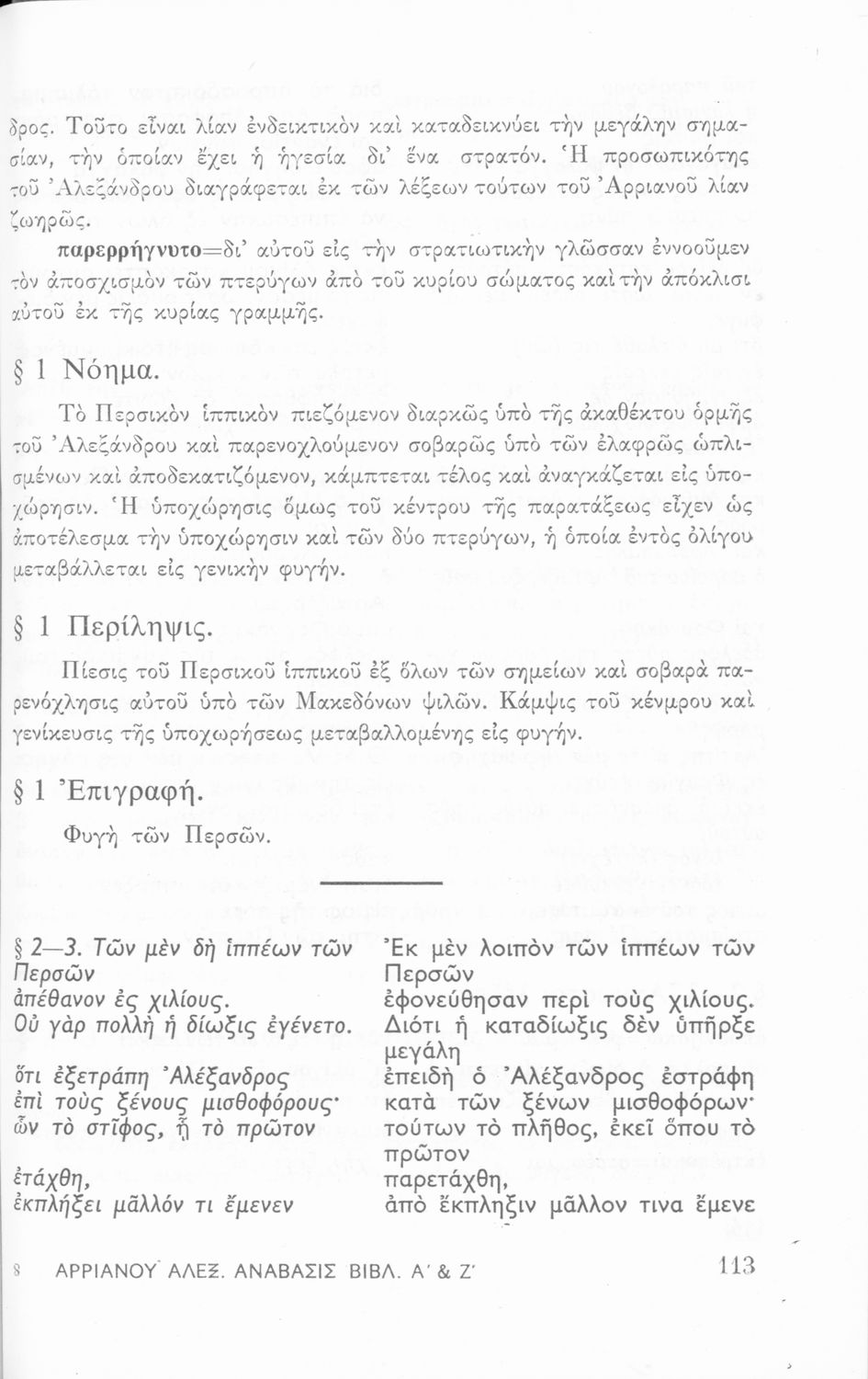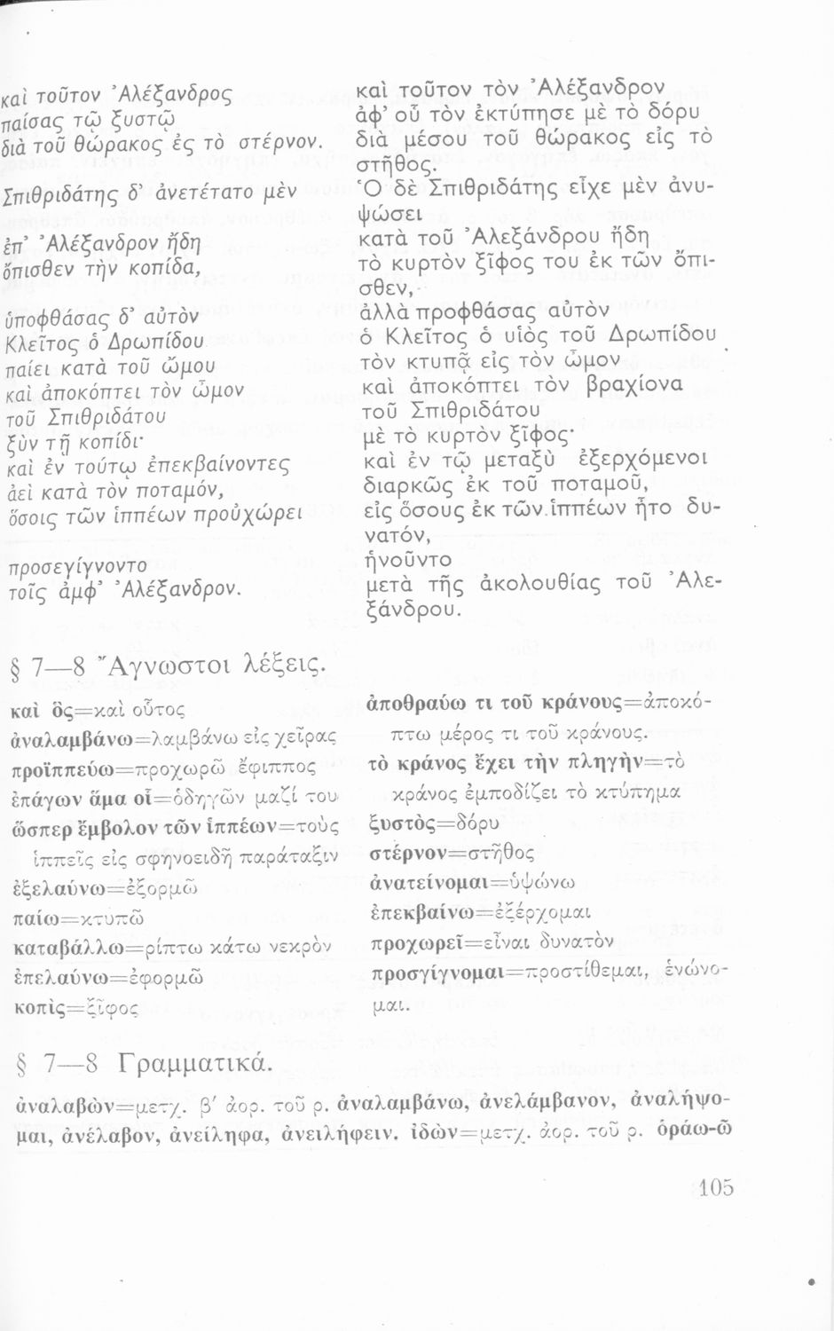 Μαθητικό βοήθημα Αρχαίων Ελληνικών Γ' Γυμνασίου που περιλαμβάνει αποσπάσματα από το έργο του Αρριανού Αλεξάνδρου Ανάβασις, ερμηνευτικά και γραμματικά σχόλια καθώς και χρονικές και εγκλιτικές αντικαταστάσεις. Ο συγγραφέας ήταν Γυμνασιάρχης.