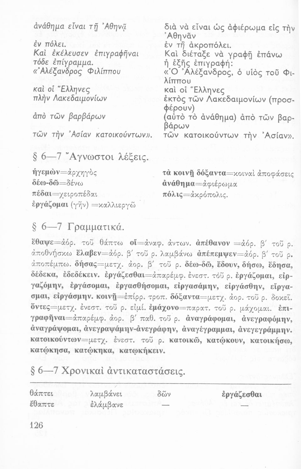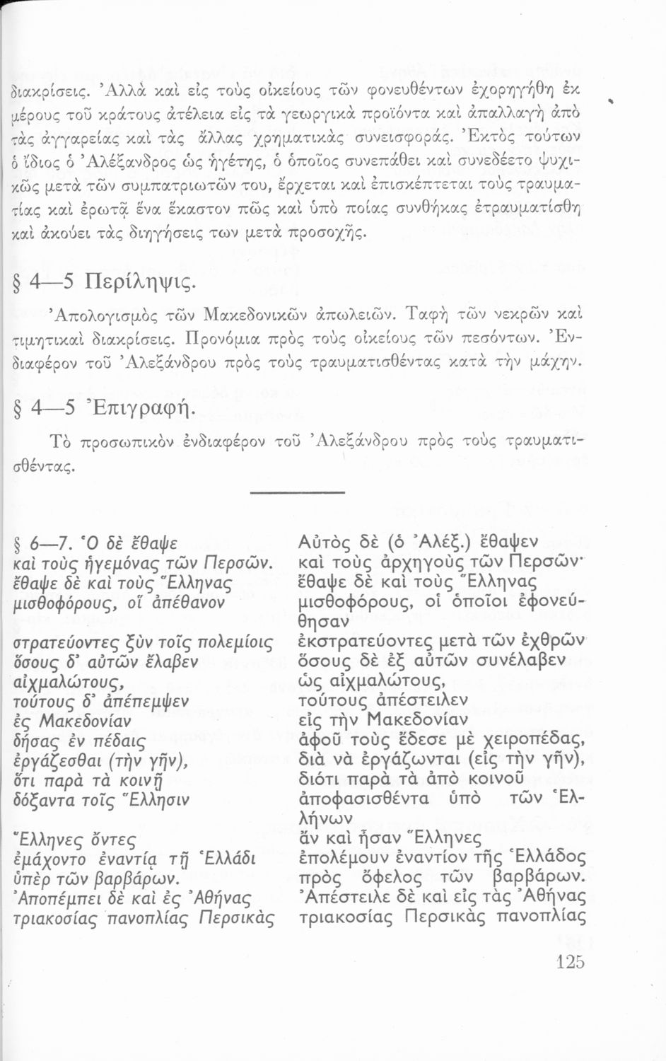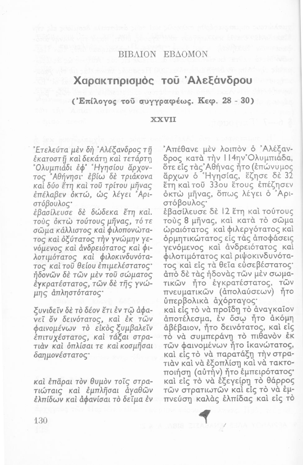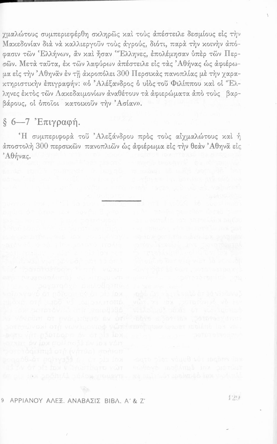 Μαθητικό βοήθημα Αρχαίων Ελληνικών Γ' Γυμνασίου που περιλαμβάνει αποσπάσματα από το έργο του Αρριανού Αλεξάνδρου Ανάβασις, ερμηνευτικά και γραμματικά σχόλια καθώς και χρονικές και εγκλιτικές αντικαταστάσεις. Ο συγγραφέας ήταν Γυμνασιάρχης.