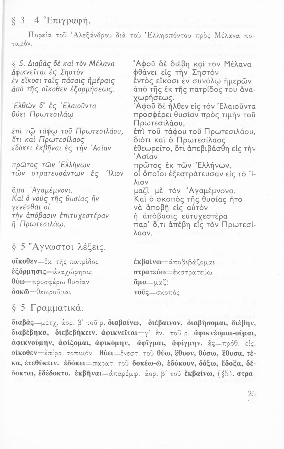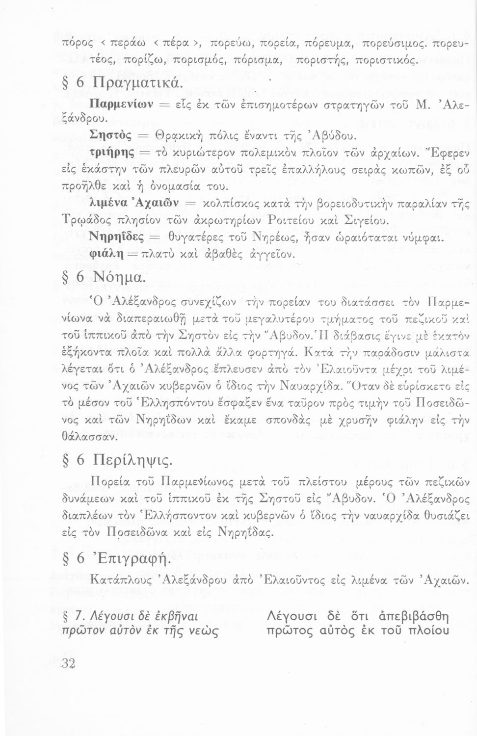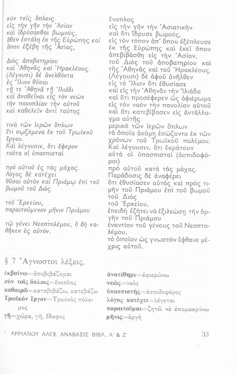 Μαθητικό βοήθημα Αρχαίων Ελληνικών Γ' Γυμνασίου που περιλαμβάνει αποσπάσματα από το έργο του Αρριανού Αλεξάνδρου Ανάβασις, ερμηνευτικά και γραμματικά σχόλια καθώς και χρονικές και εγκλιτικές αντικαταστάσεις. Ο συγγραφέας ήταν Γυμνασιάρχης.