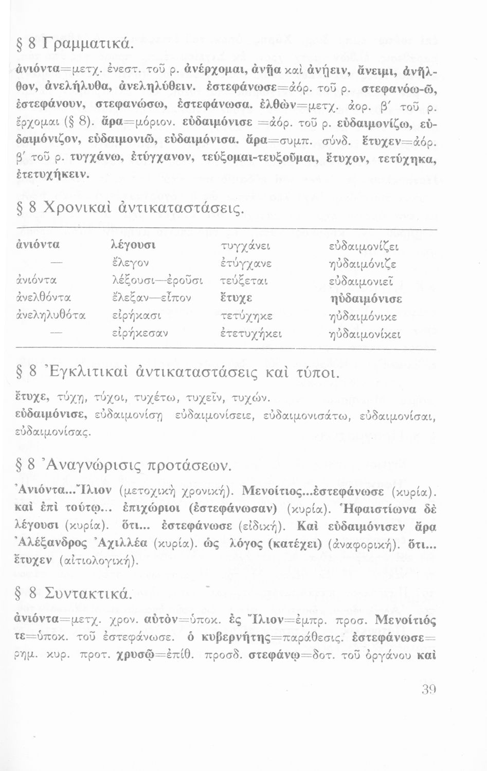 Βαθμίδα εκπαίδευσης: Δευτεροβάθμια Τάξη: Γ' Γυμνασίου Μάθημα: Αρχαία Ελληνικά Γλώσσα: Καθαρεύουσα Παρουσίαση περιεχομένου: Μαθητικό βοήθημα Αρχαίων Ελληνικών Γ' Γυμνασίου που περιλαμβάνει αποσπάσματα από το έργο του Αρριανού Αλεξάνδρου Ανάβασις, ερμηνευτικά και γραμματικά σχόλια καθώς και χρονικές και εγκλιτικές αντικαταστάσεις. Ο συγγραφέας ήταν Γυμνασιάρχης. |