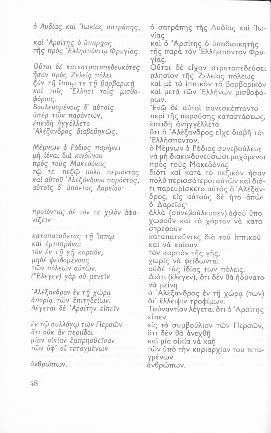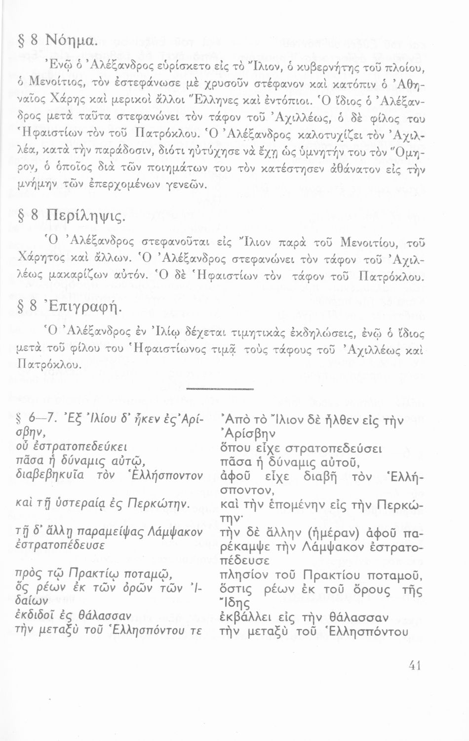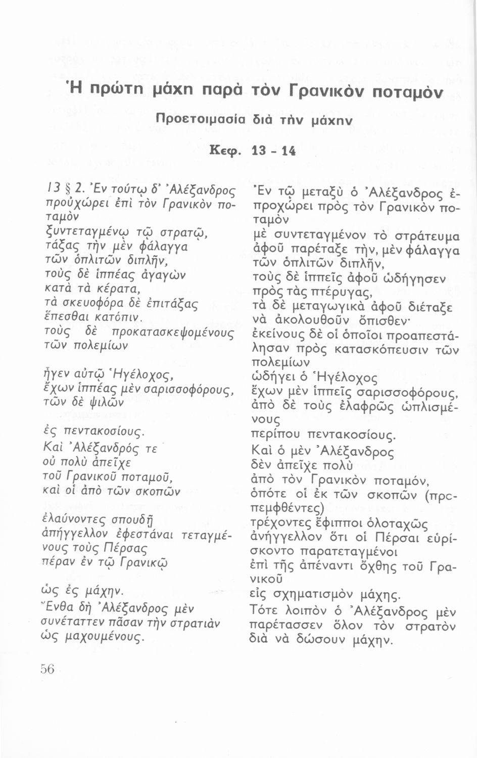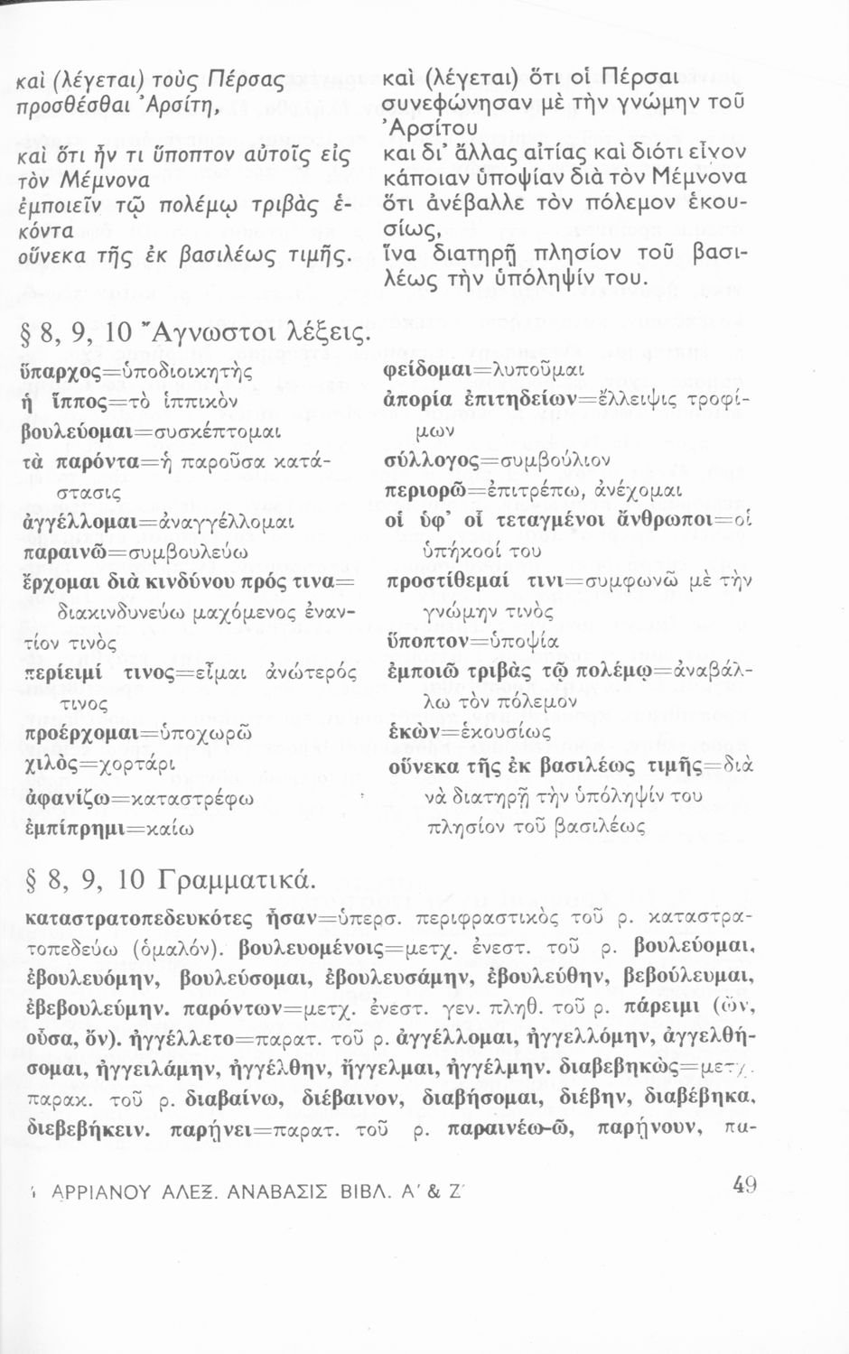 Μαθητικό βοήθημα Αρχαίων Ελληνικών Γ' Γυμνασίου που περιλαμβάνει αποσπάσματα από το έργο του Αρριανού Αλεξάνδρου Ανάβασις, ερμηνευτικά και γραμματικά σχόλια καθώς και χρονικές και εγκλιτικές αντικαταστάσεις. Ο συγγραφέας ήταν Γυμνασιάρχης.