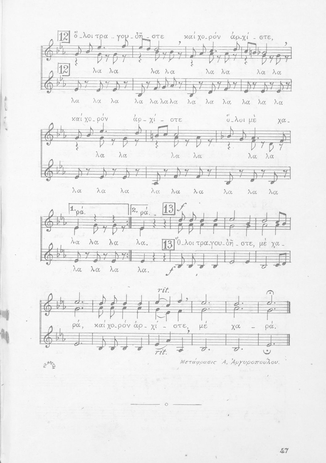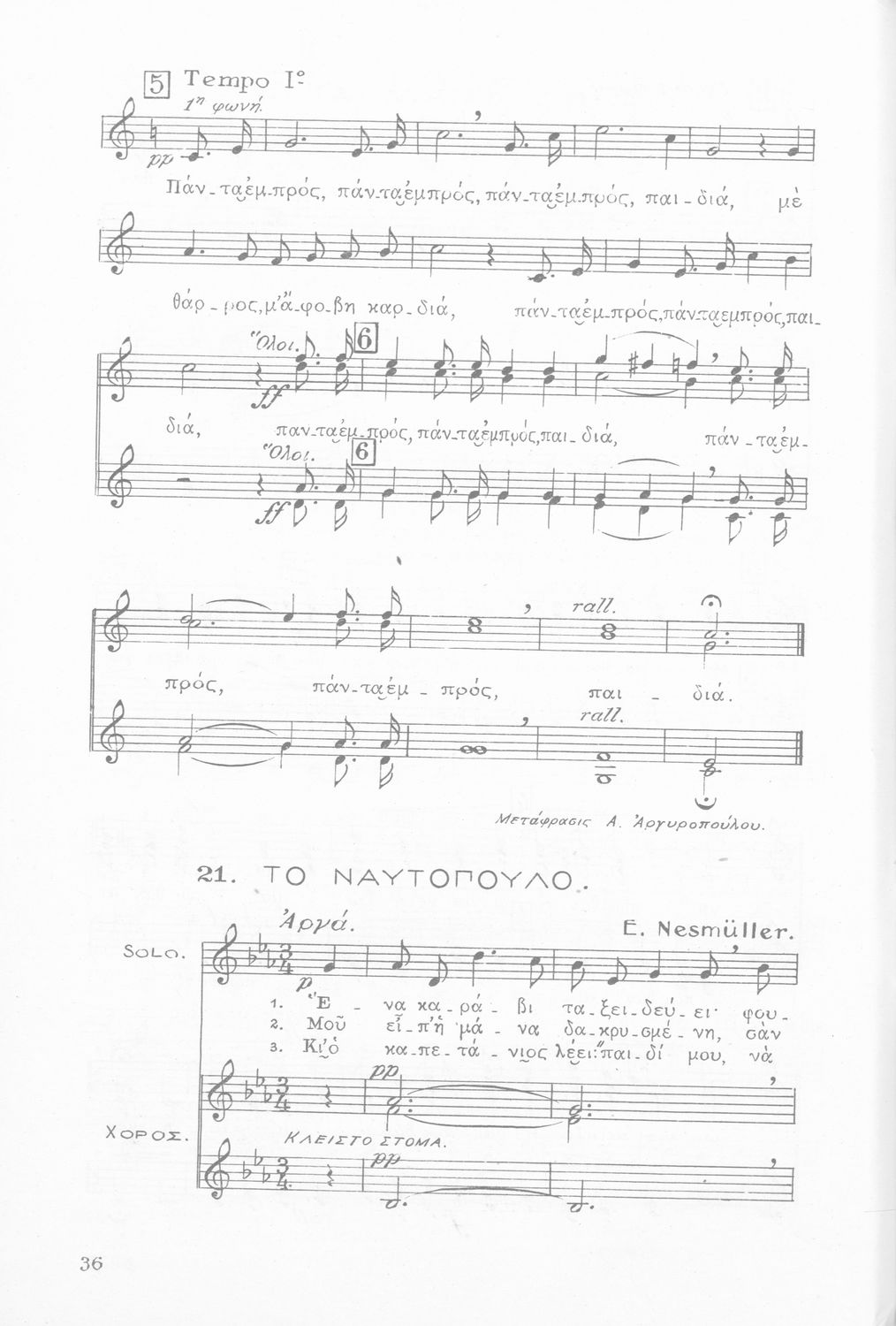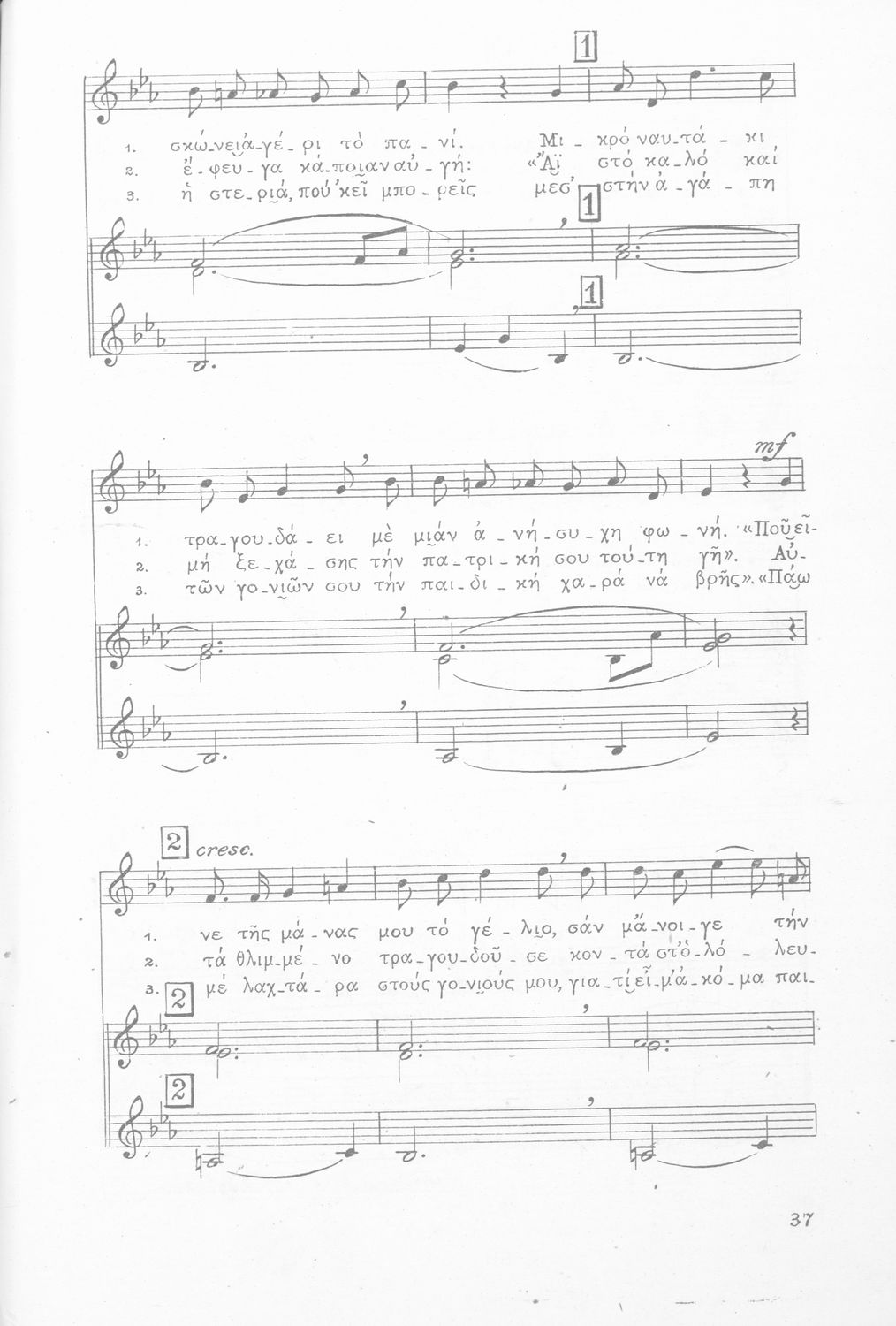 Παρουσίαση περιεχομένου: Σχολικό εγχειρίδιο Μουσικής του 1937. Περιέχει σχολικά τραγούδια με θέματα από τη θρησκεία, την πατρίδα και τη ζωή.