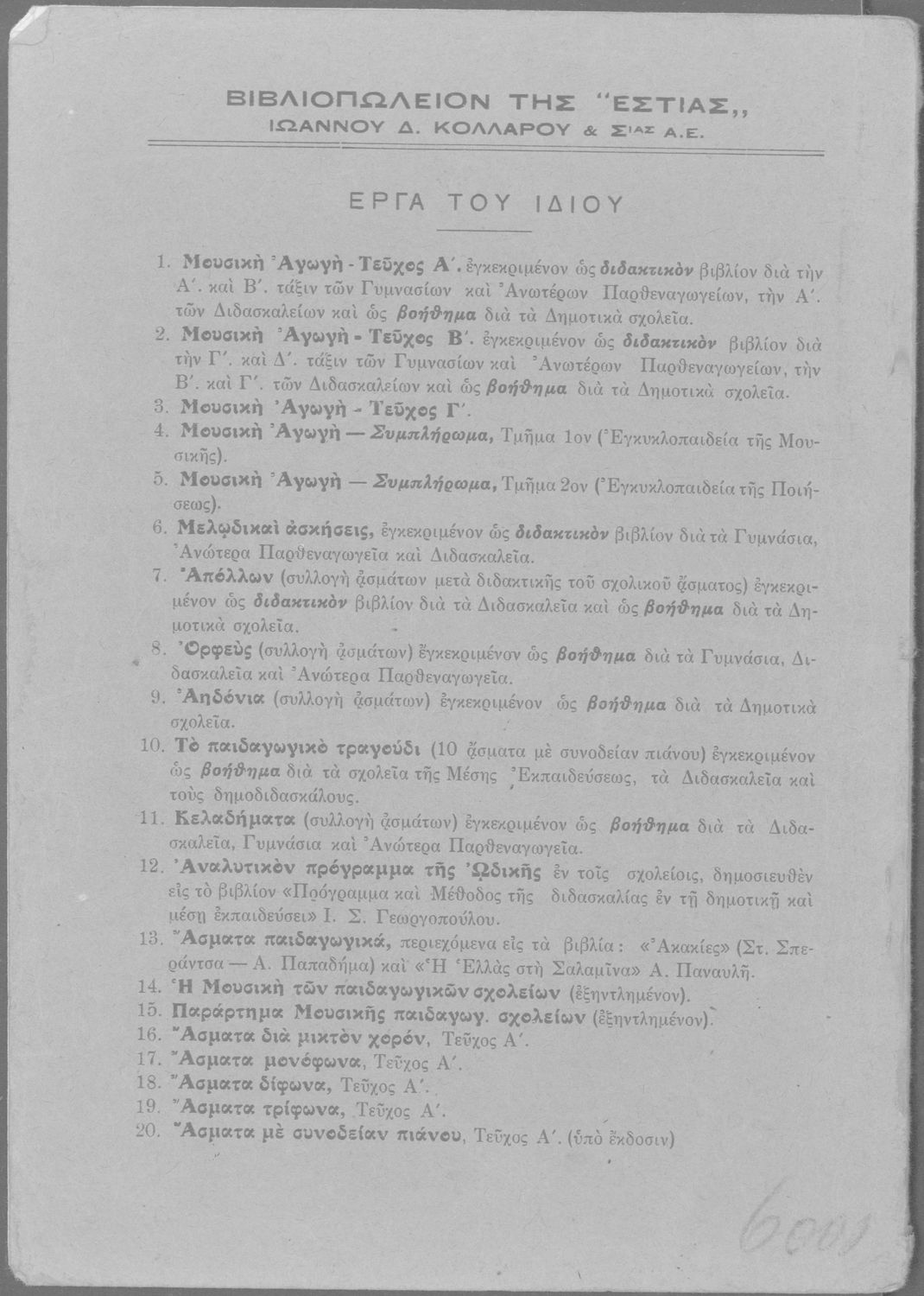 Σχολικό εγχειρίδιο Μουσικής για την Α', Β' Γυμνασίου, Ανώτερων Παρθεναγωγείων και Α΄ τάξη Διδασκαλείων. Σύστημα διδασκαλίας της Μουσικής με σχετική εγκυκλοπαίδεια σε τρία τεύχη. Ο συγγραφέας υπήρξε καθηγητής ...