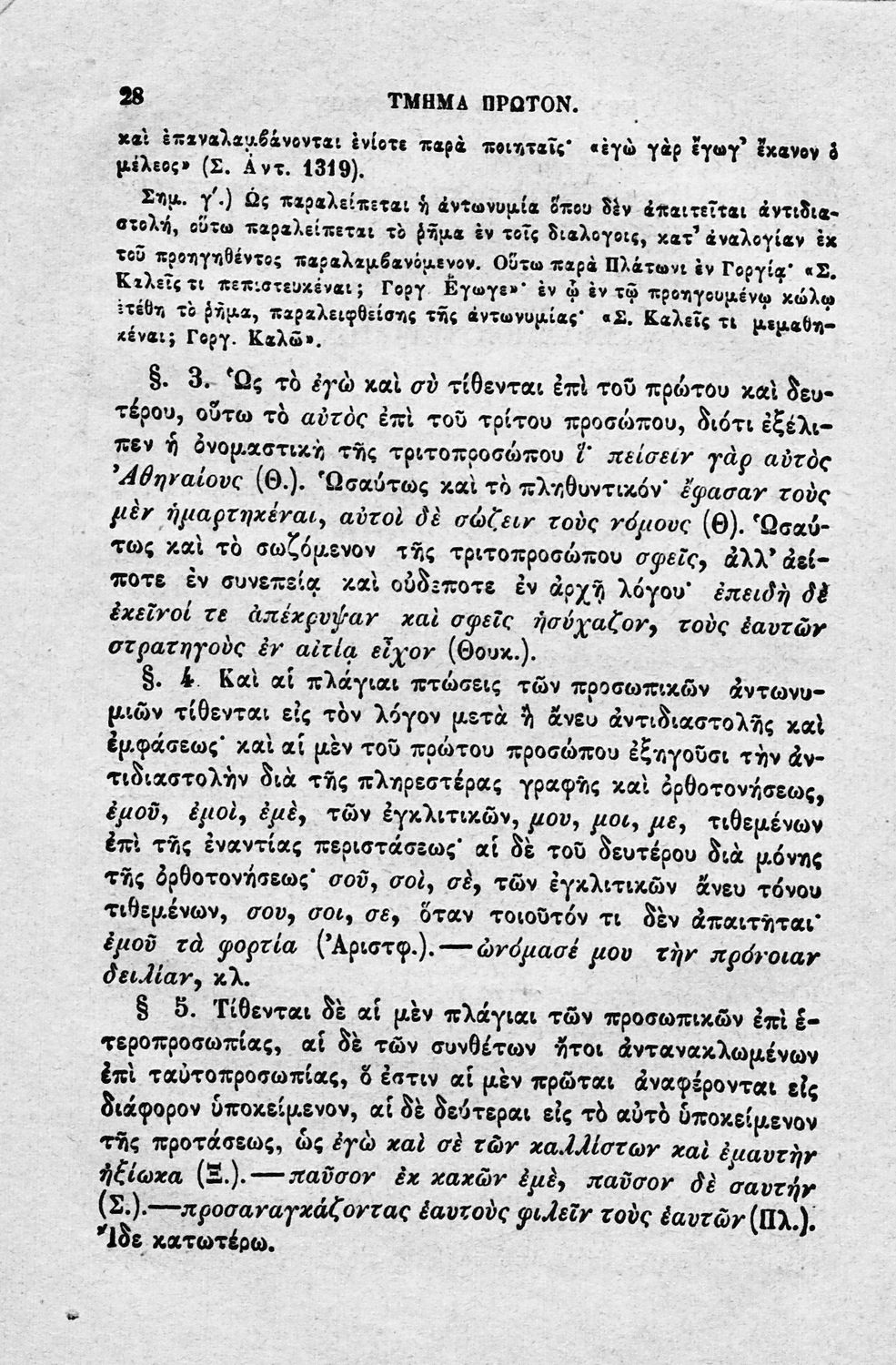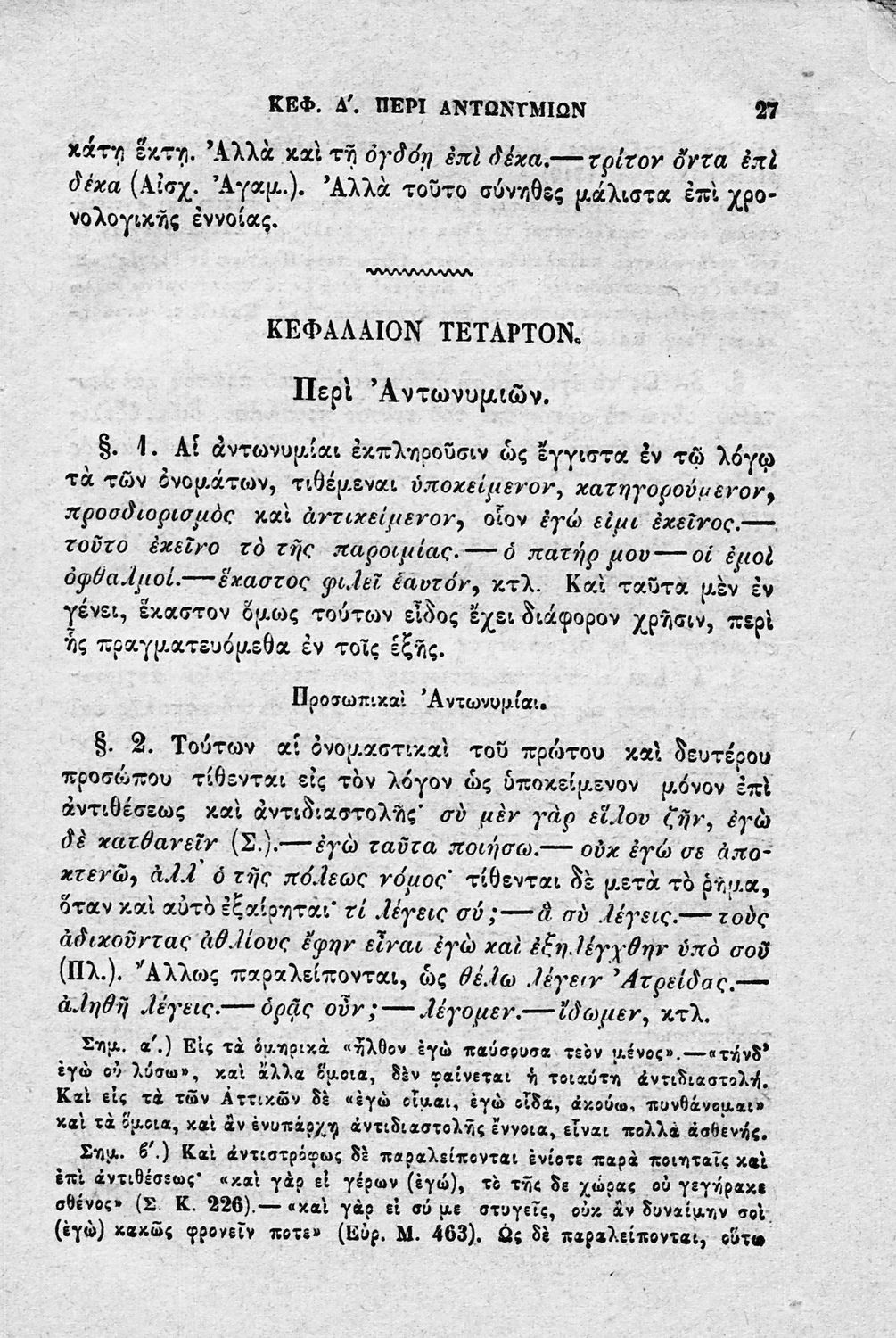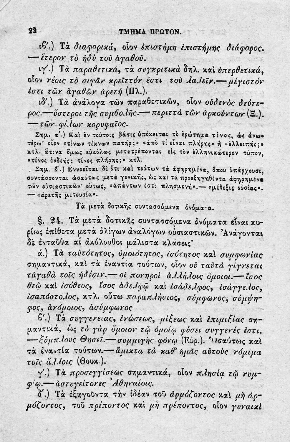 Σχολικό εγχειρίδιο Αρχαίων Ελληνικών για τα Ελληνικά Σχολεία, Παρθεναγωγεία και Γυμνάσια που περιέχει τους κανόνες γραμματικής και είναι χωρισμένο σε φθογγολογικό, τυπολογικό και ετυμολογικό μέρος.