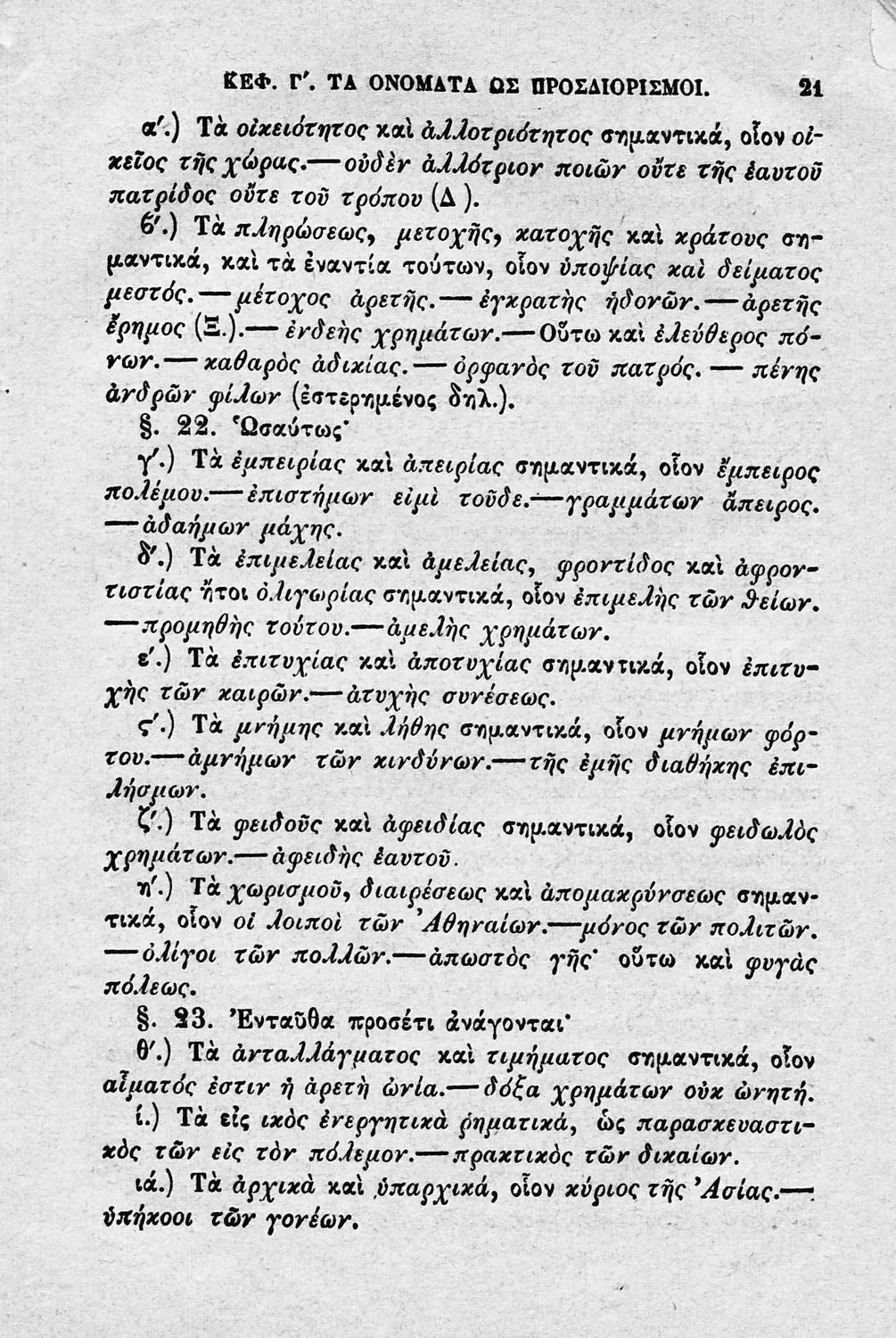 Μαθητικό βοήθημα Αρχαίων Ελληνικών για τα Ελληνικά Σχολεία, Παρθεναγωγεία και Γυμνάσια που περιλαμβάνει γραμματική της αρχαίας ελληνικής και κατάλογο ανωμάλων ρημάτων.