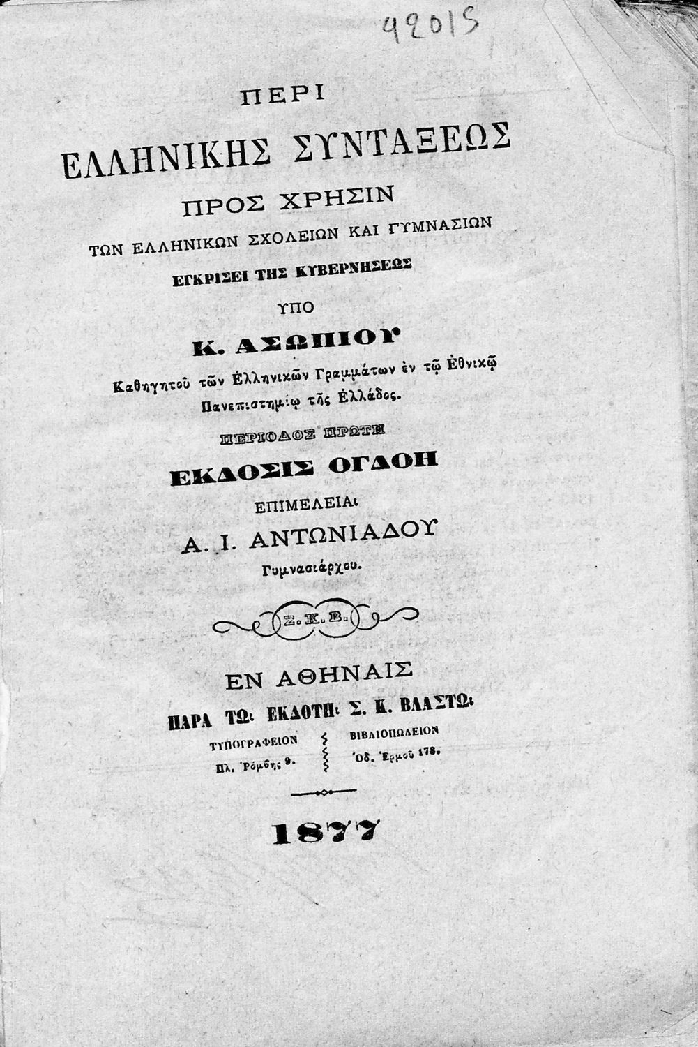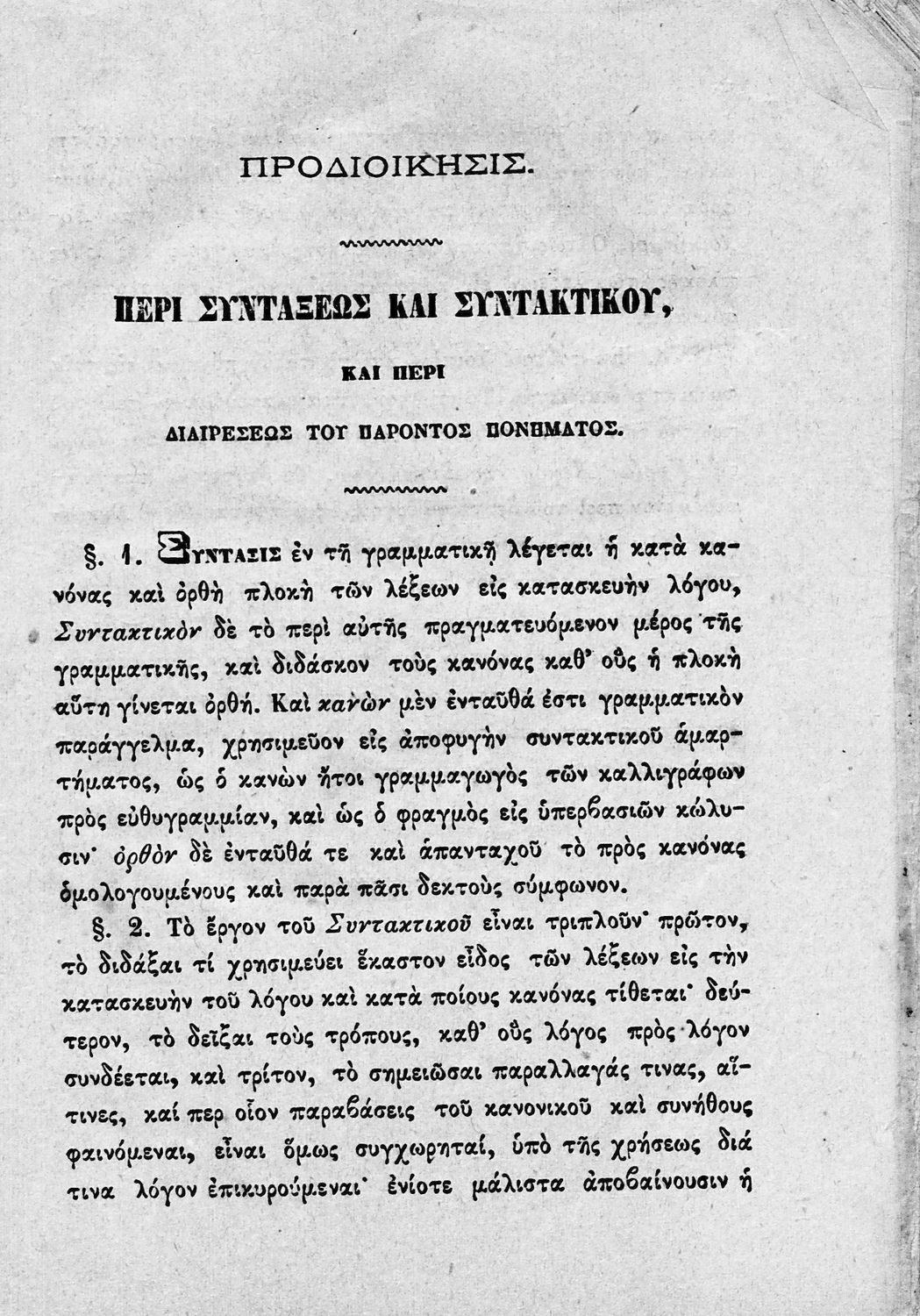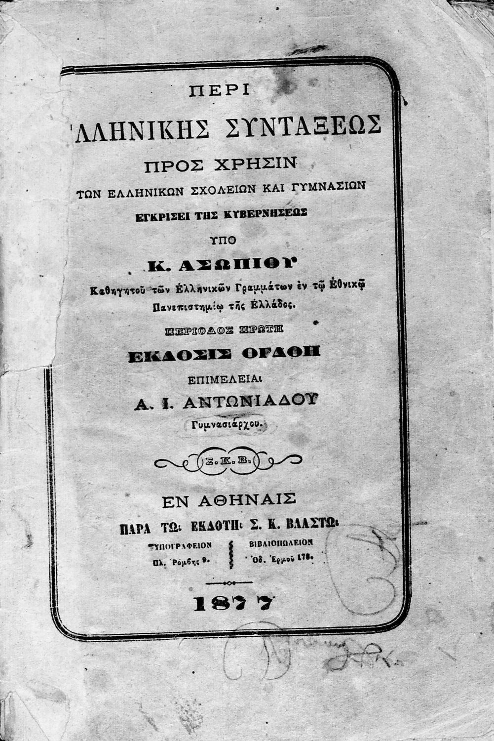Τίτλος: Περί Ελληνικής Συντάξεως προς χρήσιν των Ελληνικών Σχολείων και Γυμνασίων
