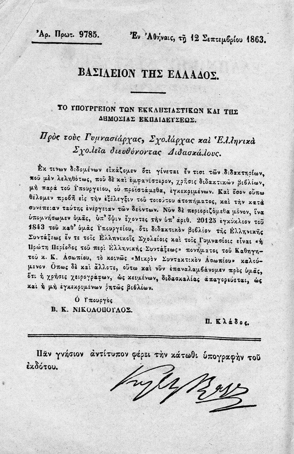 Σχολικό εγχειρίδιο Αρχαίων Ελληνικών για τα Ελληνικά Σχολεία, Παρθεναγωγεία και Γυμνάσια που περιέχει τους κανόνες γραμματικής και είναι χωρισμένο σε φθογγολογικό, τυπολογικό και ετυμολογικό μέρος.
