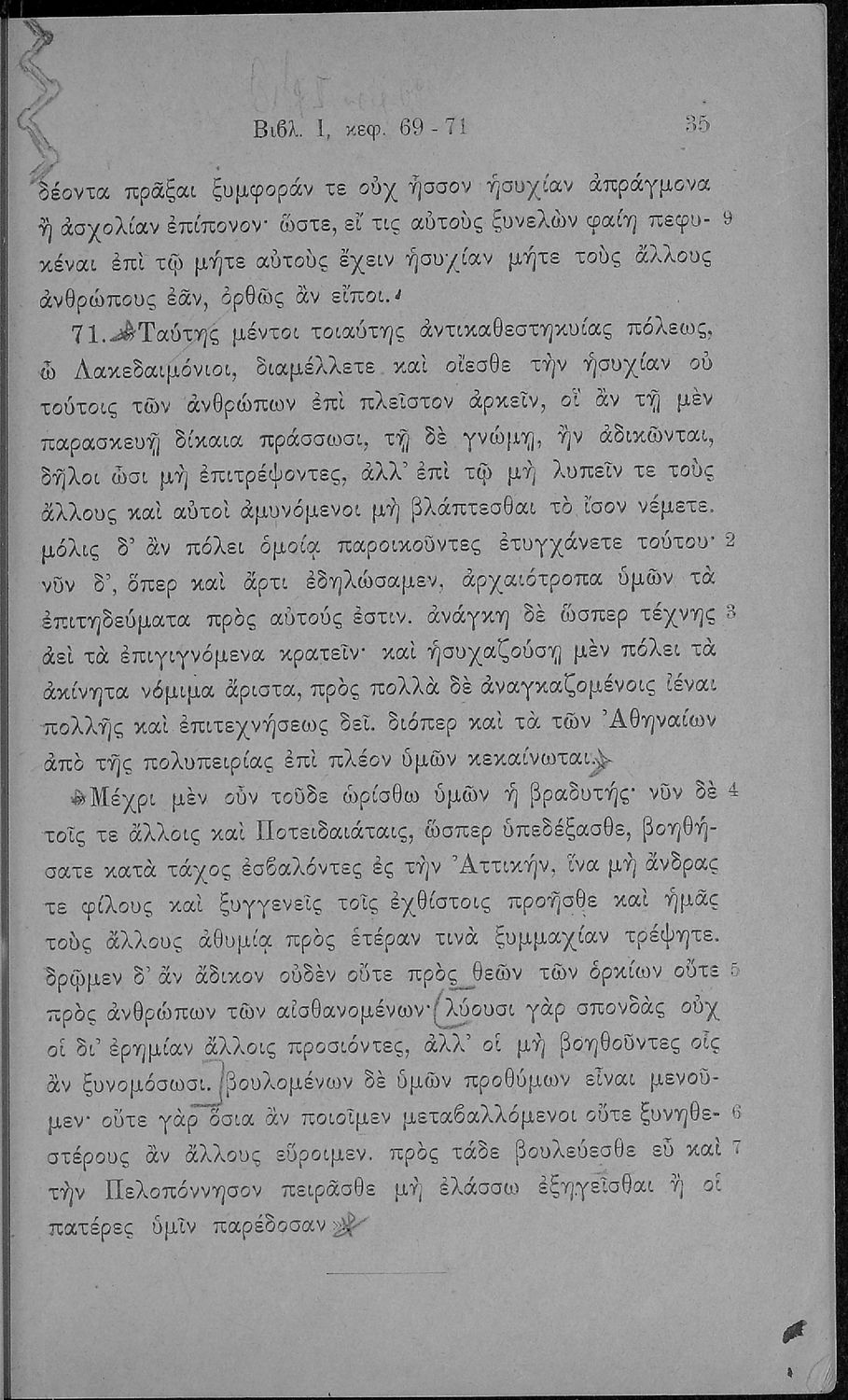 Σχολικό εγχειρίδιο Αρχαίων Ελληνικών Β΄ και Γ΄ Γυμνασίου που περιλαμβάνει εισαγωγή στη ζωή και το έργο του Θουκυδίδη, αποσπάσματα από το πρώτο βιβλίο της Ιστορίας, και ερμηνευτικά, πραγματολογικά και γλωσσικά ...