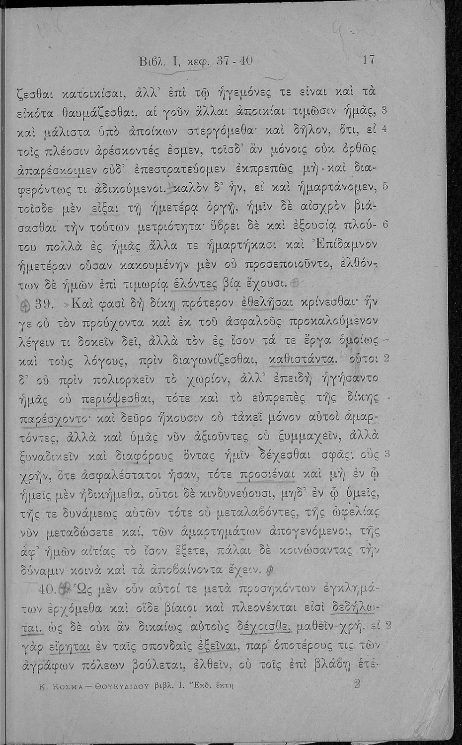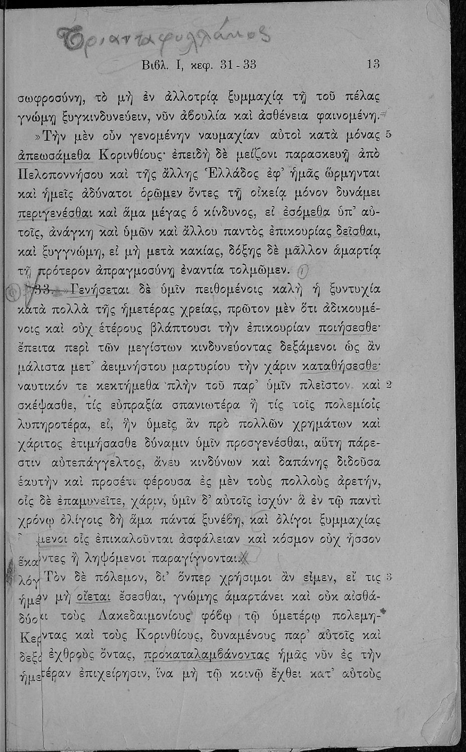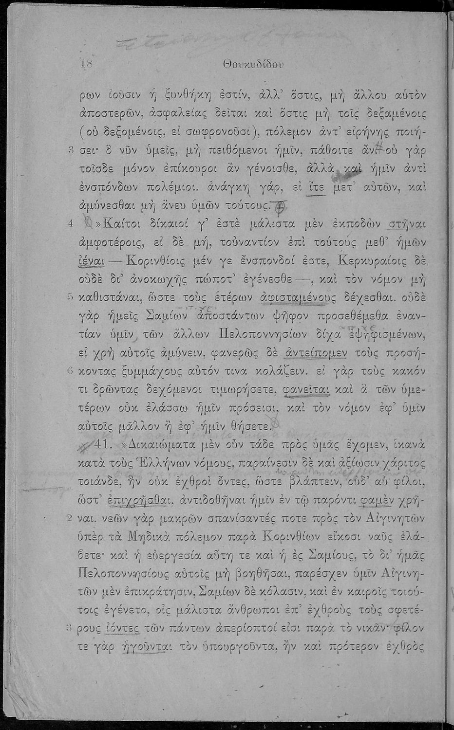 Σχολικό εγχειρίδιο Αρχαίων Ελληνικών Β΄ και Γ΄ Γυμνασίου που περιέχει αποσπάσματα από το έργο του Θουκυδίδη Ιστορία, και με ερμηνευτικές και πραγματολογικές παρατηρήσεις.