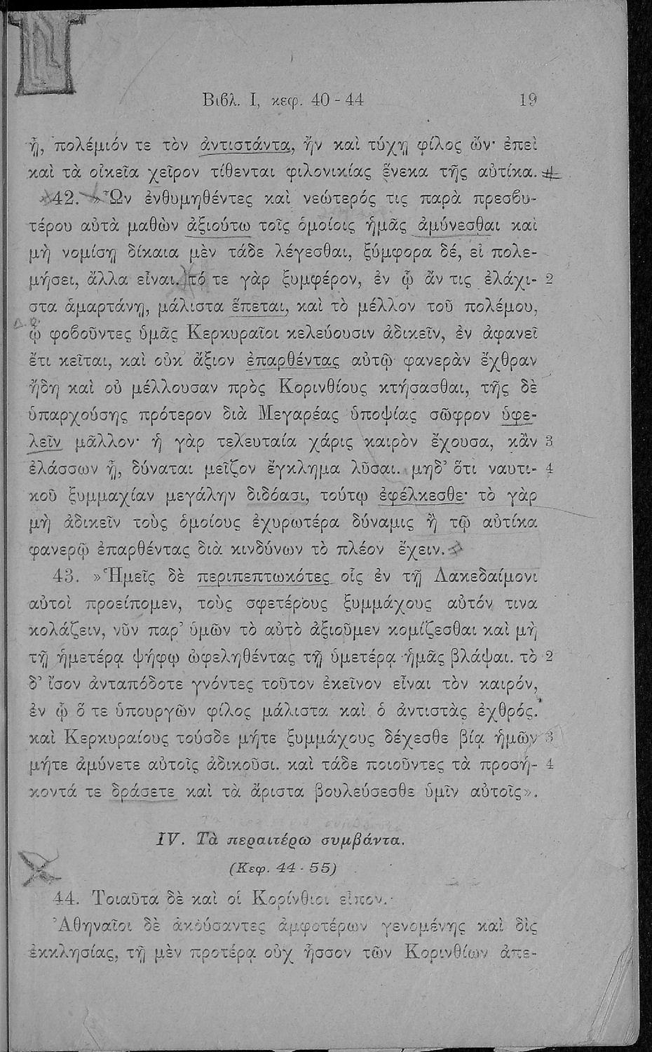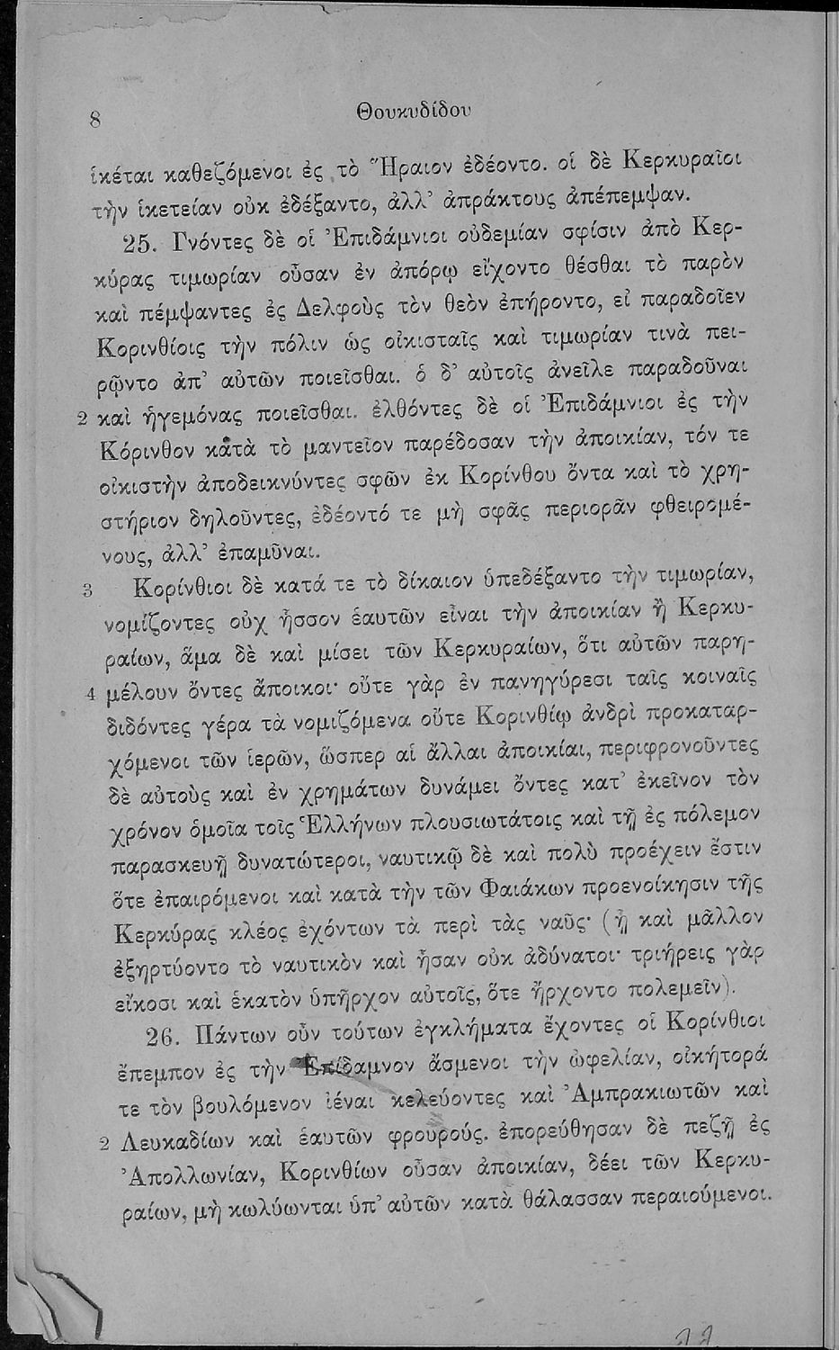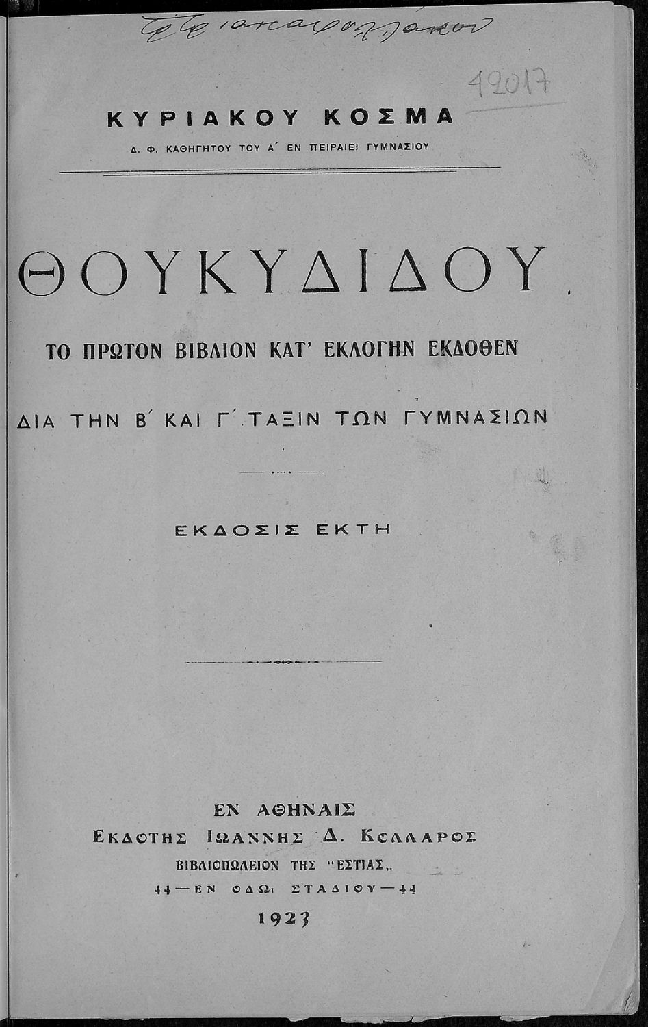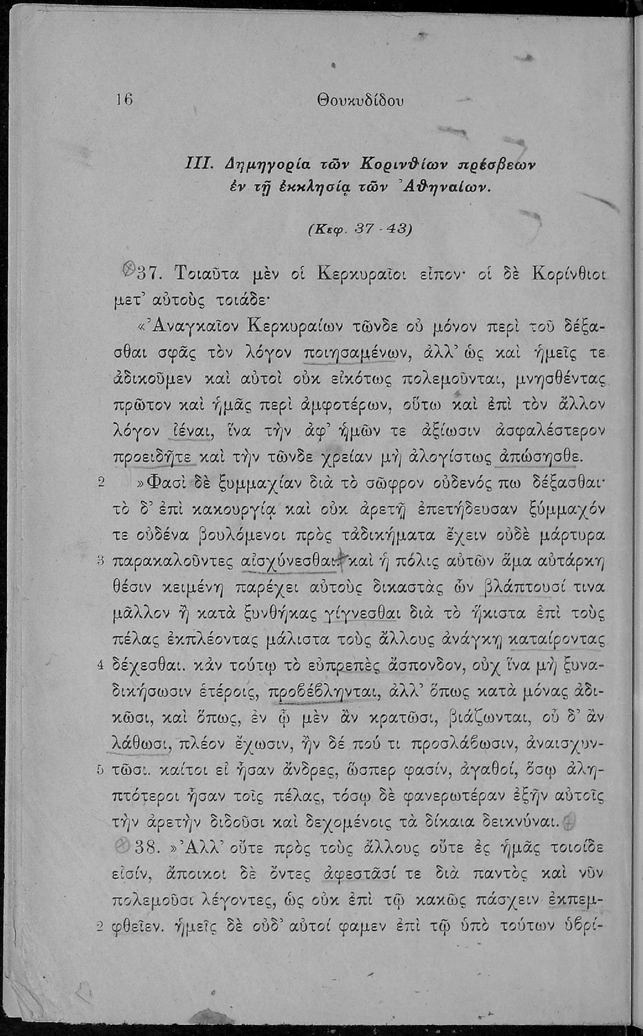 Σχολικό εγχειρίδιο Αρχαίων Ελληνικών Β΄ και Γ΄ Γυμνασίου που περιέχει αποσπάσματα από το έργο του Θουκυδίδη Ιστορία, και με ερμηνευτικές και πραγματολογικές παρατηρήσεις.