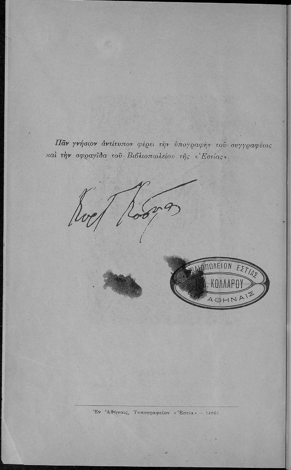 Εκδότης: Ιωάννης Δ. Κολλάρος, Βιβλιοπωλείο της "Εστίας" Έτος έκδοσης: 1923 Τόπος έκδοσης: Αθήνα Έκδοση: 6η |