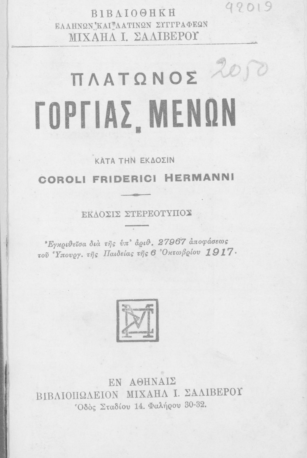 Έκδοση που περιλαμβάνει τα έργα του Πλάτωνα Γοργίας και Μένων κατά την έκδοση Coroli Friderici Hermanni.