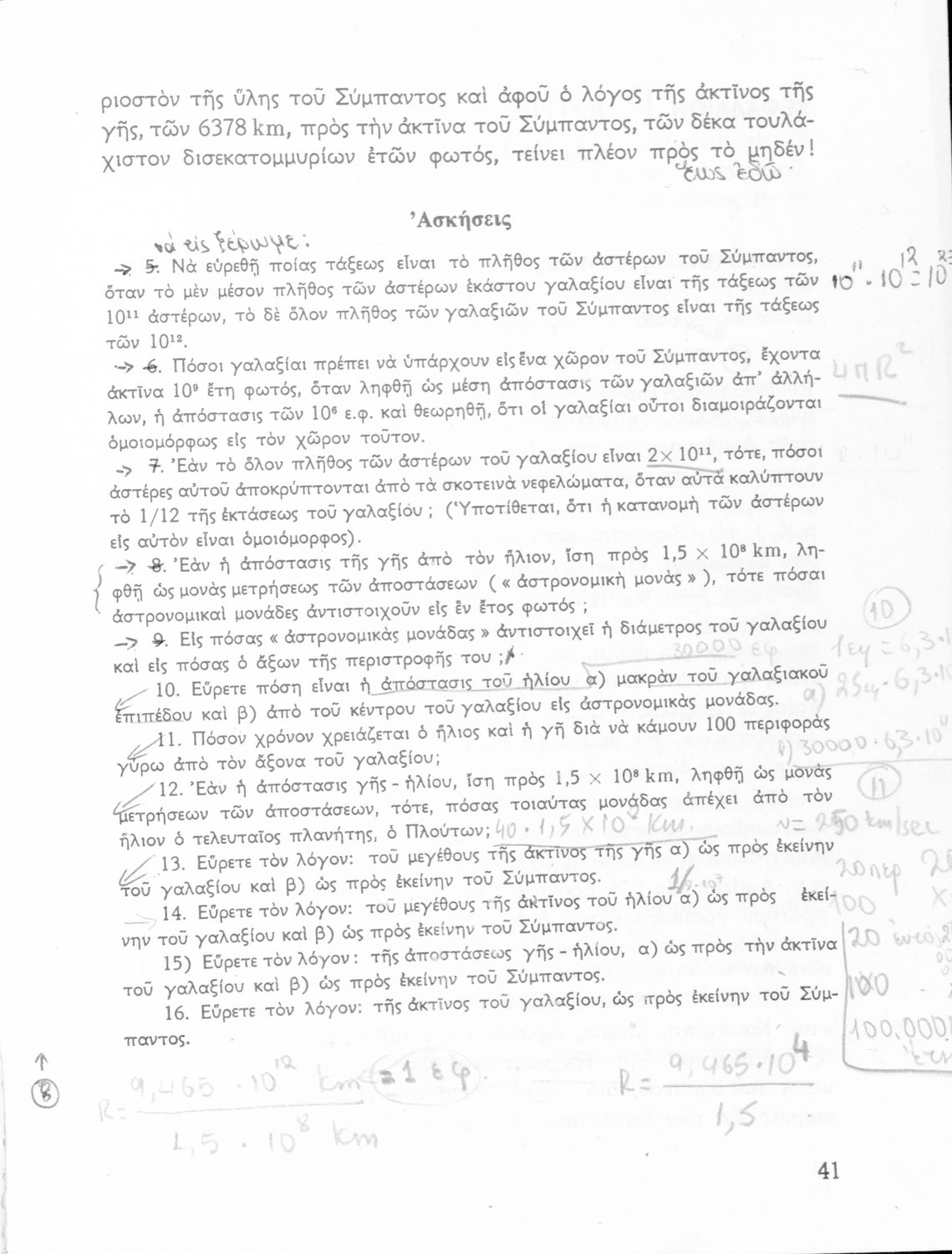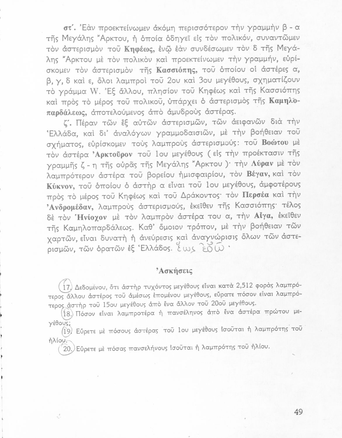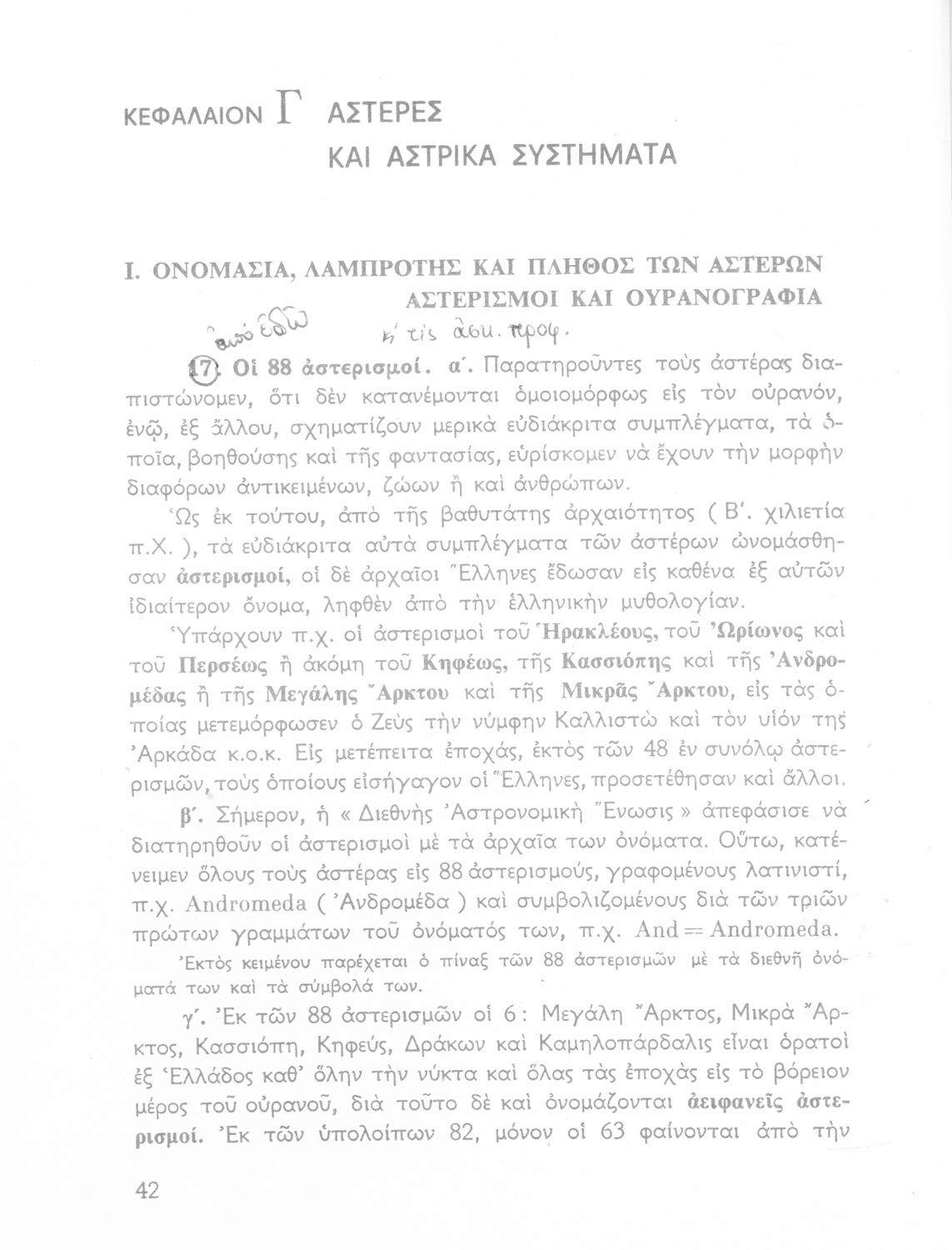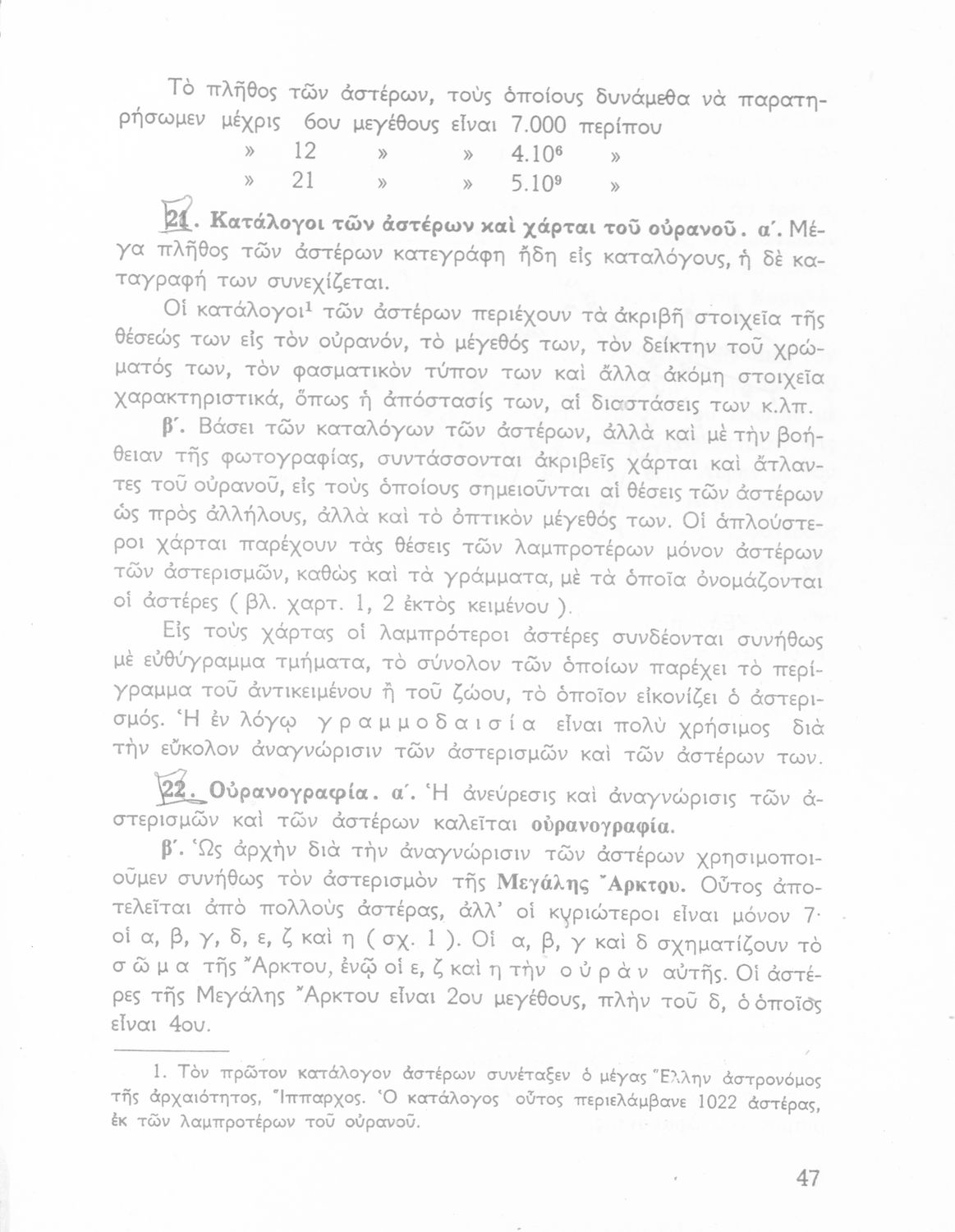 Σχολικό εγχειρίδιο Κοσμογραφίας ΣΤ΄ Γυμνασίου που πραγματεύεται τη μορφή, σύσταση, μέγεθος και κίνηση των γαλαξιών και των πλανητών. Περιέχει στοιχεία αστροναυτικής και πίνακα με 88 αστερισμούς, τα διεθνή ονόματα και τα σύμβολά τους.