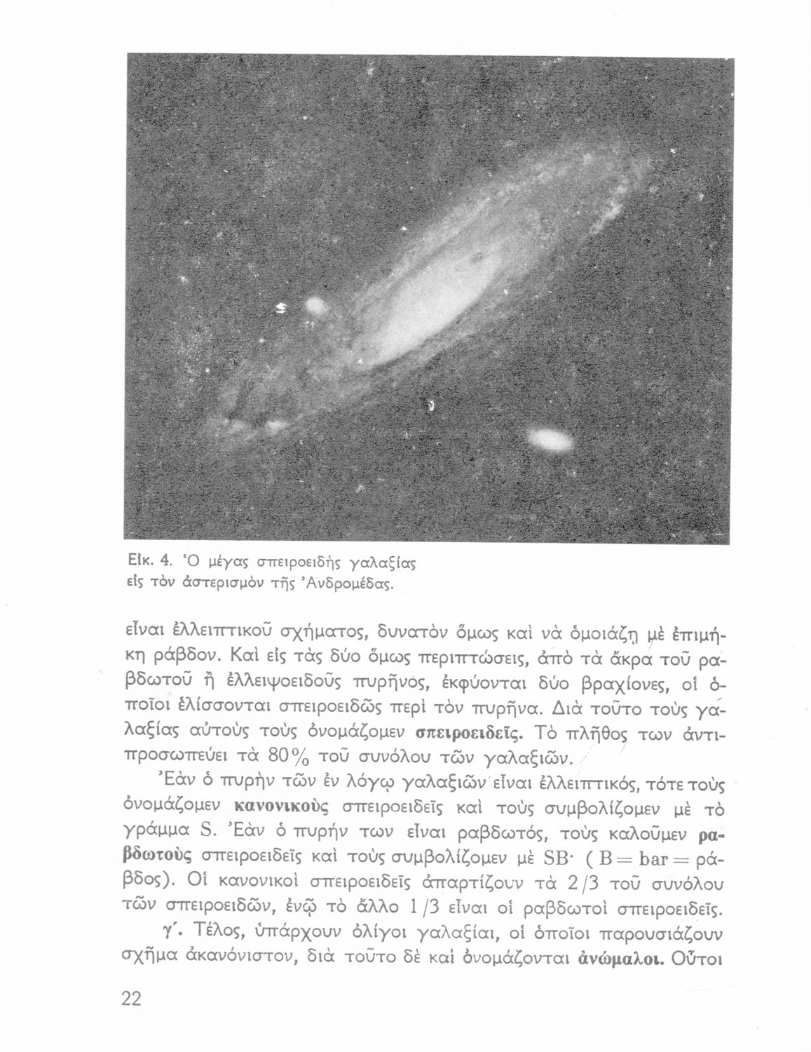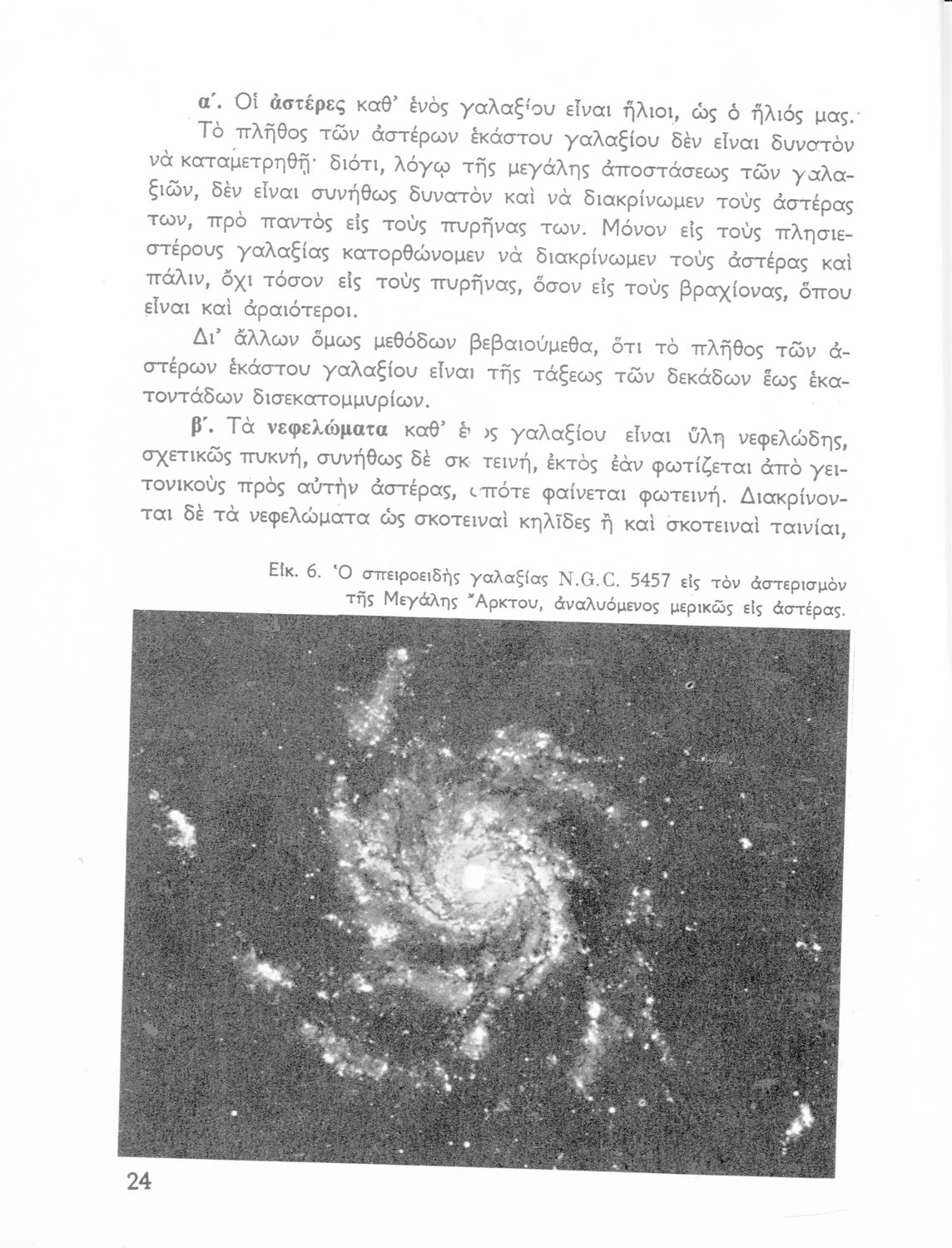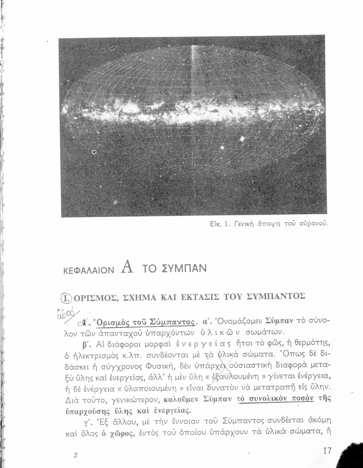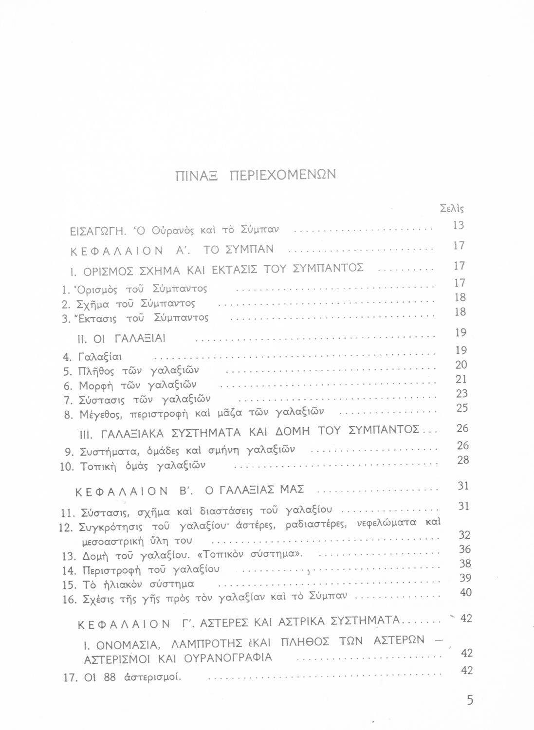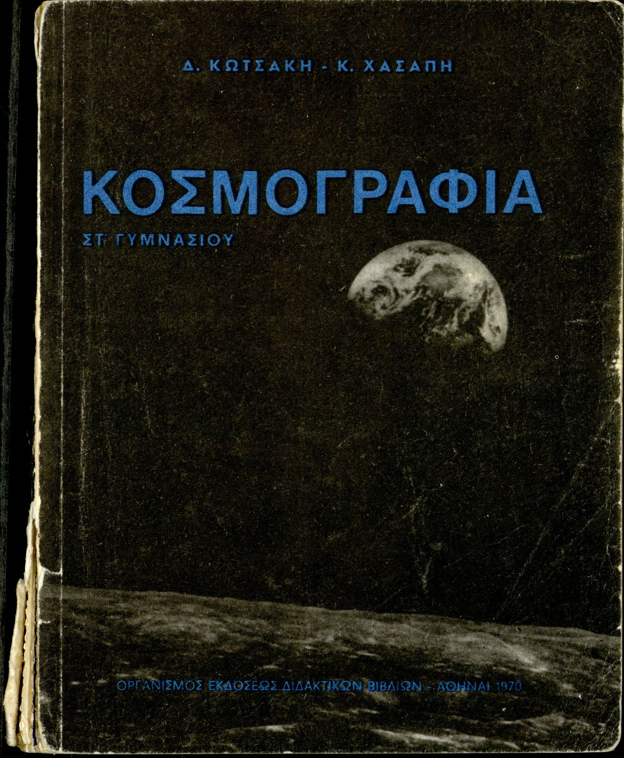 Σχολικό εγχειρίδιο Κοσμογραφίας ΣΤ΄ Γυμνασίου που πραγματεύεται τη μορφή, σύσταση, μέγεθος και κίνηση των γαλαξιών και των πλανητών. Περιέχει στοιχεία αστροναυτικής και πίνακα με 88 αστερισμούς, τα διεθνή ονόματα και τα σύμβολά τους.