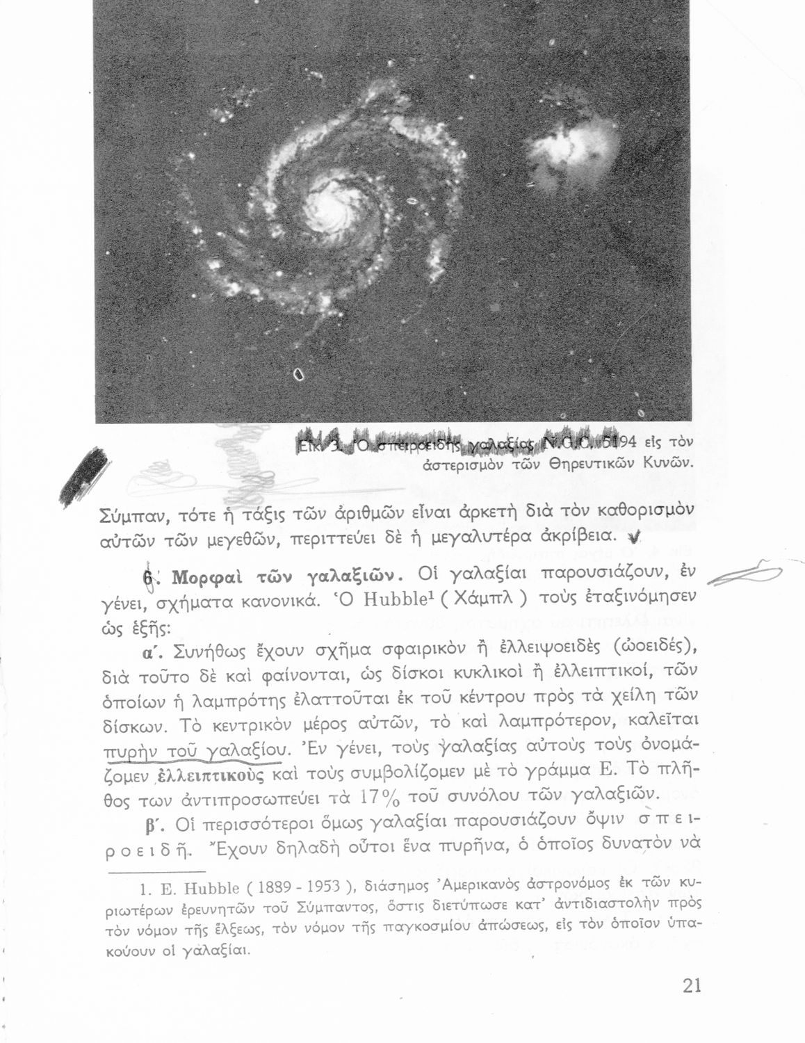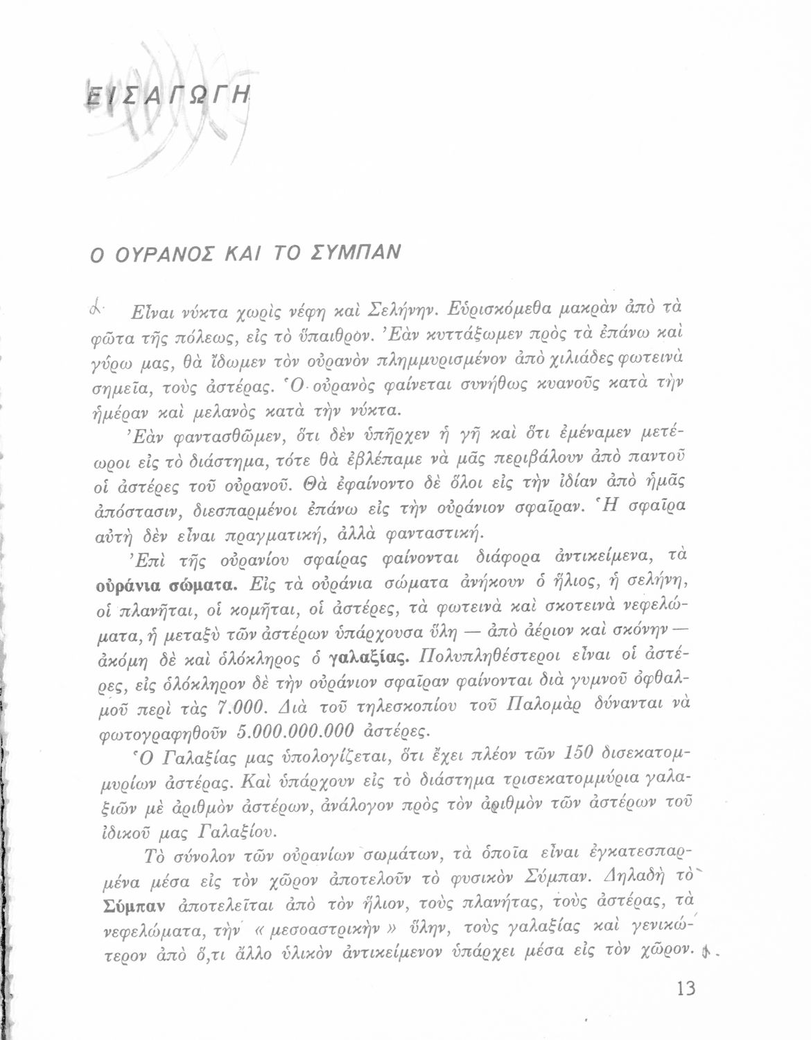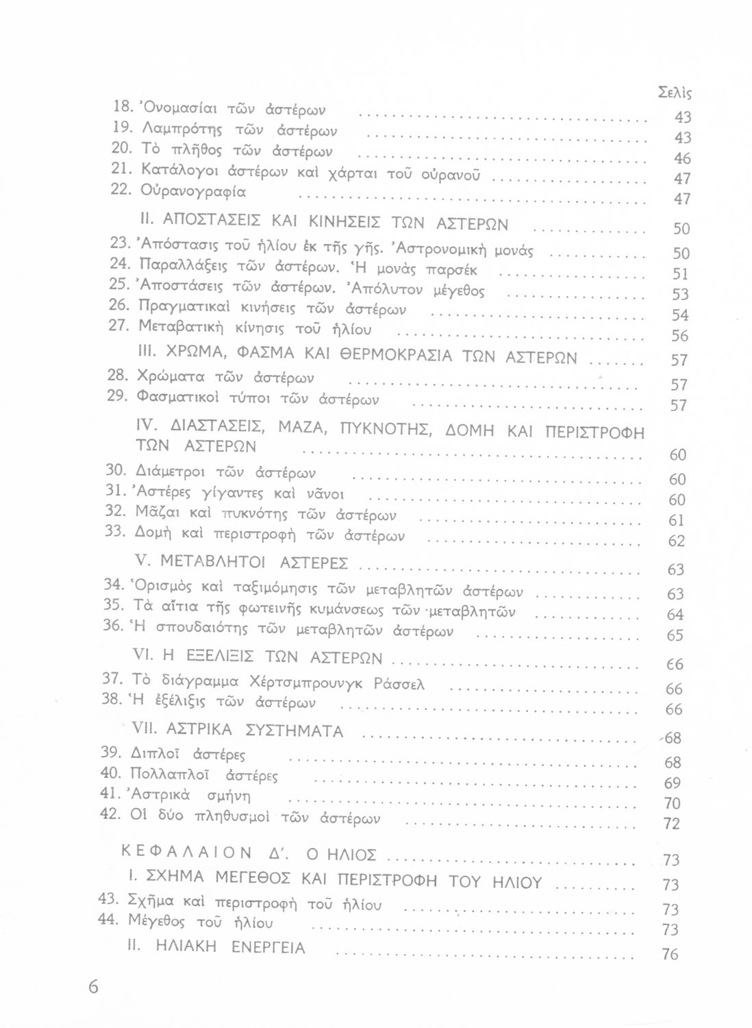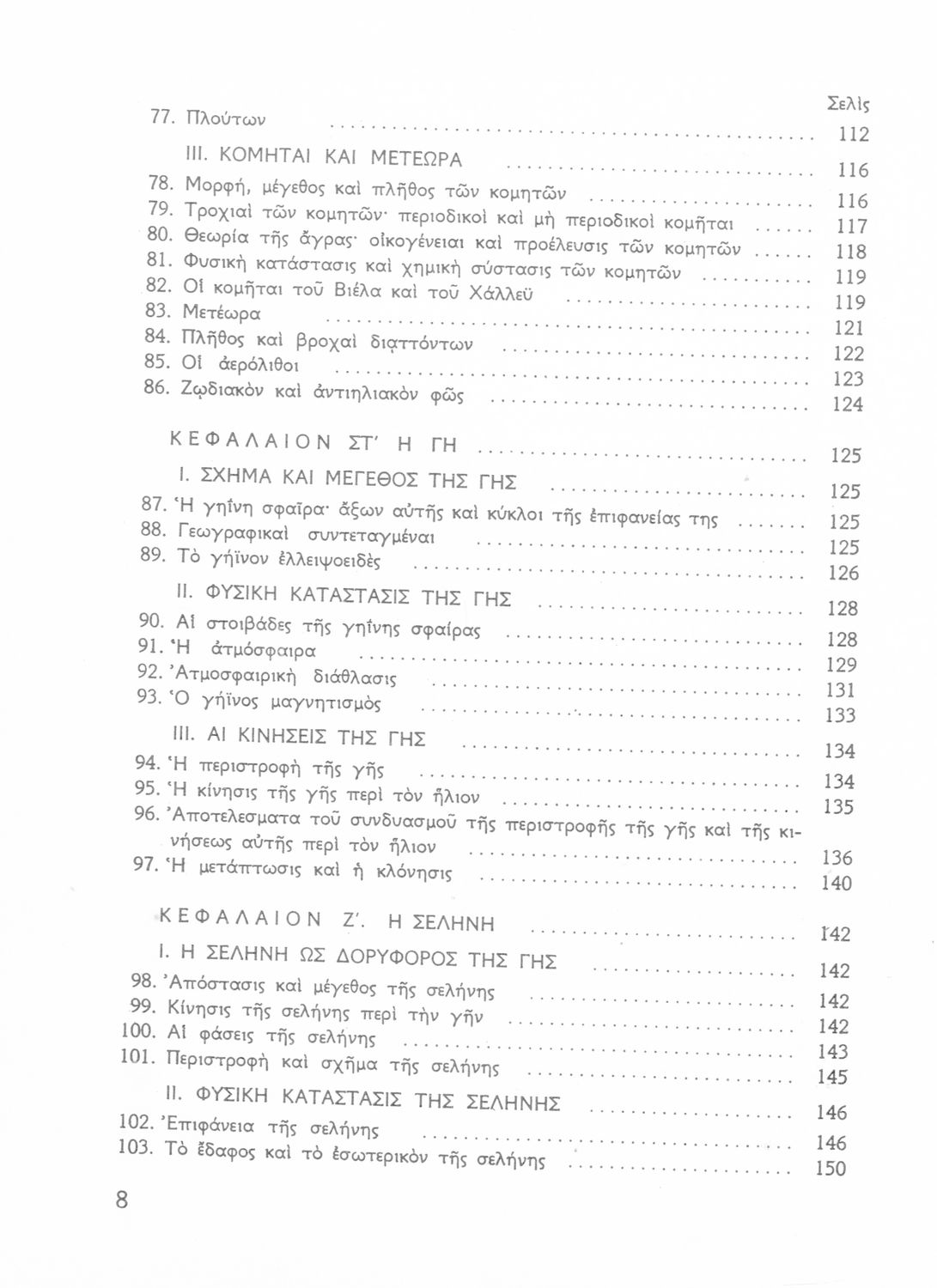 Σχολικό εγχειρίδιο Κοσμογραφίας ΣΤ΄ Γυμνασίου που πραγματεύεται τη μορφή, σύσταση, μέγεθος και κίνηση των γαλαξιών και των πλανητών. Περιέχει στοιχεία αστροναυτικής και πίνακα με 88 αστερισμούς, τα διεθνή ονόματα και τα σύμβολά τους.
