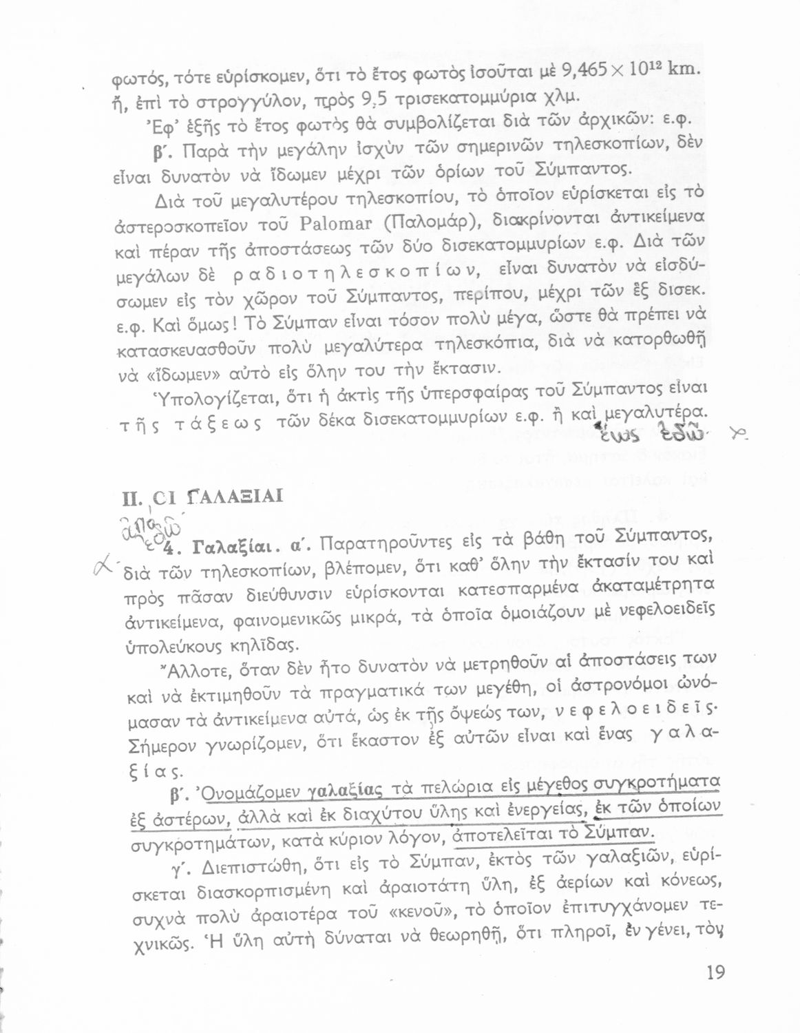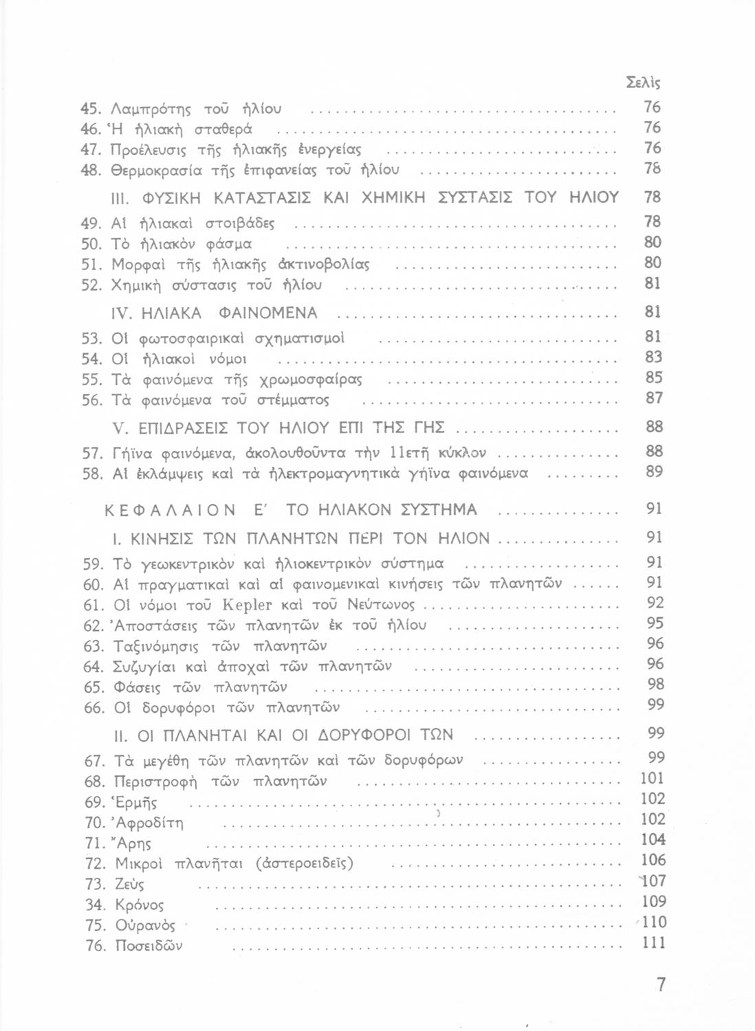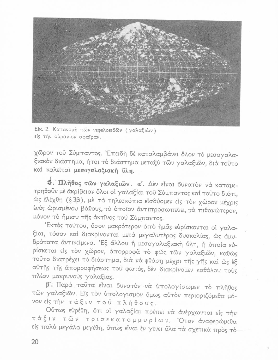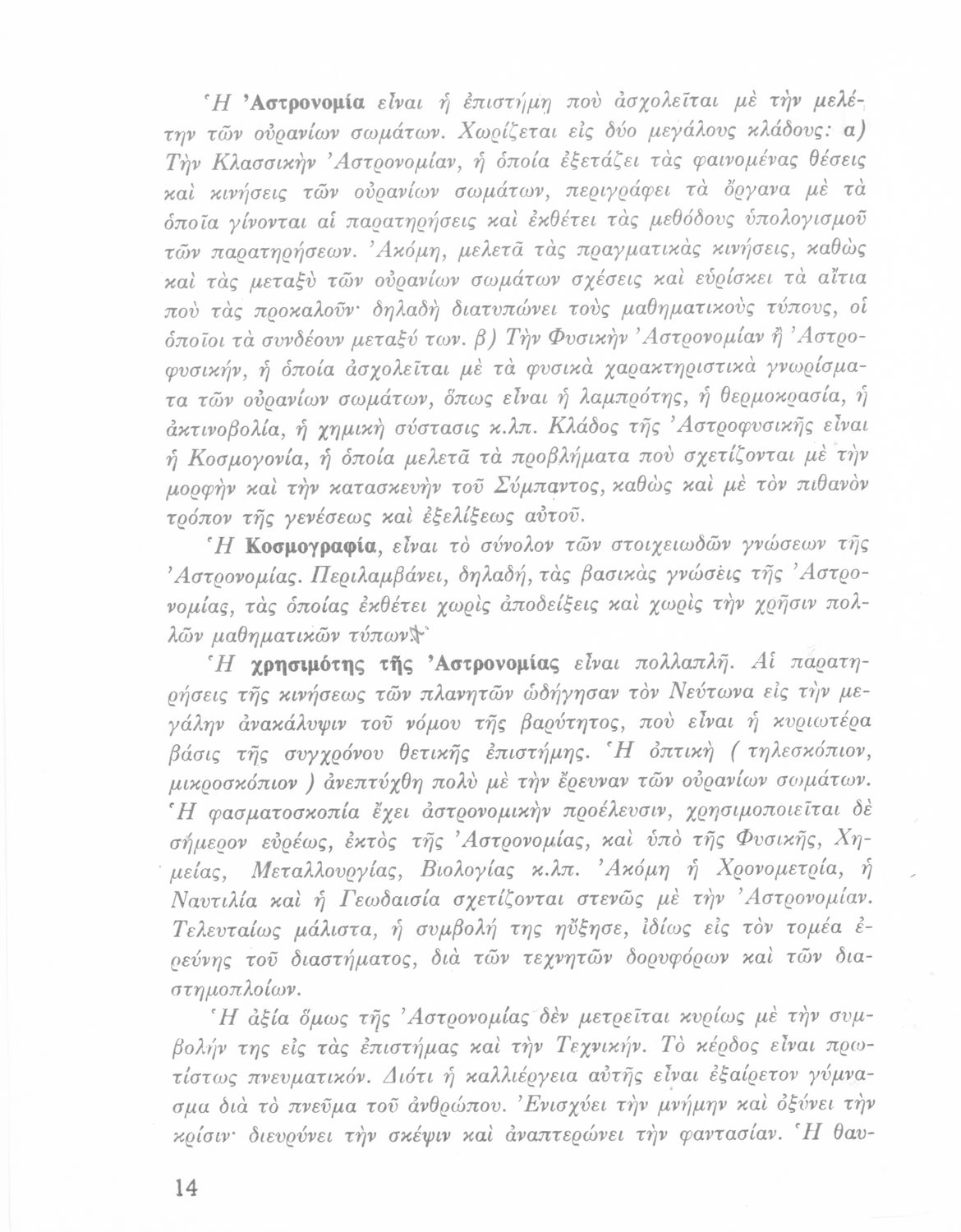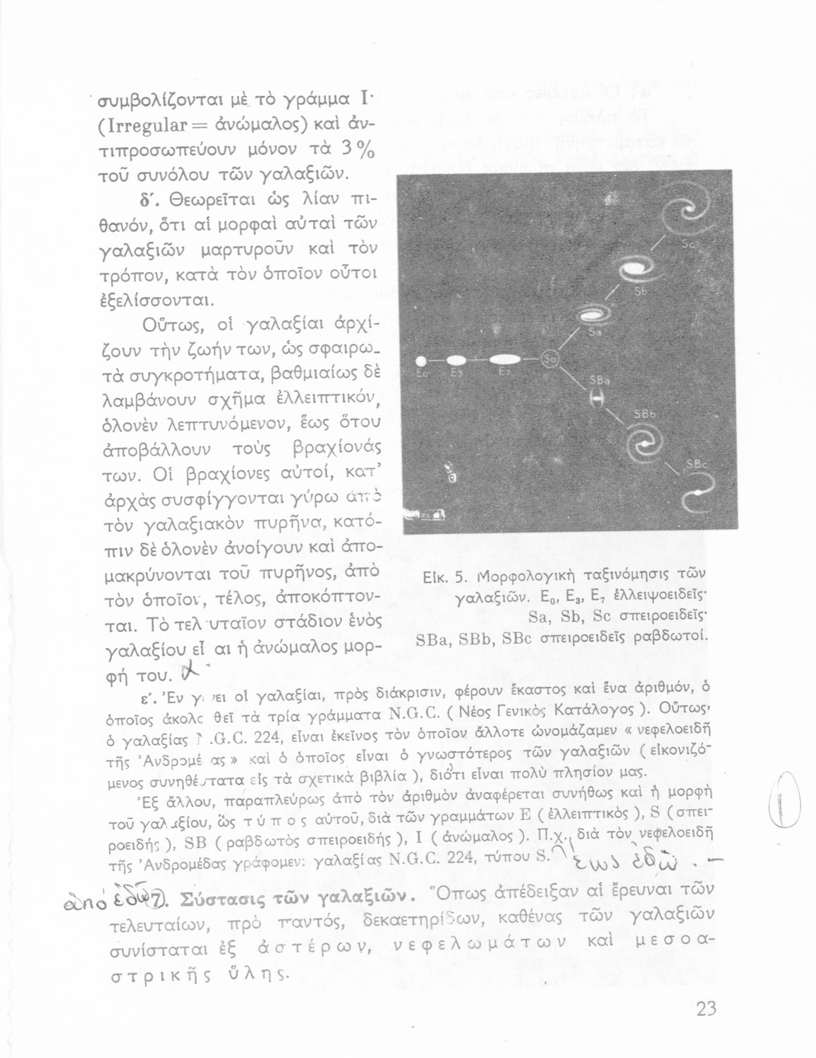 Σχολικό εγχειρίδιο Κοσμογραφίας ΣΤ΄ Γυμνασίου που πραγματεύεται τη μορφή, σύσταση, μέγεθος και κίνηση των γαλαξιών και των πλανητών. Περιέχει στοιχεία αστροναυτικής και πίνακα με 88 αστερισμούς, τα διεθνή ονόματα και τα σύμβολά τους.